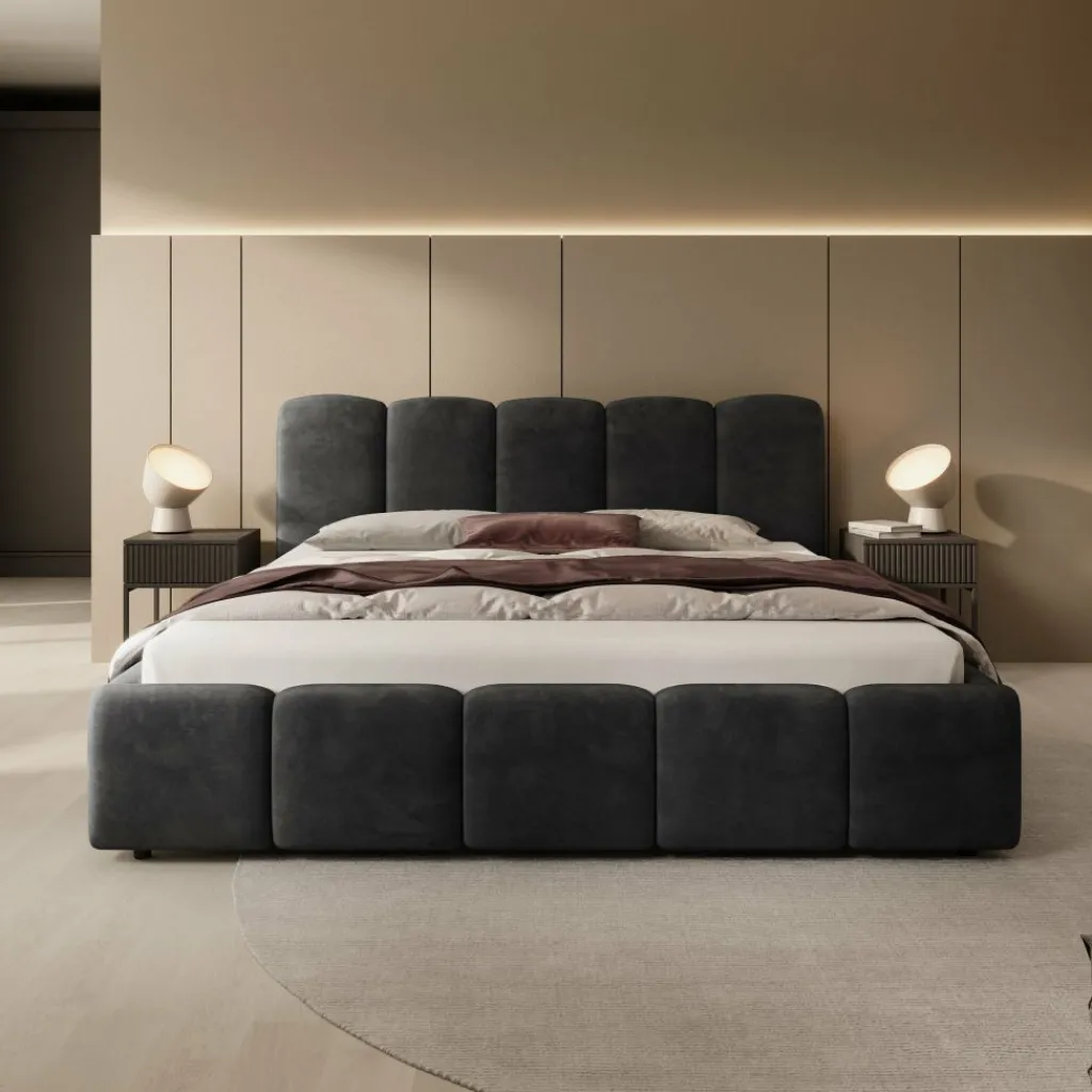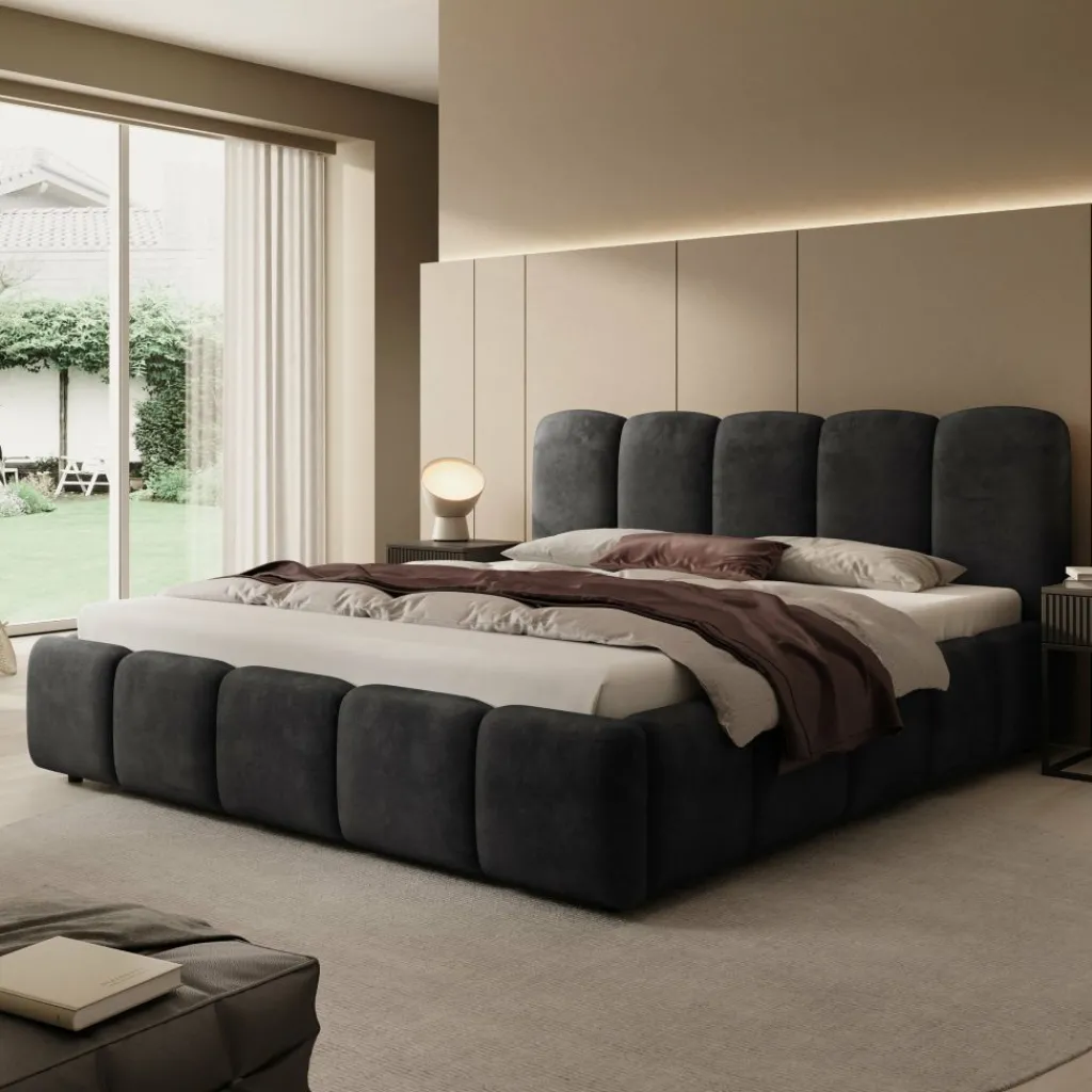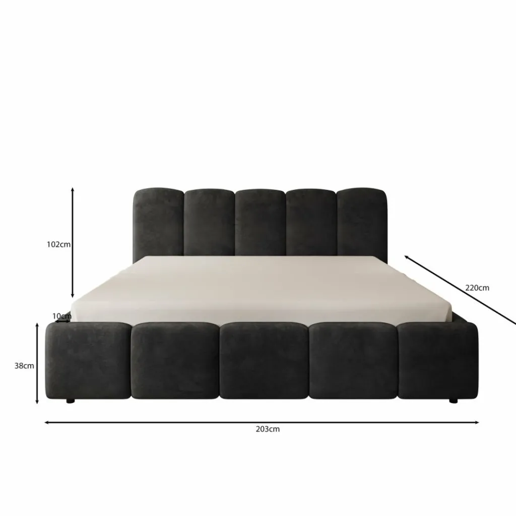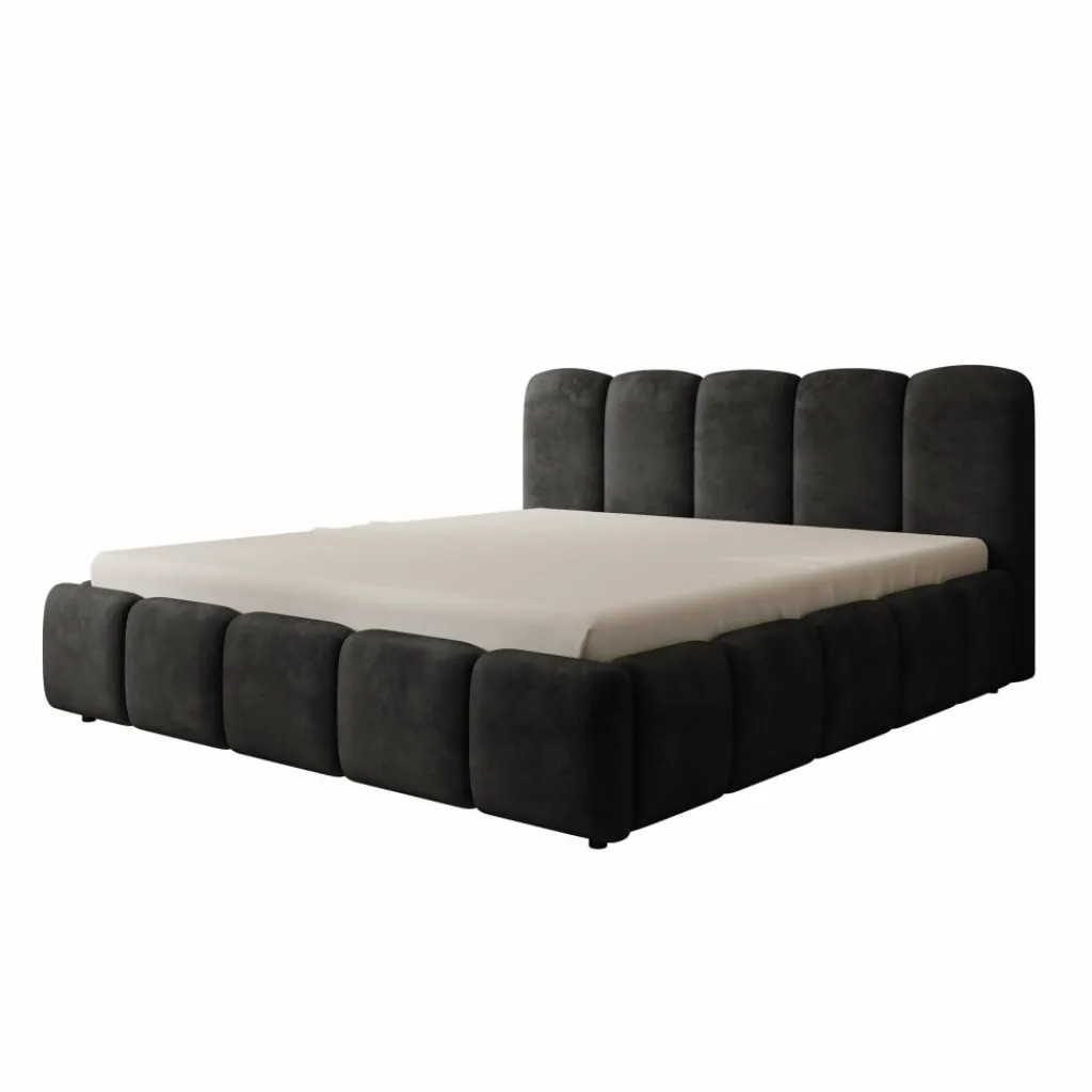 Tweepersoonsbed Nolena is bekleed met zwarte velvet stof en heeft een opvallend design met afgeronde vormen. Het hoofdbord en het bedframe zijn rondom voorzien van brede, gewatteerde panelen die zorgen voor een volle uitstraling.