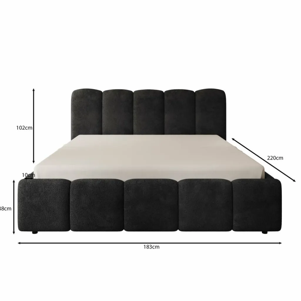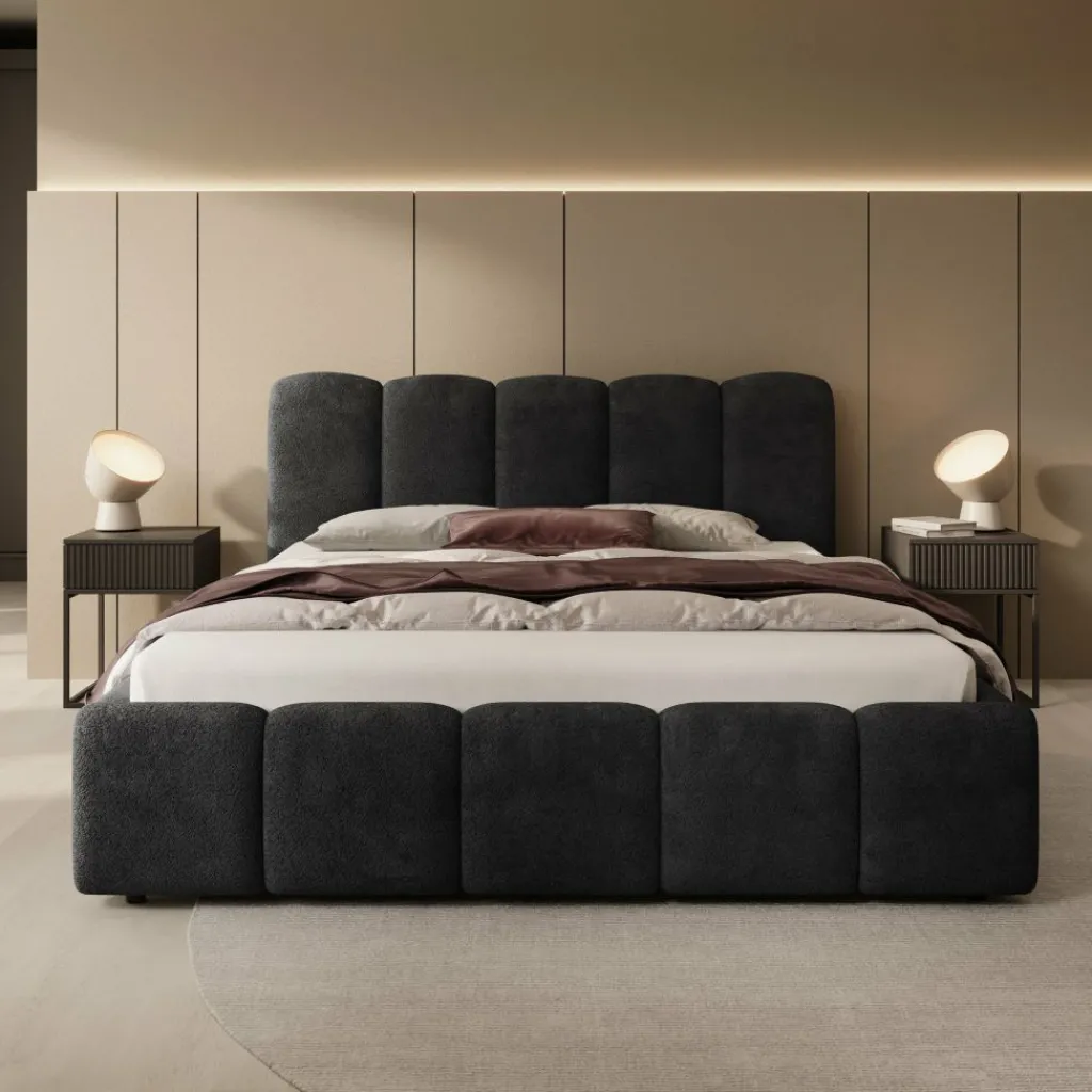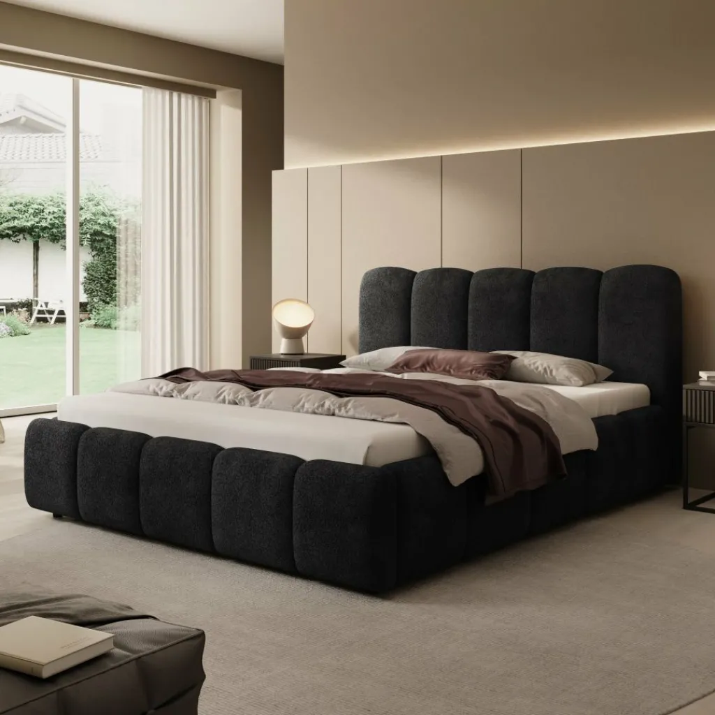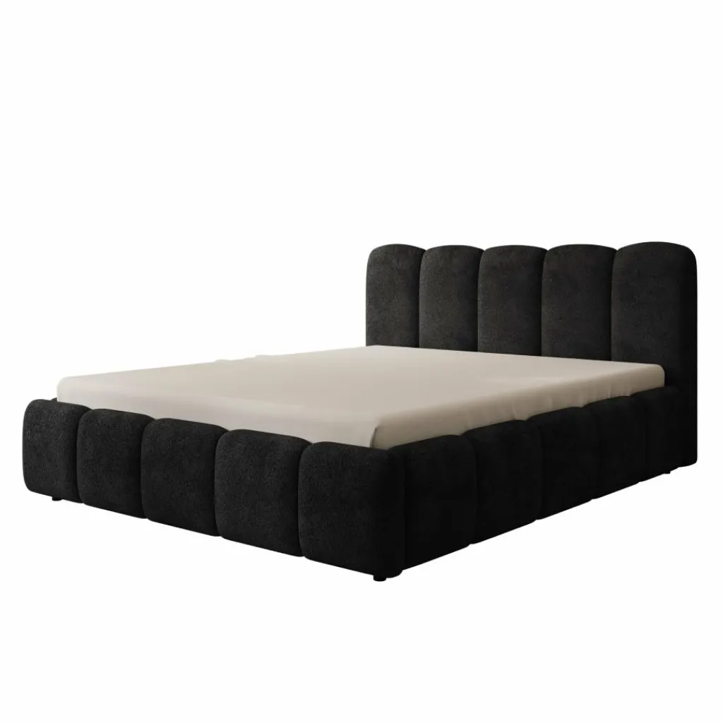 Tweepersoonsbed Nolena is bekleed met zwarte velvet stof en heeft een opvallend design met afgeronde vormen. Het hoofdbord en het bedframe zijn rondom voorzien van brede, gewatteerde panelen die zorgen voor een volle uitstraling.