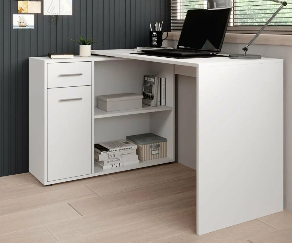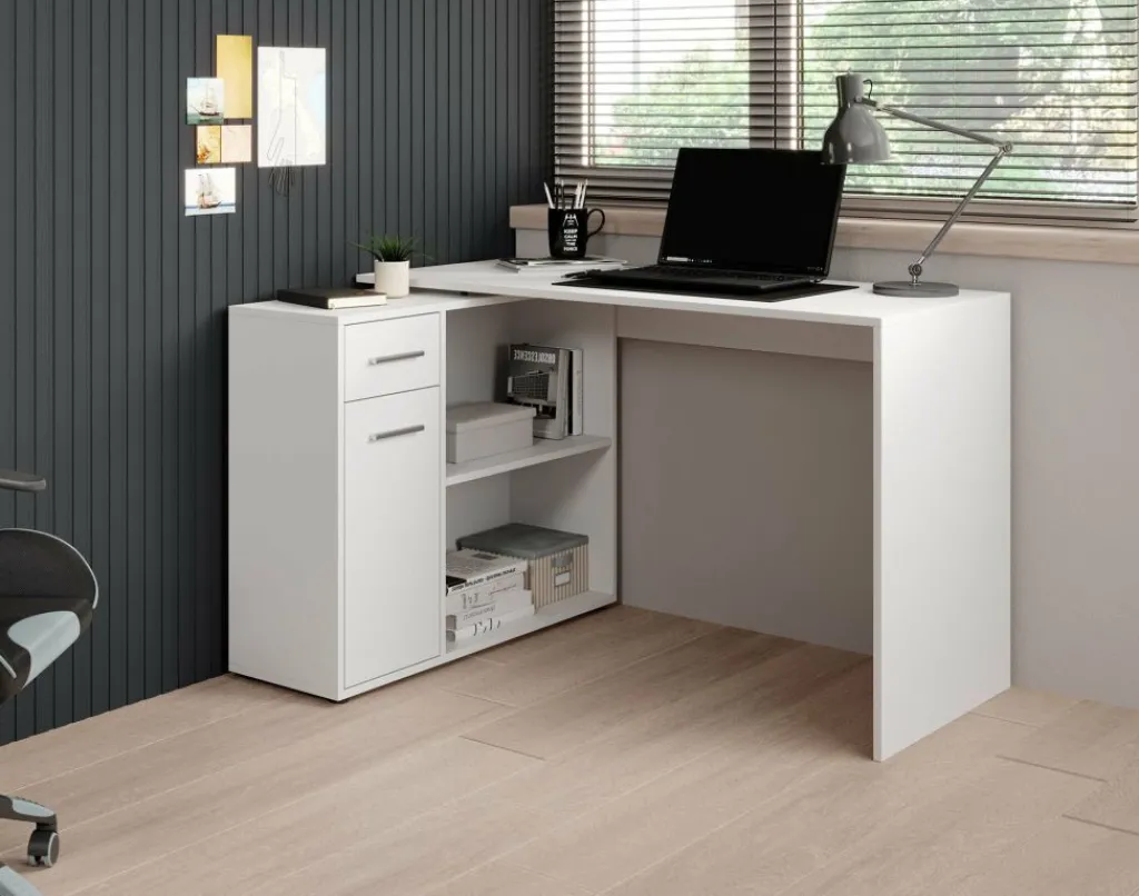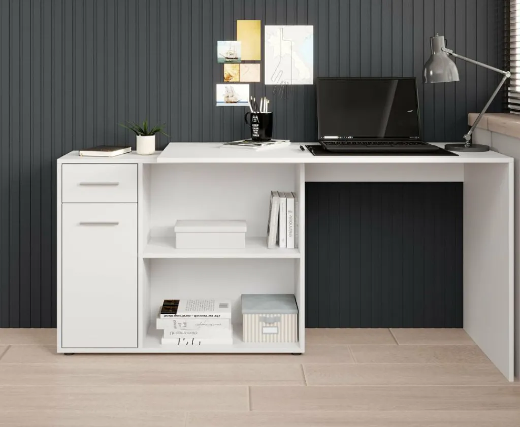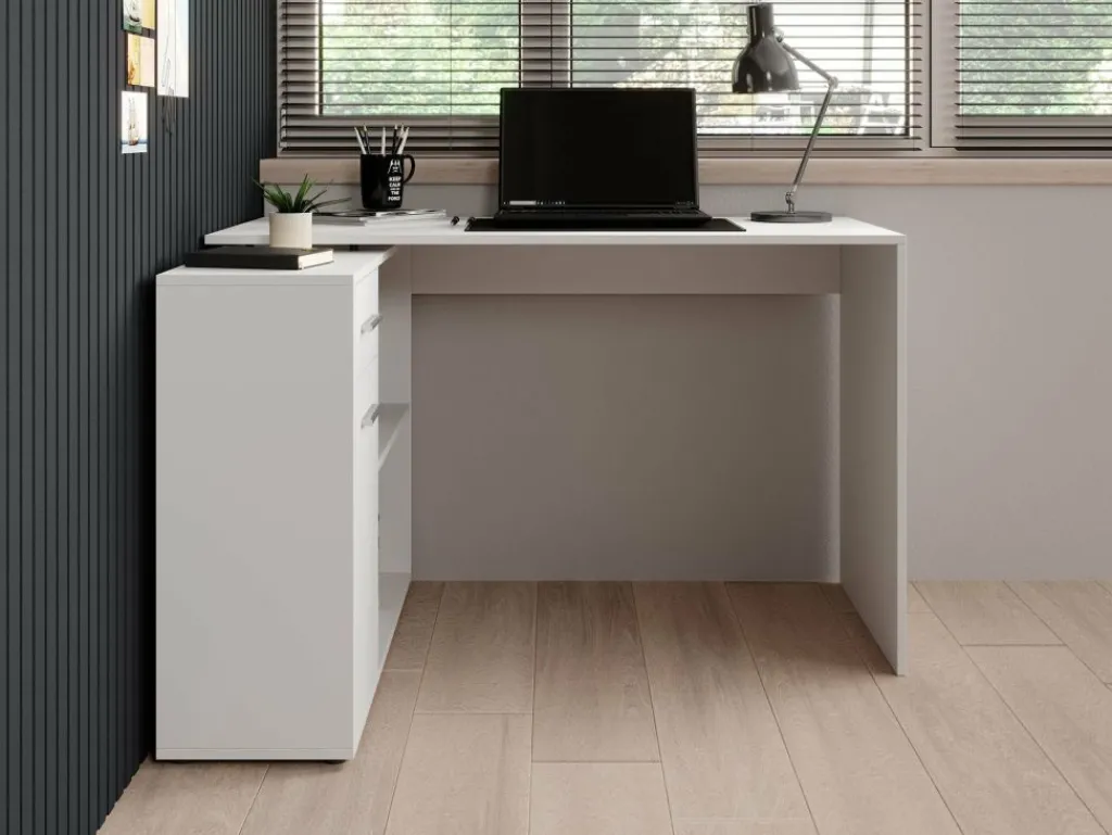 Het bureau beschikt over 1 lade en 1 deur, die je opent met grijze handgrepen. Daarnaast bevinden zich 2 open vakken. De module met opbergkasten is van positie te veranderen: plaats deze recht naast het blad, of schuin voor een hoekbureau.