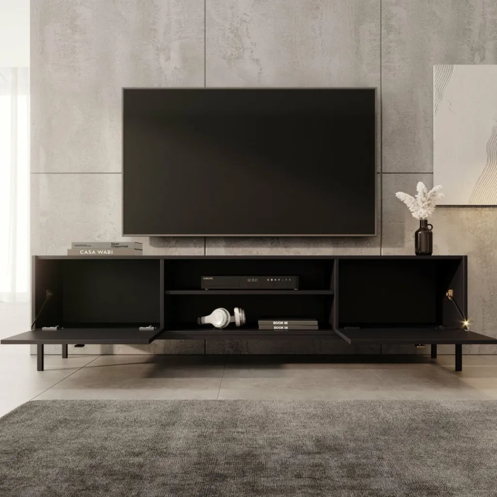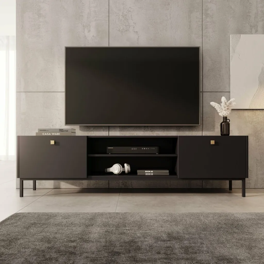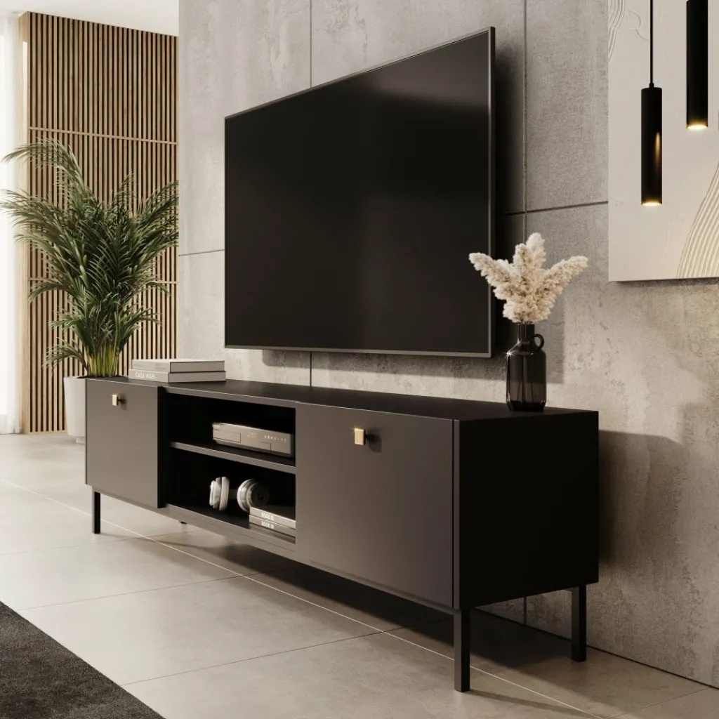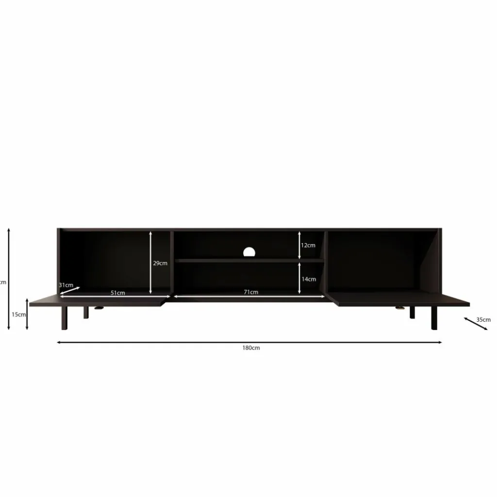 TV-Meubel Norment is een opbergkast voor onder de tv en staat op metalen poten. De TV-kast is gemaakt in een zwarte kleur. TV-Meubel Norment beschikt over 2 kleppen die openen met een goudkleurige handgreep. Tussen de kleppen zitten nog 2 open vakken. In de achterwand zit 1 uitsparing om bedrading te kunnen wegwerken.