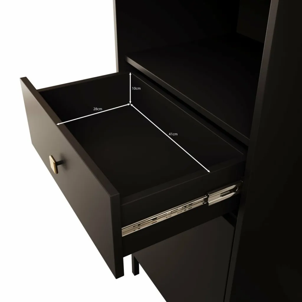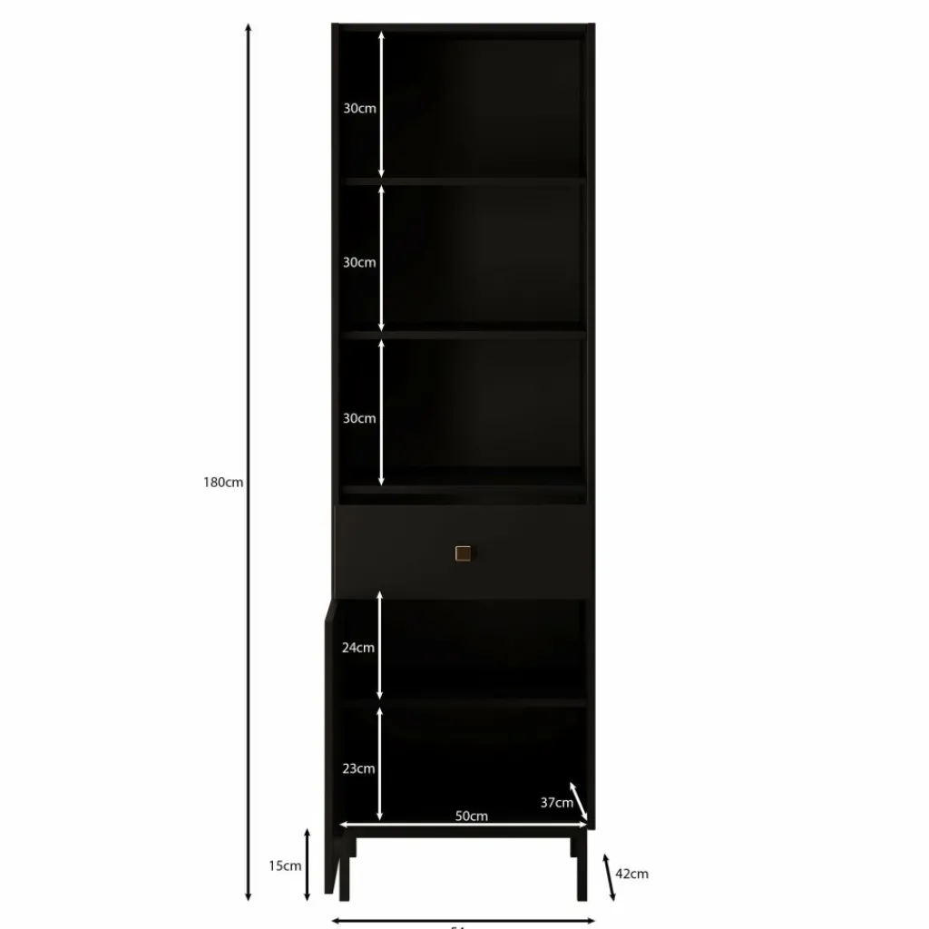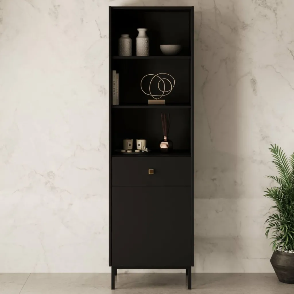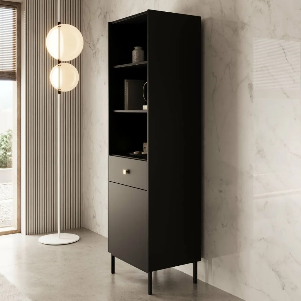 De Norment boekenkast in zwart combineert functionaliteit met een luxe uitstraling. Het strakke ontwerp met slanke pootjes en een subtiele goudkleurige knop geeft deze kast een moderne en hotel chique look.