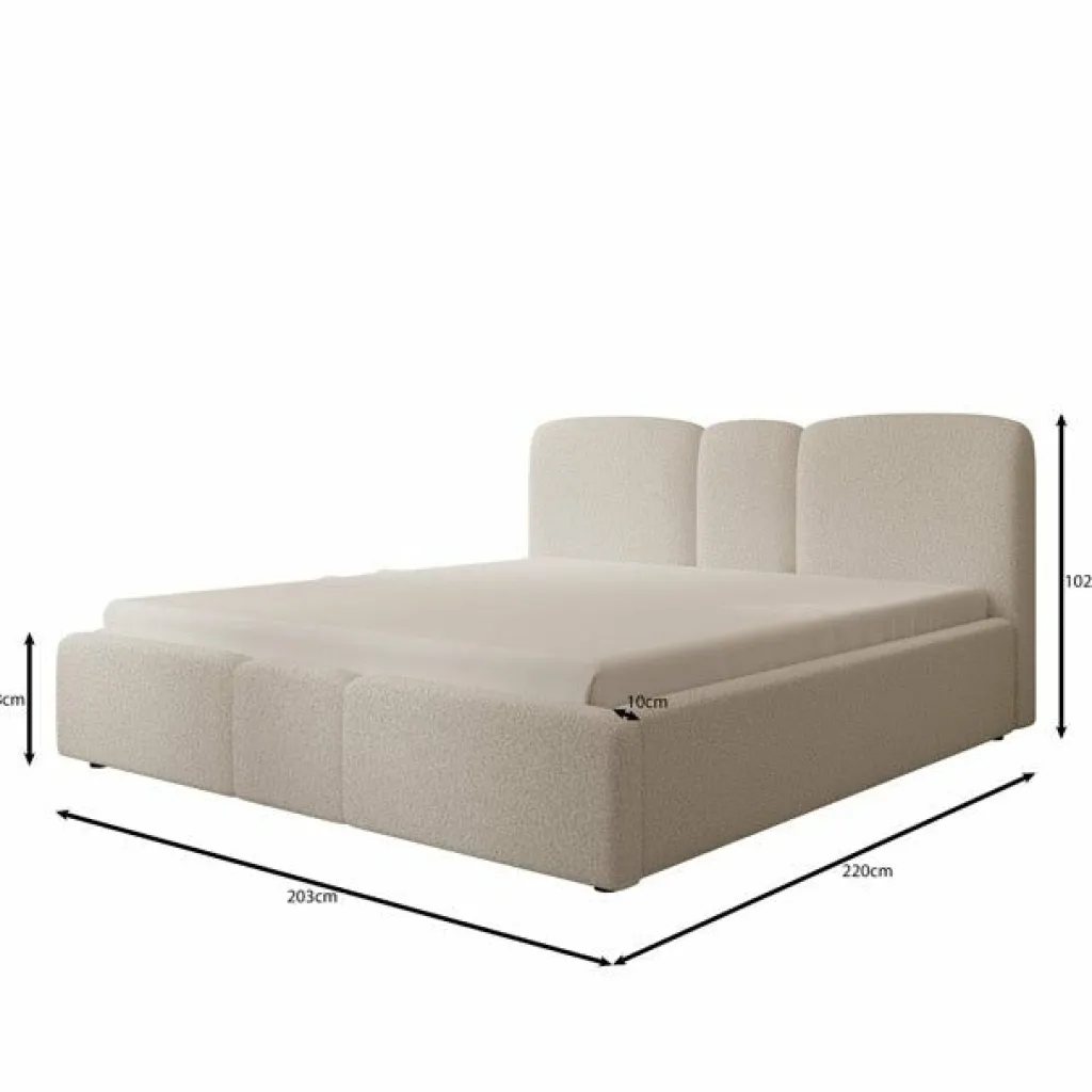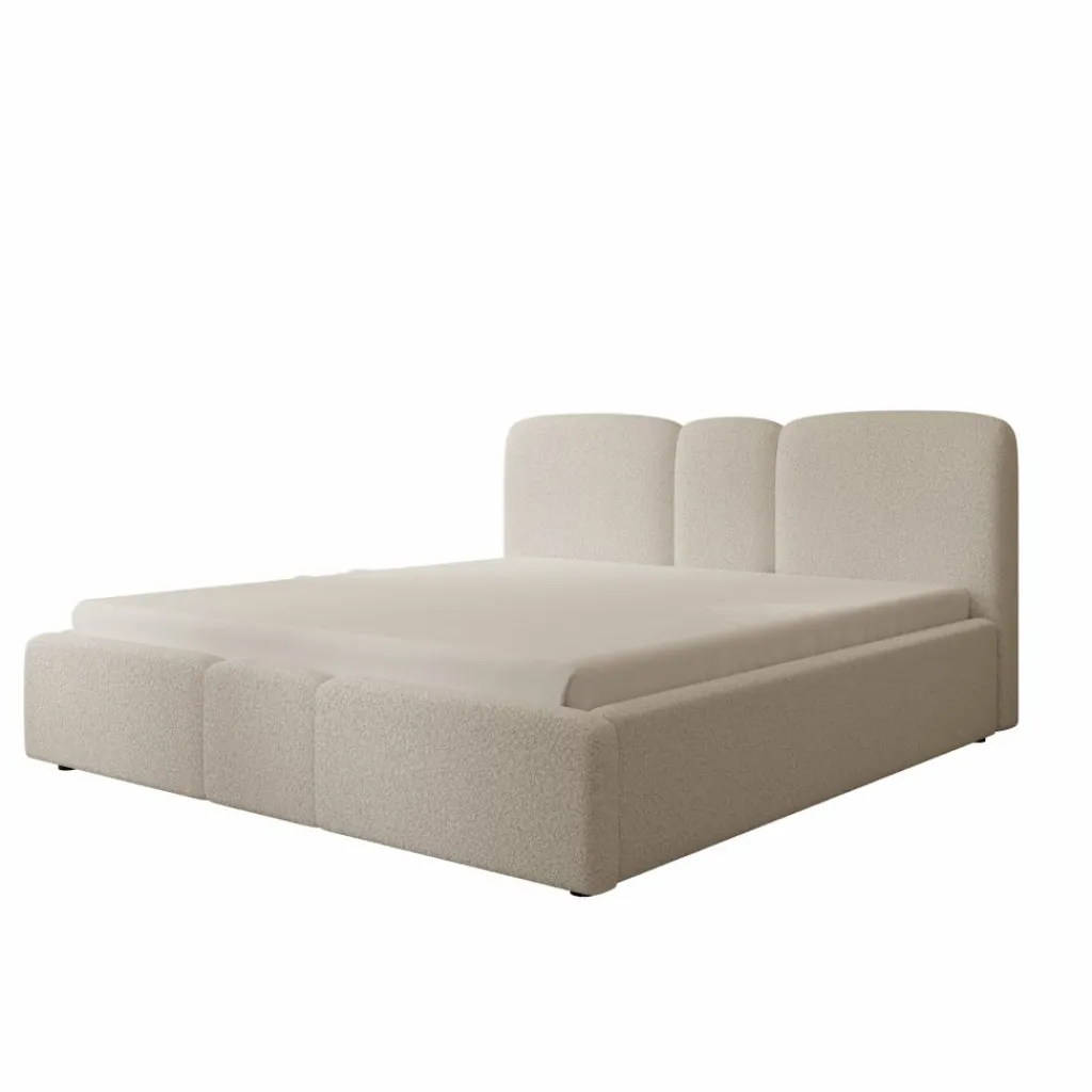 Het bed is bekleed met beige teddystof en heeft een hoofdbord met drie afgeronde, gestoffeerde panelen. Ook het voetbord heeft een afgeronde vormgeving, wat zorgt voor een samenhangend geheel. De combinatie van de bekleding en de afgeronde vormen geeft het bed een moderne uitstraling.