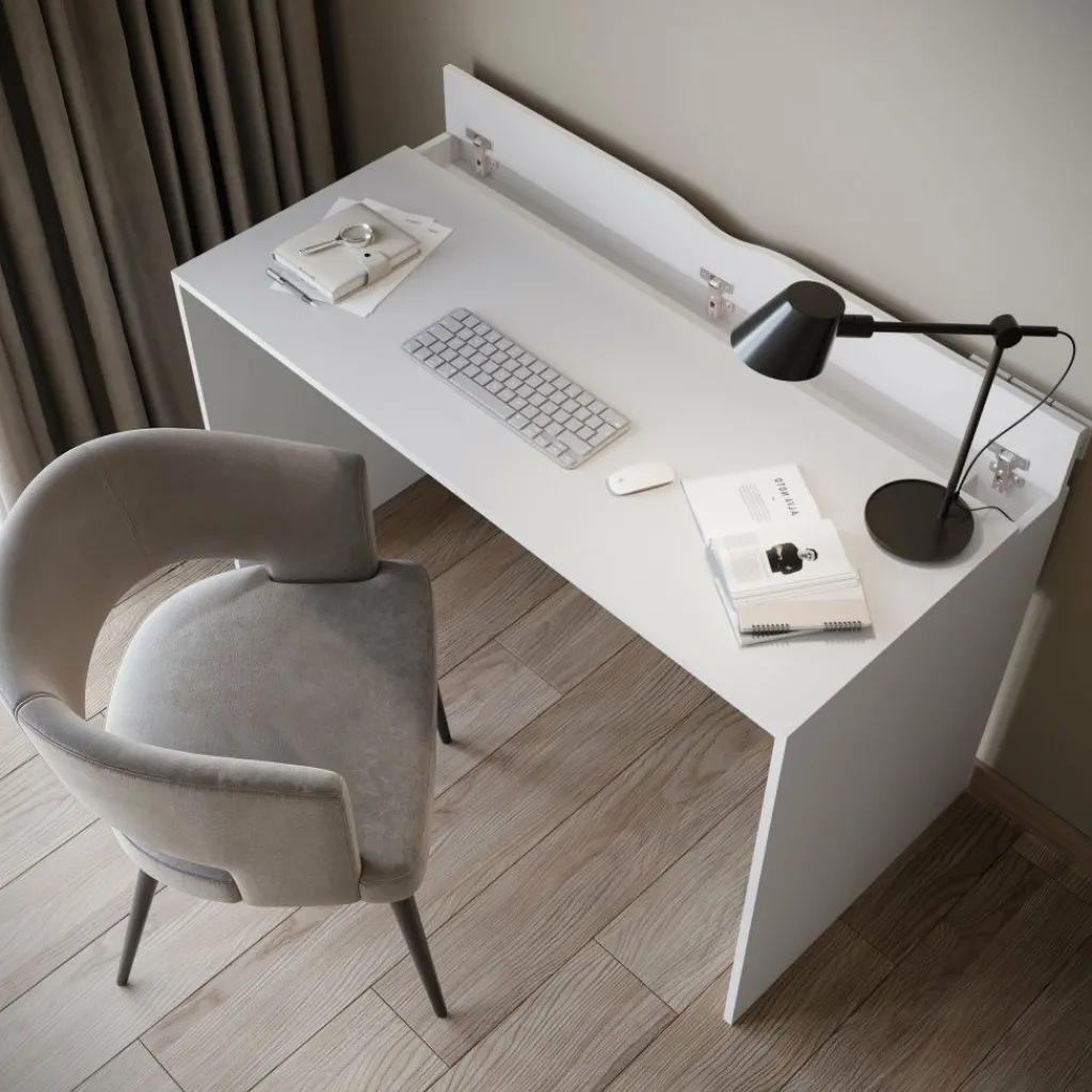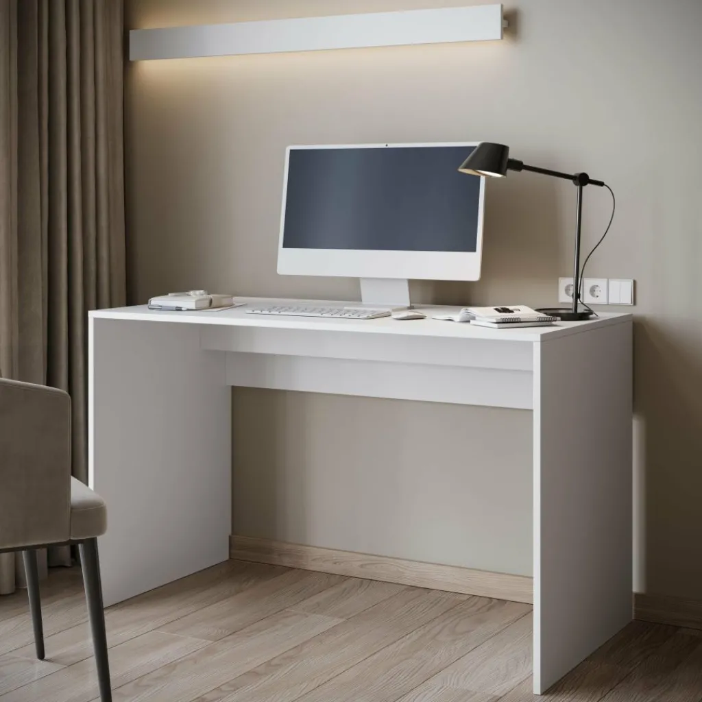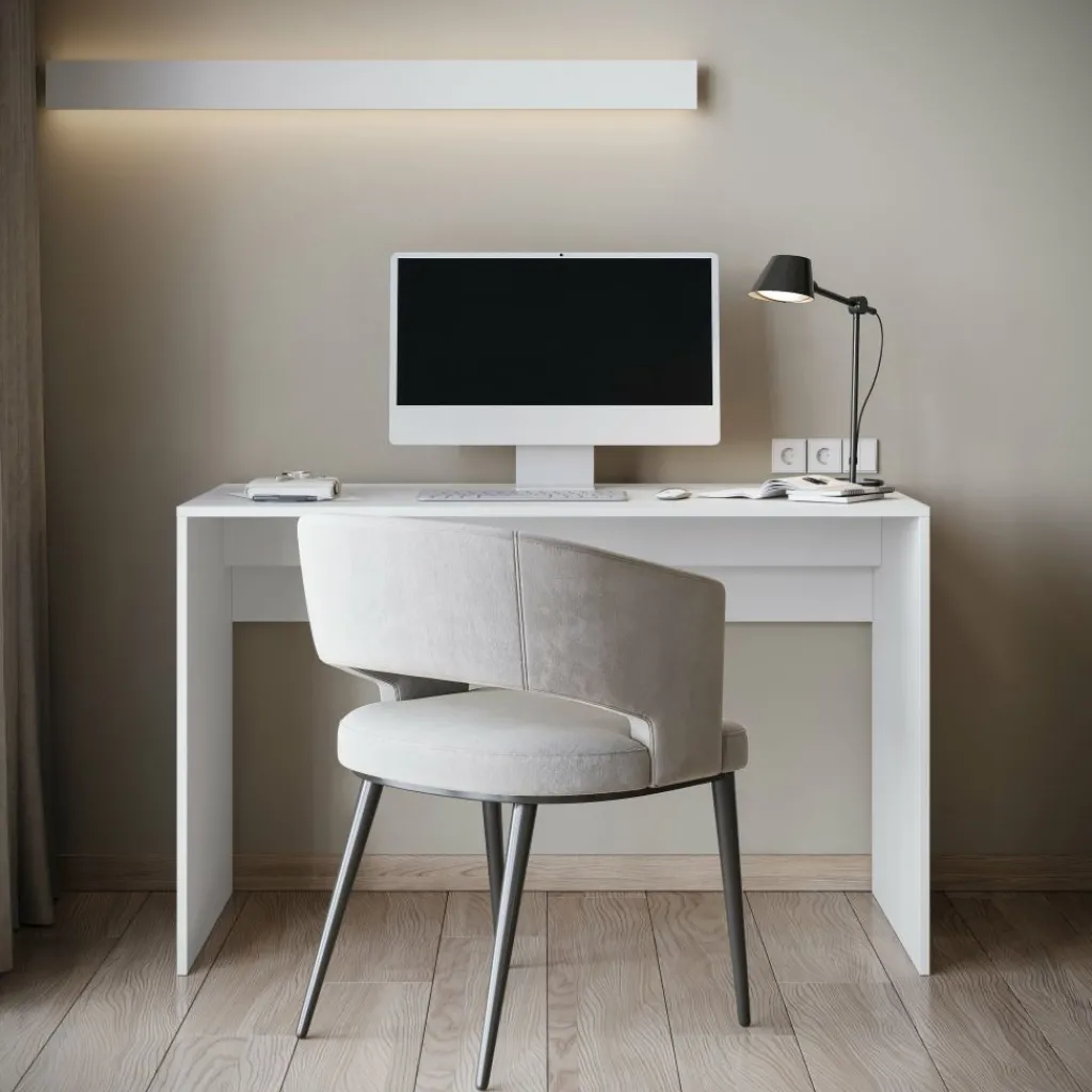 Bureau Nyon is een modern bureau uitgevoerd volledig in wit. Deze werkplek heeft een breedte van 120 cm. In het blad zit een handige klep waar je al je kabels mooi kunt weg werken. Deze klep is voorzien van scharnieren met een stil sluitmechanisme.