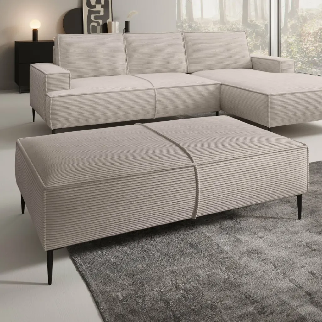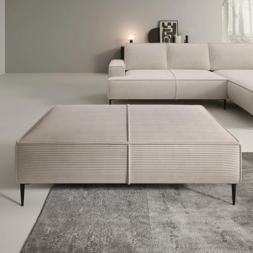 De Odin poef combineert comfort met een strakke uitstraling. Met zijn formaat van 140×65 cm is hij te gebruiken als extra zitplek, voetenbank of als aanvulling op je zithoek. De brede ribstructuur in beige ribstof geeft de poef een zachte look.