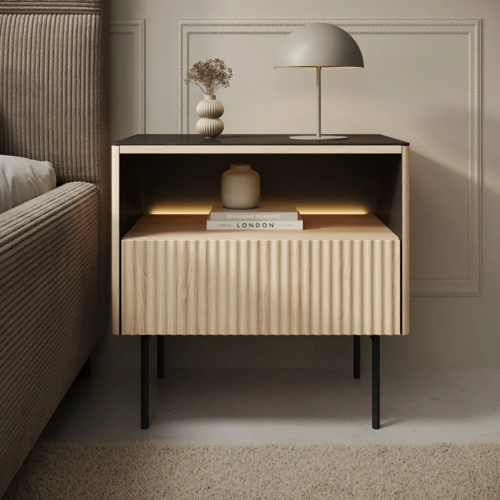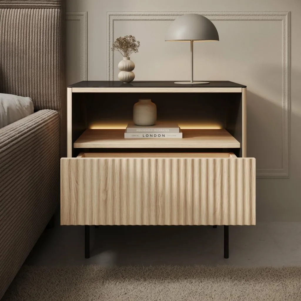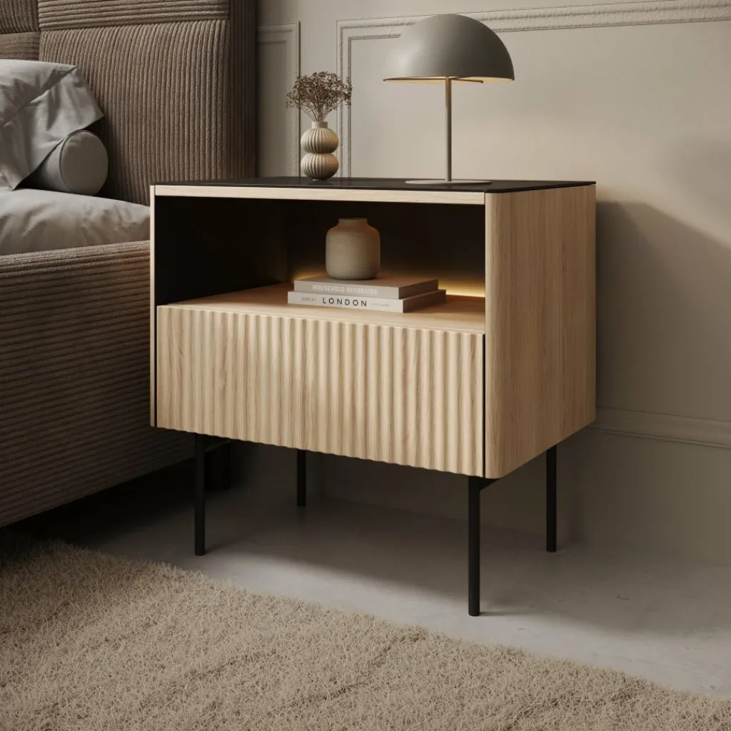 De lade heeft een geribbelde frontafwerking en schuift volledig naar voren, geschikt voor kleinere spullen die je uit het zicht wilt bewaren. Het open vak daarboven is praktisch voor items die je snel wilt pakken, zoals een boek of accessoires. Het eikenpatroon geeft het meubel een zichtbare houtstructuur. Op het bovenblad is ruimte voor een lamp of andere dagelijkse benodigdheden.