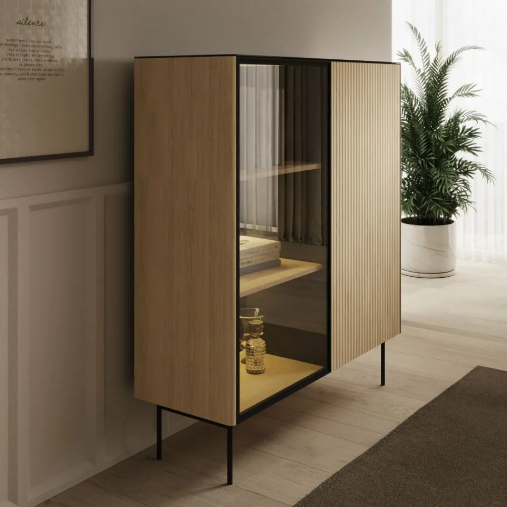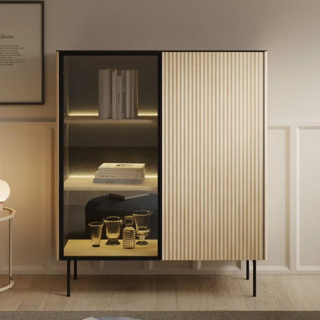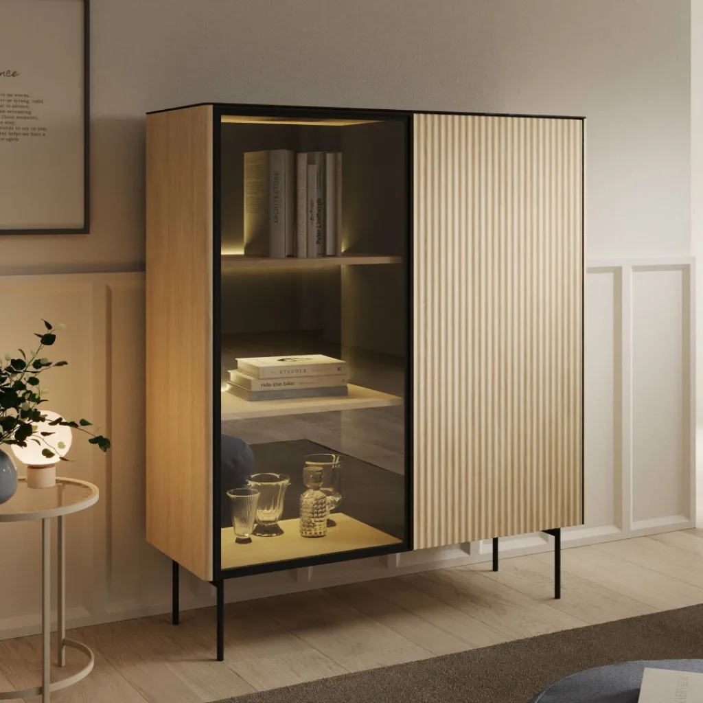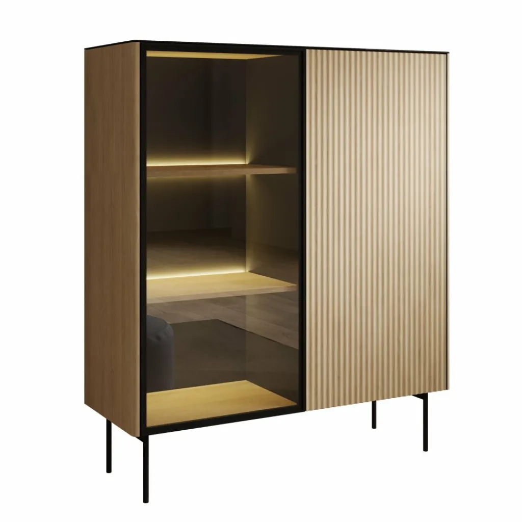 De Okari vitrinekast biedt een combinatie van zichtbare presentatie en praktische opbergruimte. Het meubel is uitgevoerd in eikenpatroon en heeft een glazen vitrinedeur aan de ene zijde en een gesloten deur met verticaal reliëf aan de andere zijde. Hierdoor ontstaat een duidelijke verdeling tussen items die je wilt tonen en spullen die je liever uit het zicht opbergt.