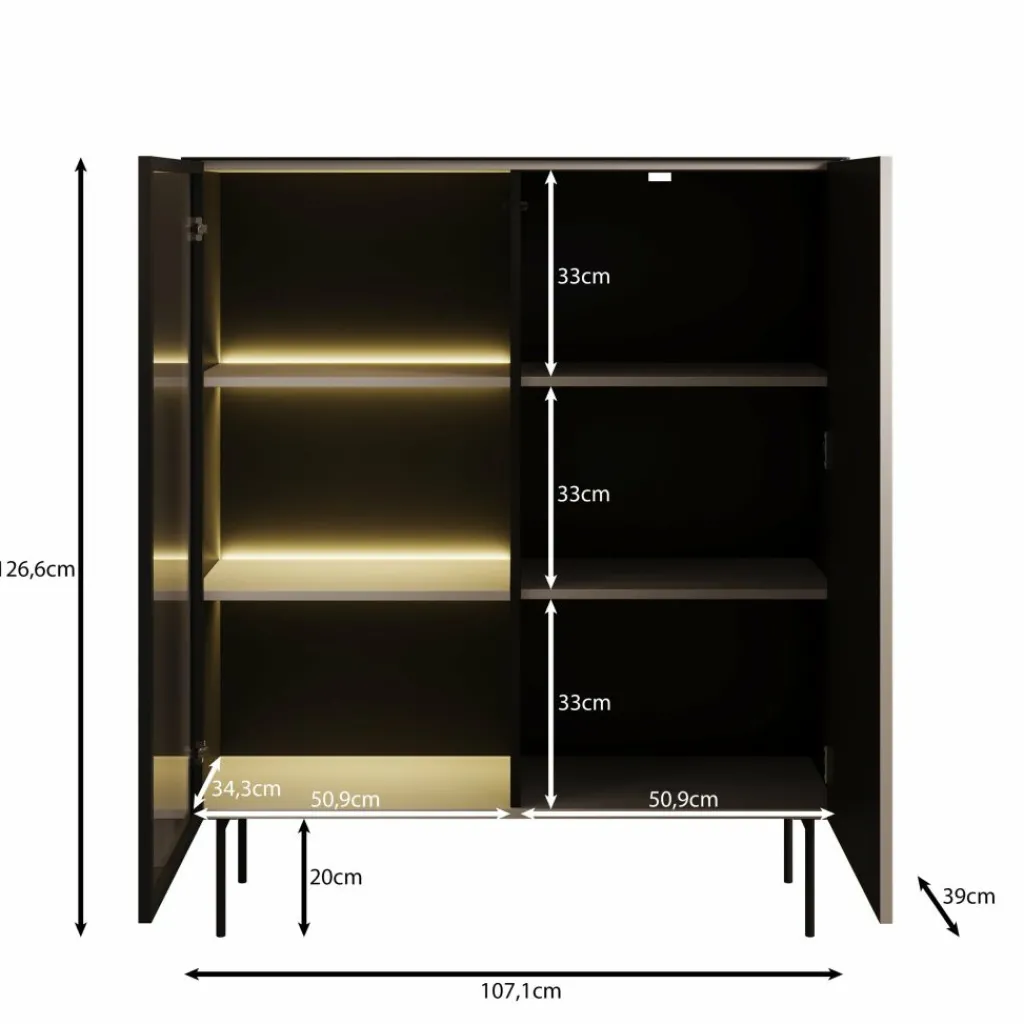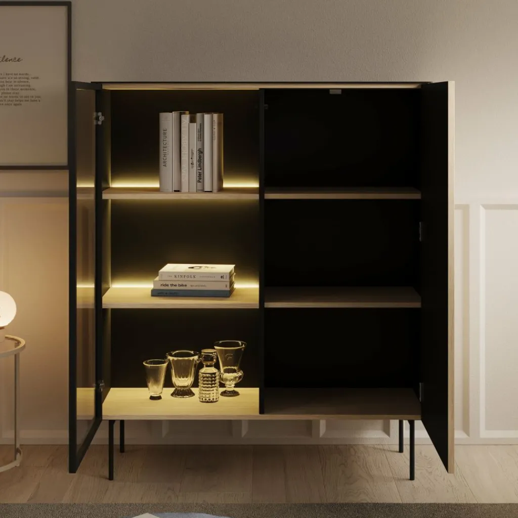 Achter de glazen deur bevinden zich meerdere vakken waarin decoratieve items, glaswerk of boeken zichtbaar kunnen worden geplaatst. De geïntegreerde ledverlichting verlicht de vakken en zorgt ervoor dat de inhoud goed zichtbaar blijft. Het gesloten kastgedeelte biedt extra opbergruimte voor spullen die je netjes uit het zicht wilt houden.