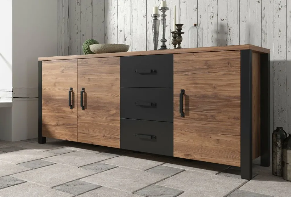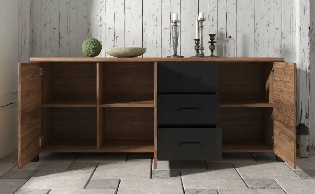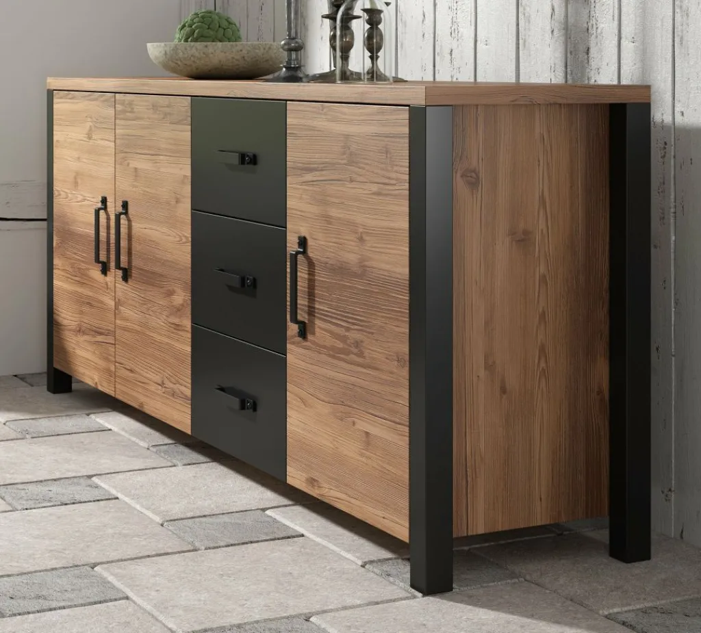 Dressior Olivia is een praktisch vormgegeven dressoir met handige opbergmogelijkheden. De Olivia beschikt over drie deuren met 6 opbergvakken en drie lades .Het dressoir staat op stevige houten poten.