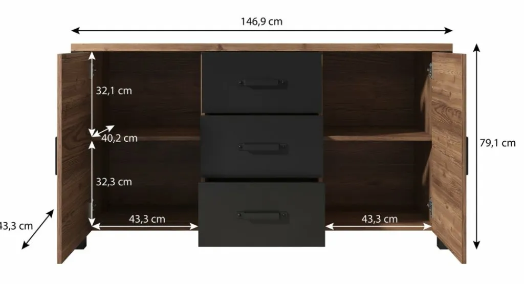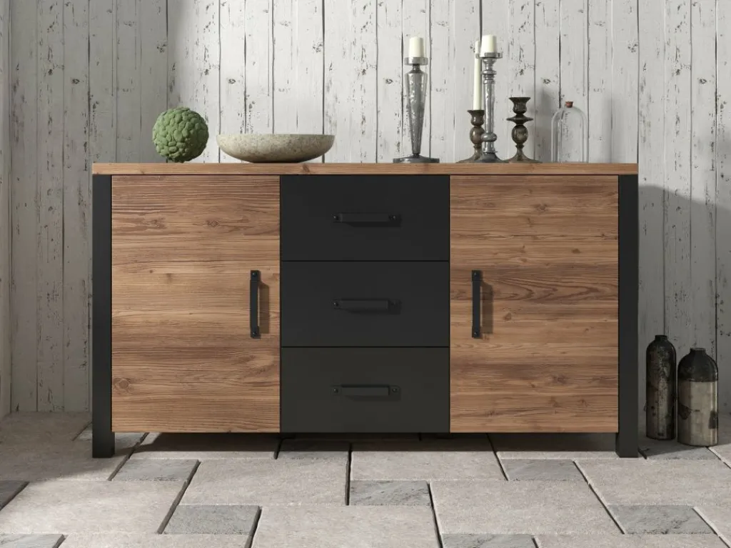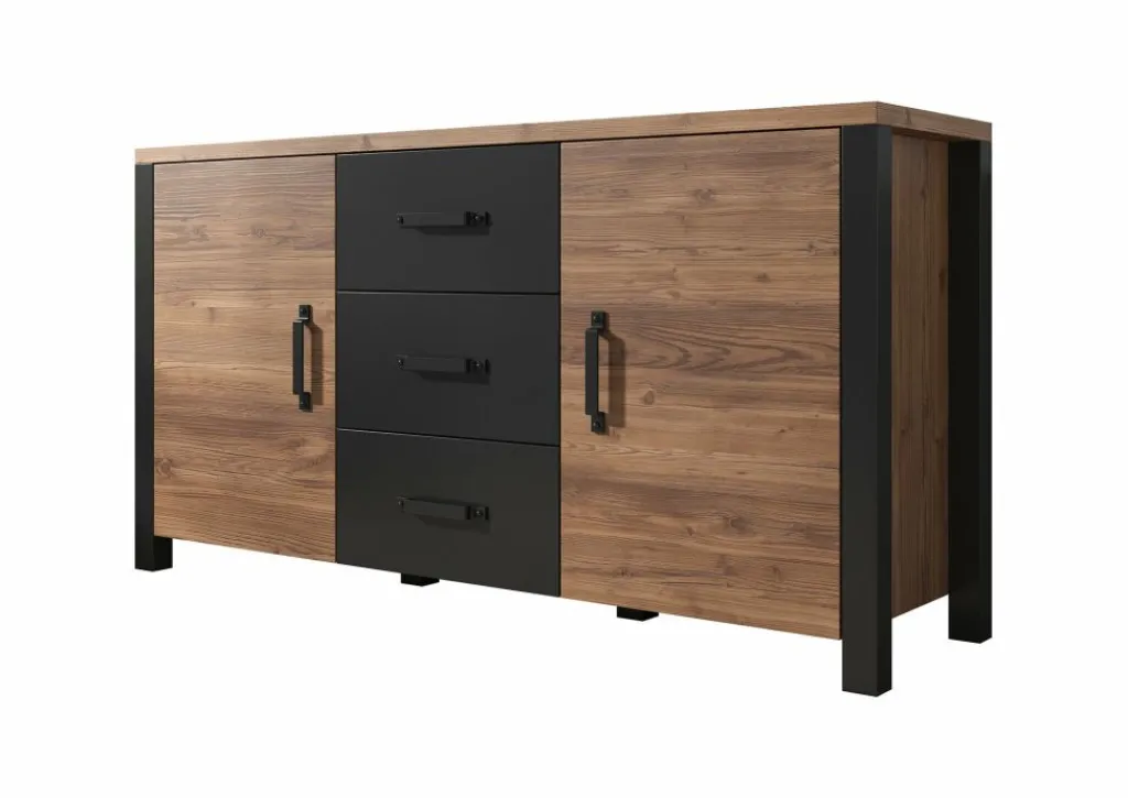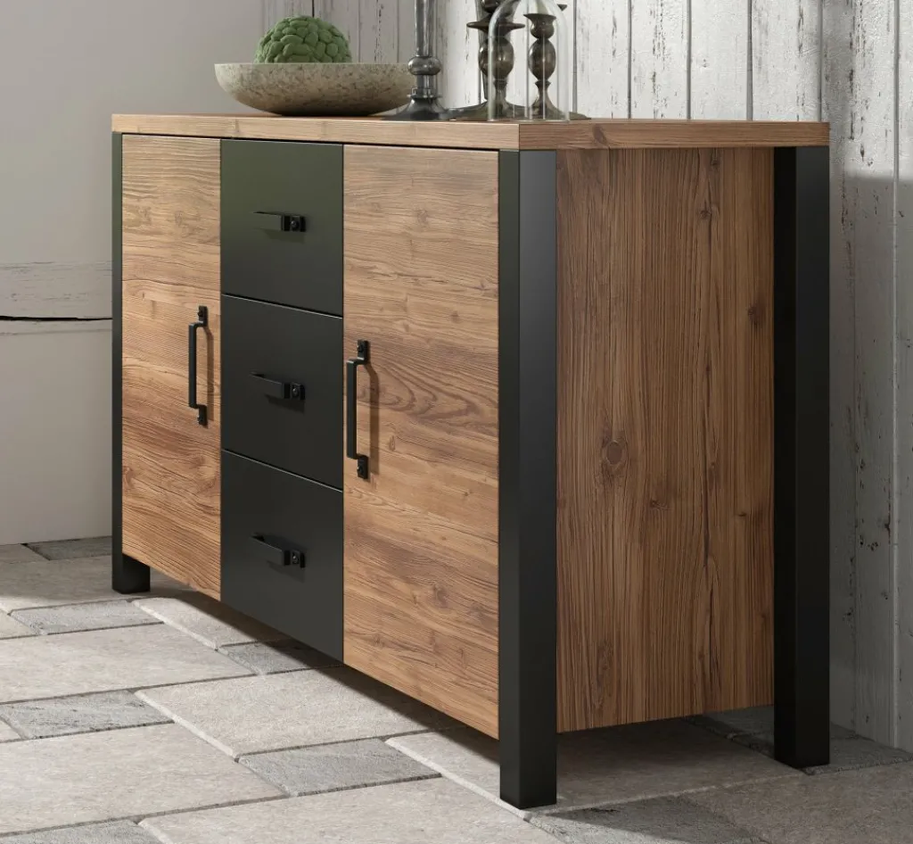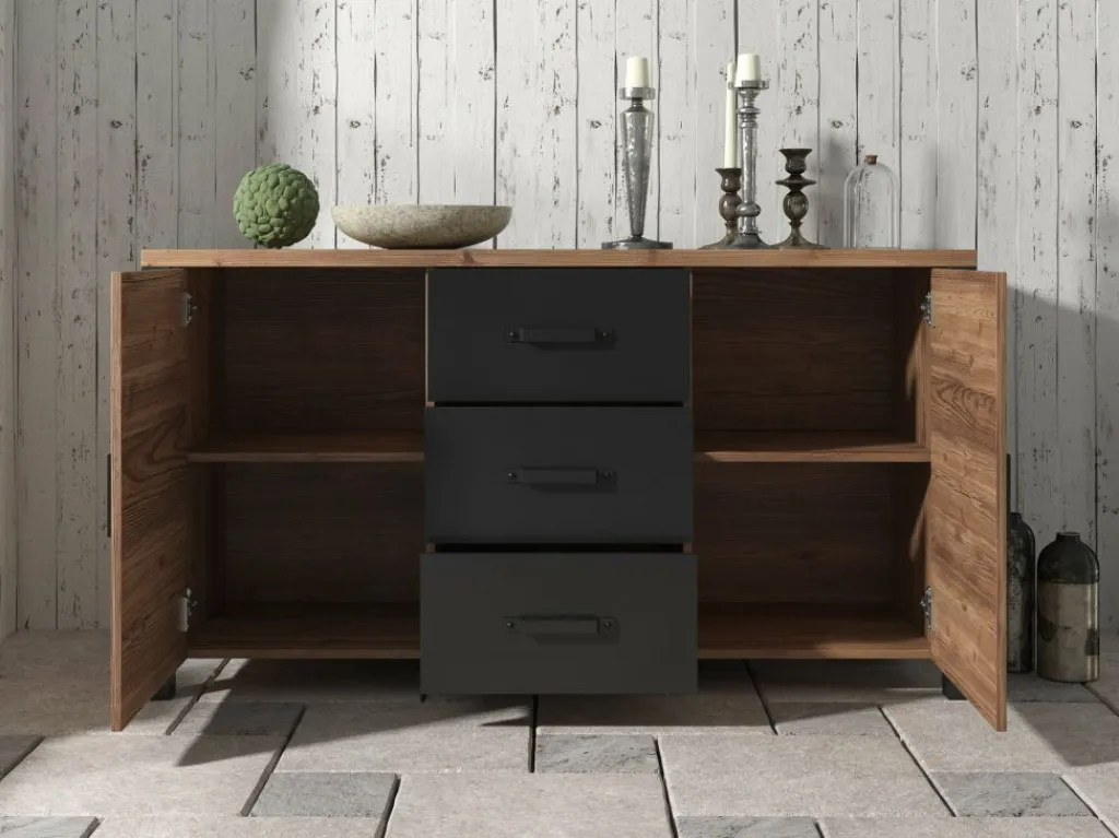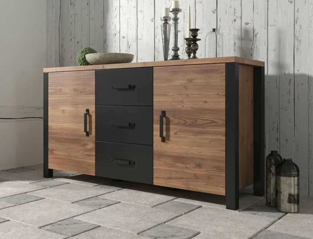 Dressior Olivia is een praktisch vormgegeven dressoir met handige opbergmogelijkheden. De Olivia beschikt over twee deuren en drie lades met metalen greepjes. Het dressoir staat op stevige houten poten.