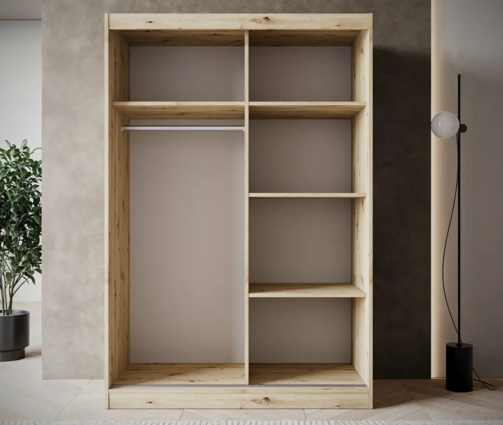 Kledingkast Olly is een garderobekast met ruime opbergmogelijkheden, uitgevoerd in een eiken kleur. De kast beschikt over 2 schuifdeuren die openen met zwarte handgrepen. De linkerdeur is voorzien van een handige spiegel. De binnenkant van de kast bestaat uit 5 opbergvakken en 1 kledingroede.
