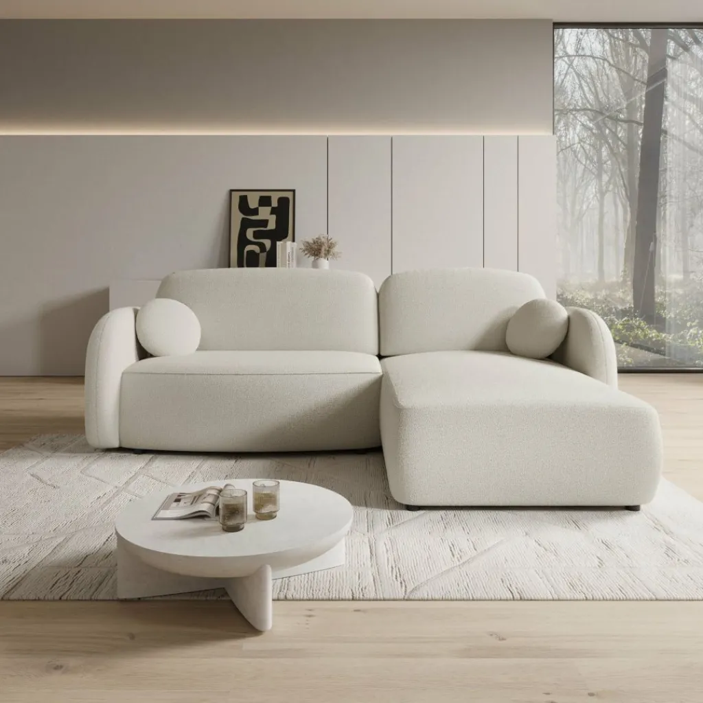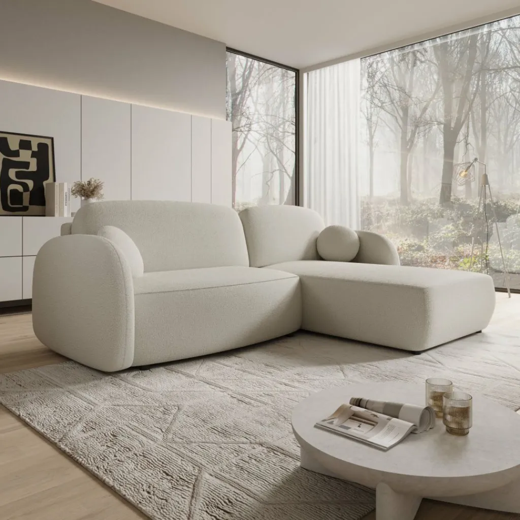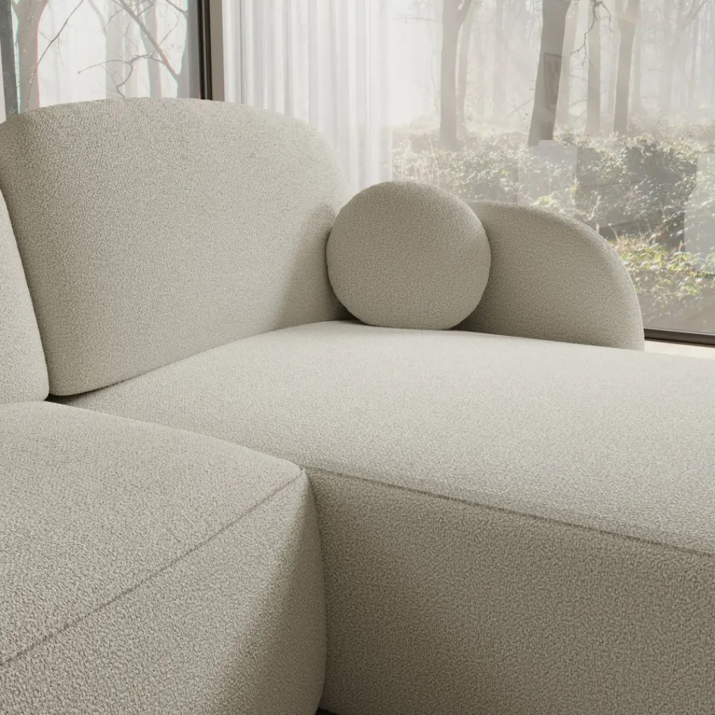 De Ometa hoekbank in witte teddystof heeft een hoekopstelling met een chaise longue aan de rechterzijde. De bank bestaat uit een zitgedeelte met losse rug- en zitkussens en een brede loungezone die extra zit- en ligruimte biedt.