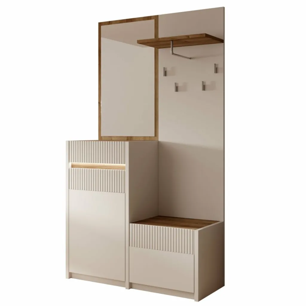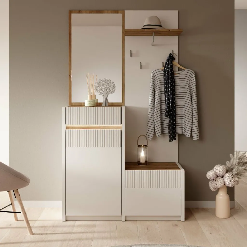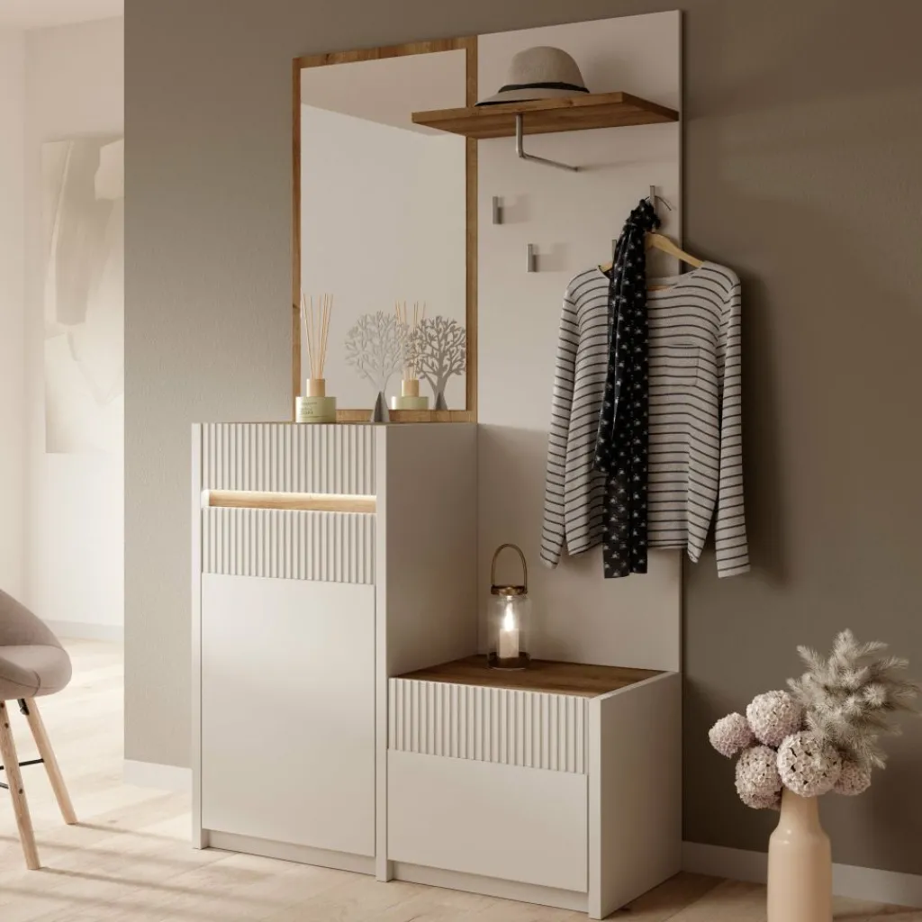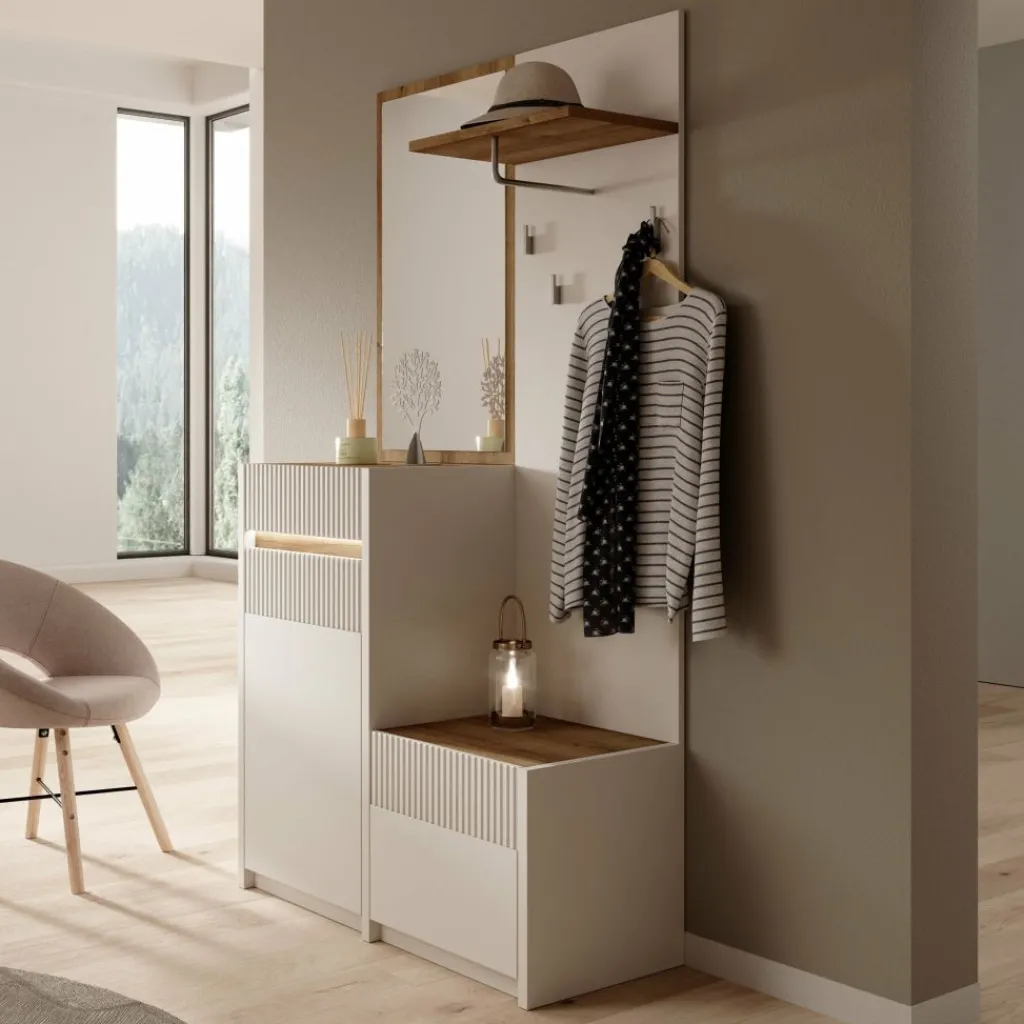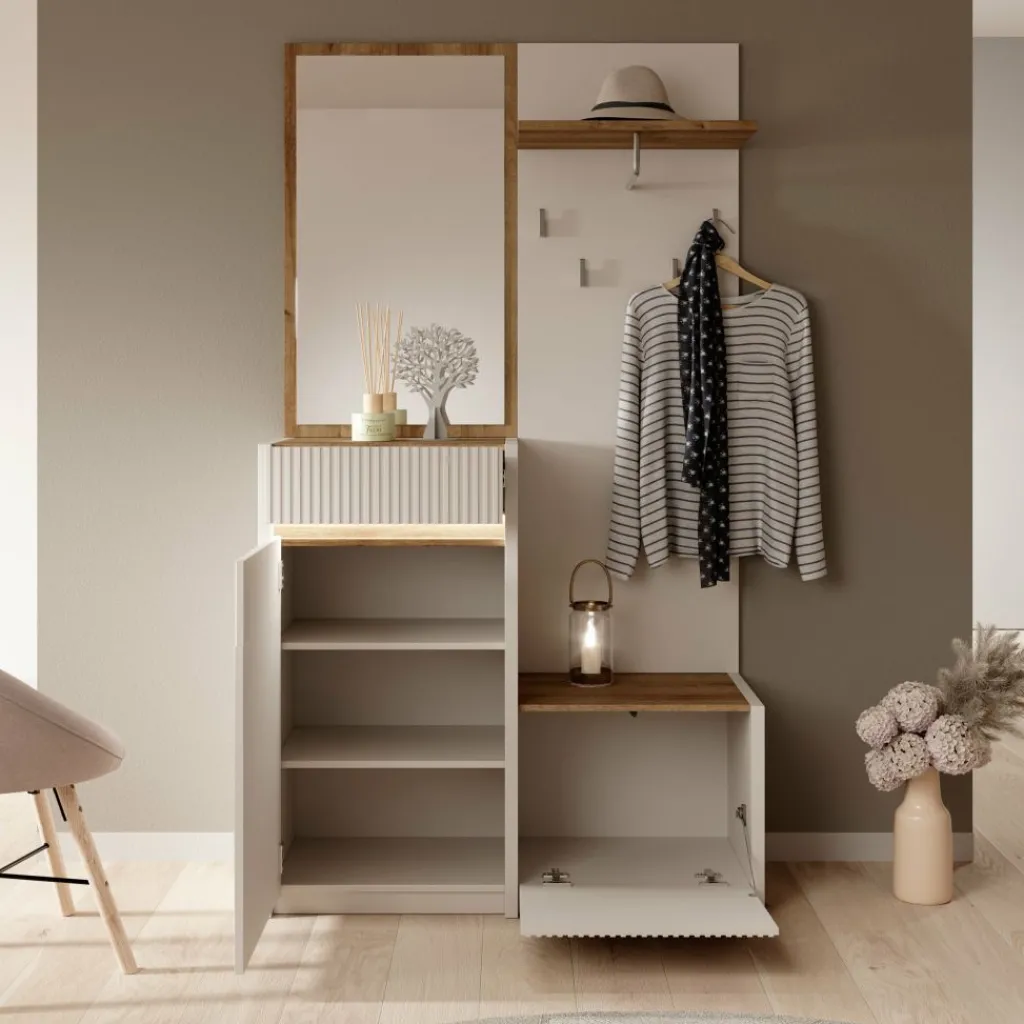 De kapstok bestaat uit meerdere functionele delen die logisch zijn opgebouwd. Het bovenste gedeelte is voorzien van een wandpaneel met haken en een hoedenplank, geschikt voor jassen, tassen en andere items die je snel bij de hand wilt hebben. Het middenstuk bevat een spiegel, handig bij het aantrekken van schoenen of het controleren van je outfit voordat je vertrekt. In het onderste gedeelte vind je gesloten opbergruimte met deuren en legplanken, geschikt voor schoenen en andere spullen die je uit het zicht wilt opbergen.
