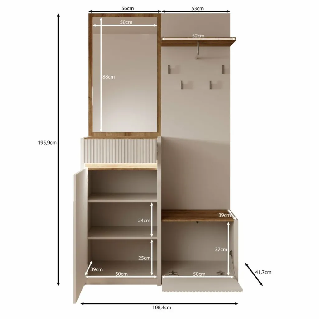 Orenzo kapstok is een praktische opbergoplossing voor de hal of entree, uitgevoerd in een beige kleur met warme houtaccenten. Met een breedte van 108 cm, een diepte van 42 cm en een hoogte van 196 cm biedt dit model een duidelijke indeling voor jassen, schoenen en accessoires zonder onnodig veel ruimte in te nemen.