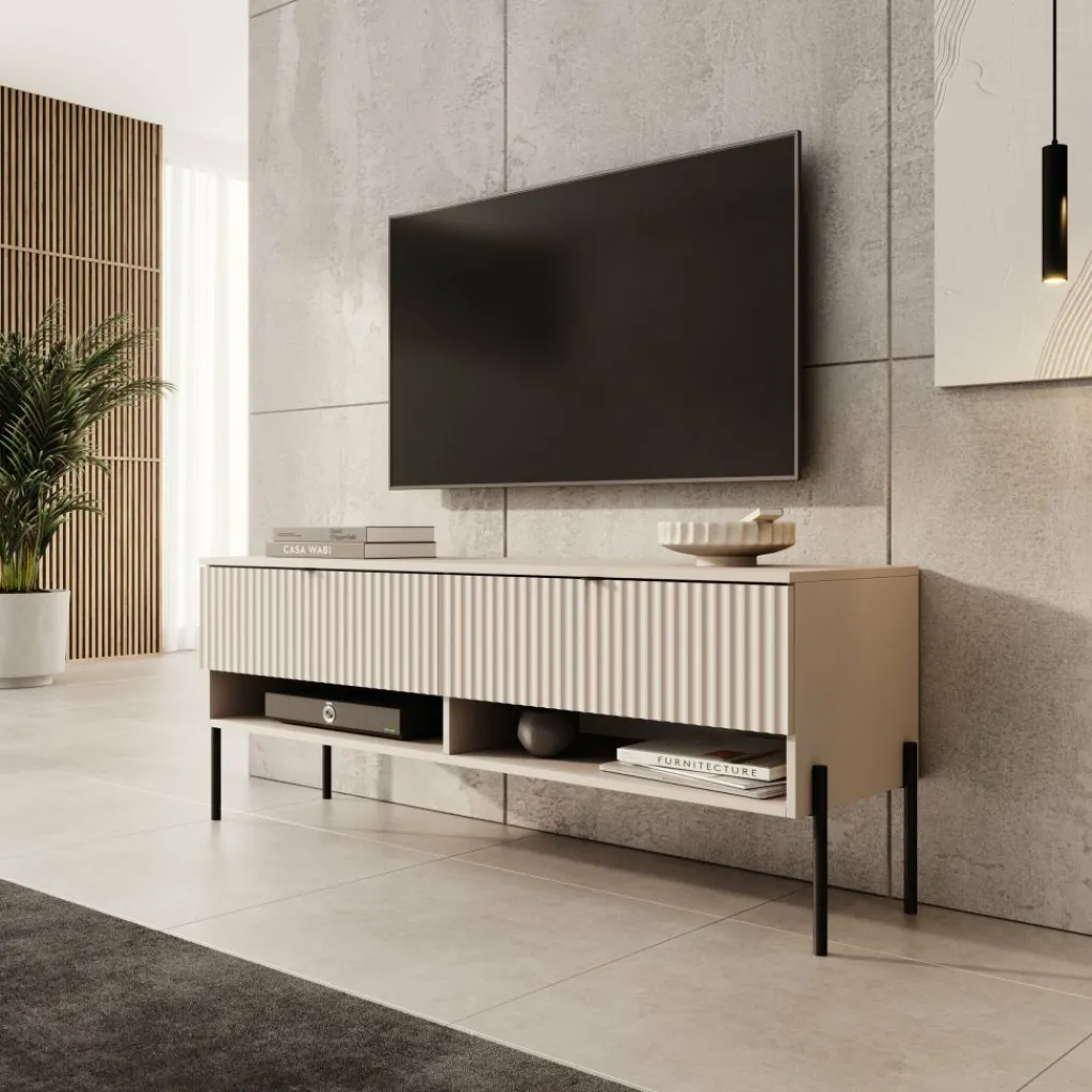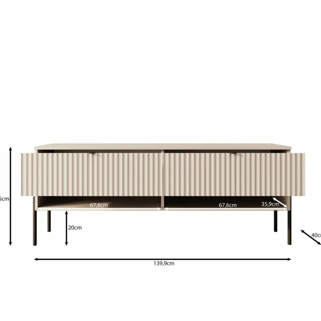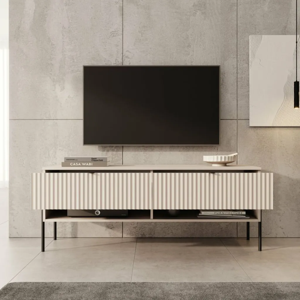 Het Oriya tv-meubel is uitgevoerd in een warme beige kleur en heeft een strak design met twee lades voorzien van een decoratief ribbelmotief over de volledige breedte van het front. De egale, lichte afwerking en de verfijnde ribbeltextuur zorgen samen voor een rustige maar karaktervolle uitstraling die past bij verschillende interieurstijlen, van Scandinavisch tot Japandi. Het frame, de lades en fronten zijn gemaakt van 15 mm spaanplaat, de achterwanden zijn gemaakt van 3 mm HDF en de handgrepen zijn gemaakt van kunststof. Met een breedte van 140 cm en een hoogte van 55 cm is dit tv-meubel geschikt voor televisies van verschillende formaten en past het goed in de meeste woonkamers.