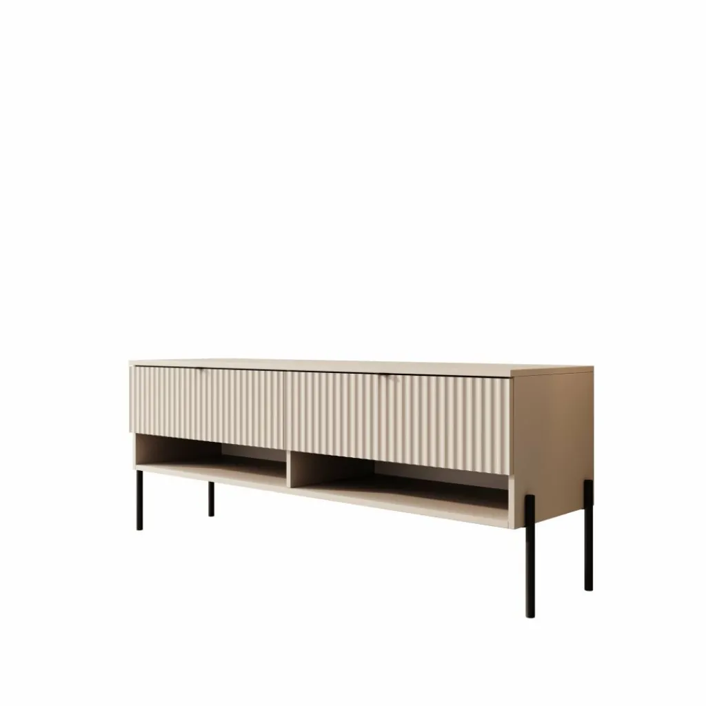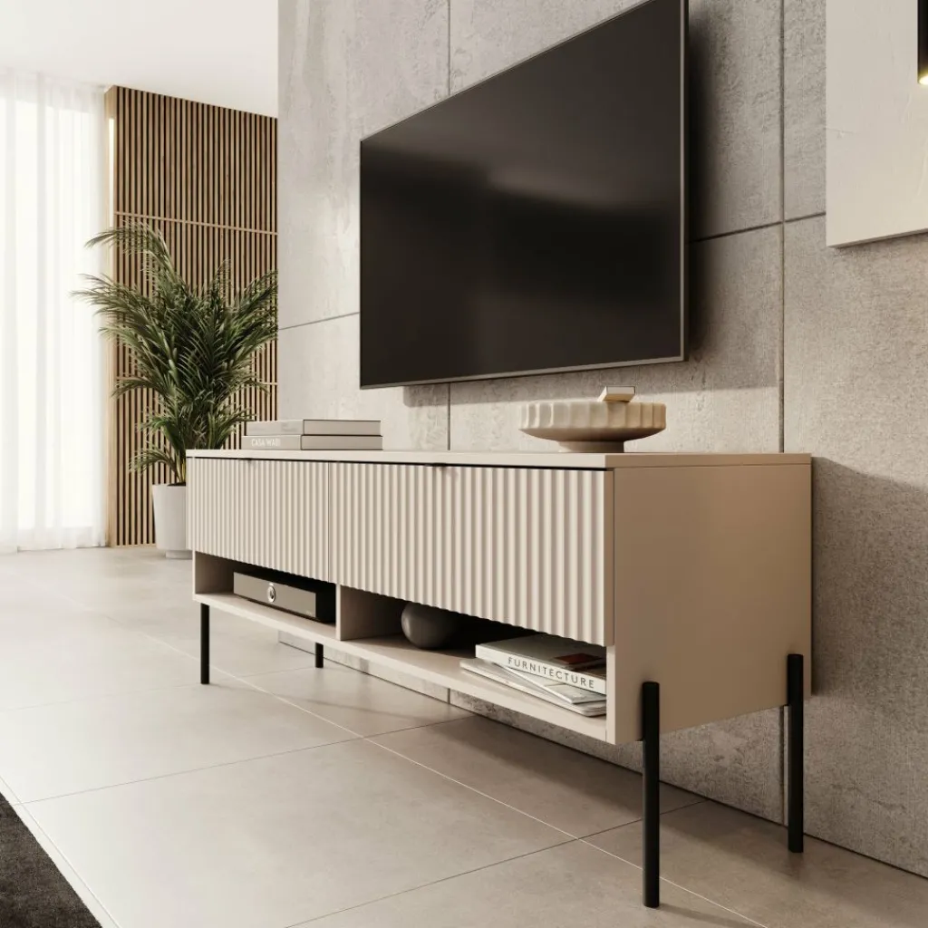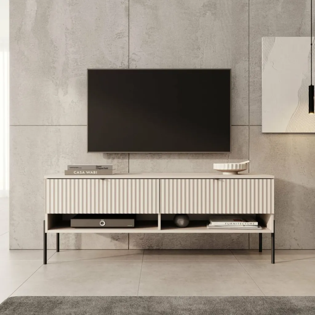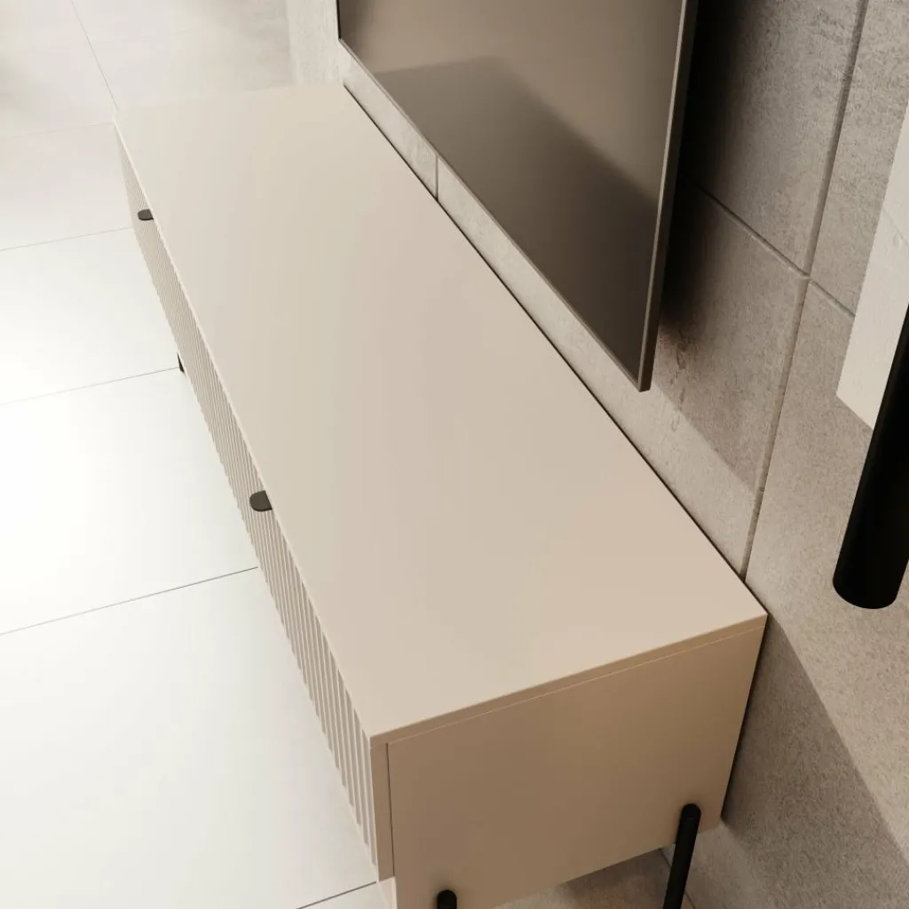 Het Oriya tv-meubel is uitgevoerd in een warme beige kleur en heeft een strak design met twee lades voorzien van een decoratief ribbelmotief over de volledige breedte van het front. De egale, lichte afwerking en de verfijnde ribbeltextuur zorgen samen voor een rustige maar karaktervolle uitstraling die past bij verschillende interieurstijlen, van Scandinavisch tot Japandi. Het frame, de lades en fronten zijn gemaakt van 15 mm spaanplaat, de achterwanden zijn gemaakt van 3 mm HDF en de handgrepen zijn gemaakt van kunststof. Met een breedte van 140 cm en een hoogte van 55 cm is dit tv-meubel geschikt voor televisies van verschillende formaten en past het goed in de meeste woonkamers.