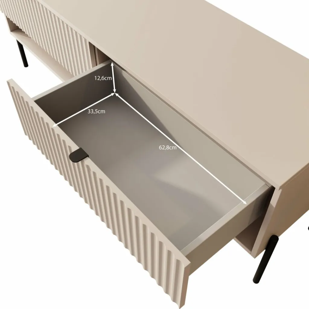 Het meubel beschikt over twee ruime lades met een decoratief ribbelmotief front, elk met een binnenmaat van 62,8 cm breed, 33,5 cm diep en 12,6 cm hoog. Het maximale draaggewicht per lade bedraagt 7 kg. Onder de lades bevinden zich twee open vakken van elk 67,6 cm breed en 35,9 cm diep, ideaal voor het plaatsen van een mediaspeler, soundbar of andere apparatuur.