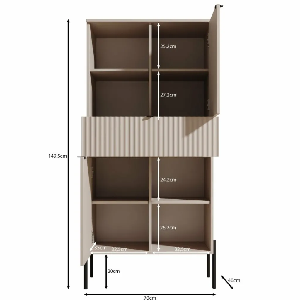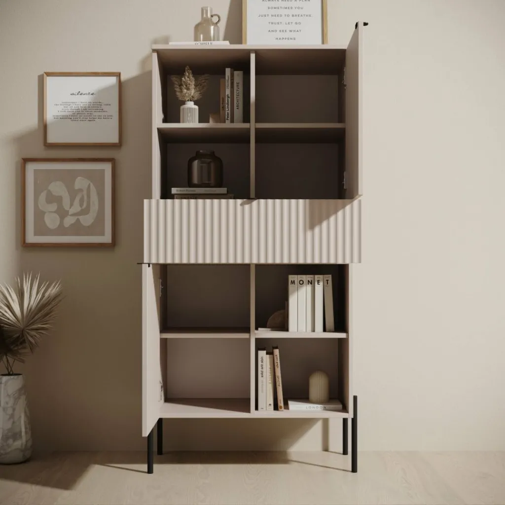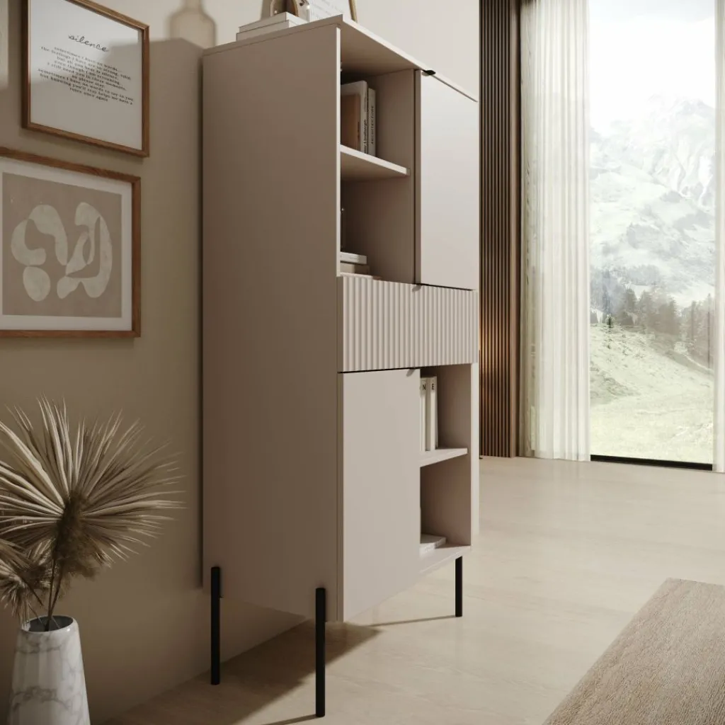 De Oriya boekenkast is uitgevoerd in een warme beige kleur en heeft een strak design met een decoratieve lade voorzien van verticale ribbels. De lichte, egale afwerking zorgt voor een rustige uitstraling die past bij verschillende interieurstijlen, van Scandinavisch tot Japandi. Het frame, de lades, leggers en fronten zijn gemaakt van 15 mm spaanplaat, de achterwanden zijn gemaakt van 3 mm HDF en de handgrepen zijn gemaakt van kunststof. Met een breedte van 70 cm en een hoogte van 150 cm is deze boekenkast geschikt voor kleinere en grotere woonruimtes en past hij goed naast een bank, bureau of in een gang.