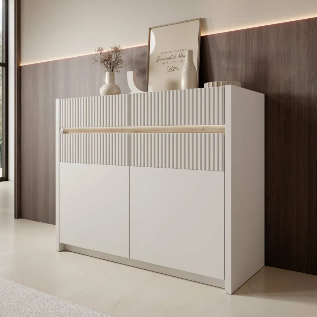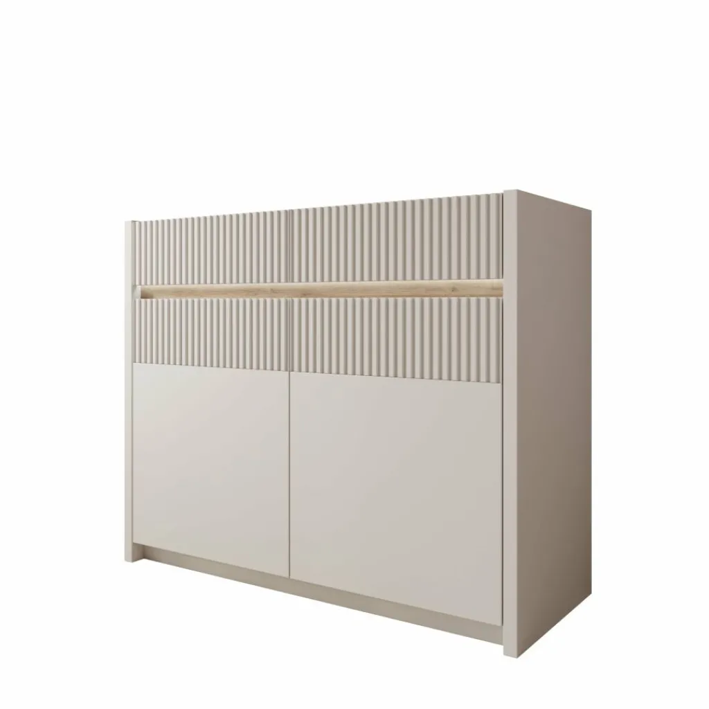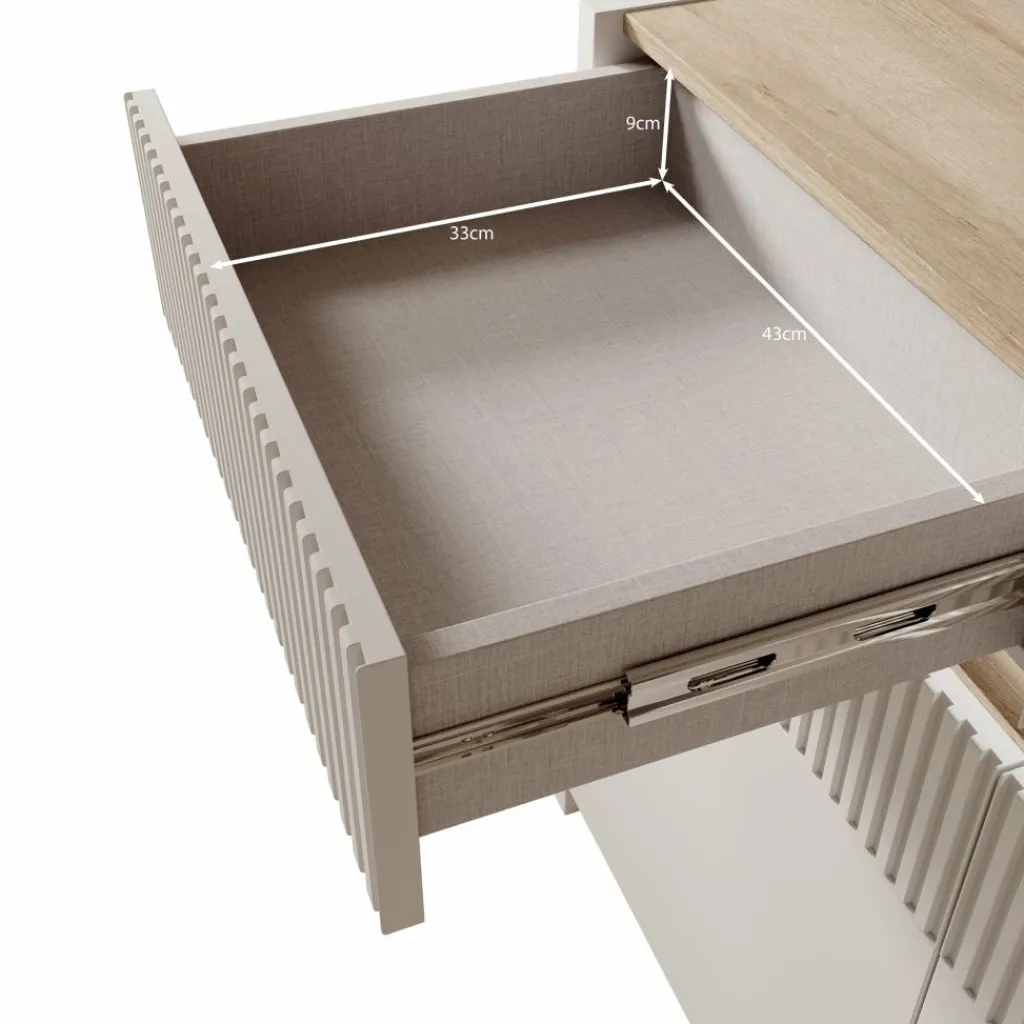 Het Orlano dressoir is uitgevoerd in een beige kleur en heeft een strak vormgegeven front met verticale reliëfdetails. Het bovenblad heeft een houtlook afwerking die een duidelijk contrast vormt met de lichte kast. Het frame van het meubel is gemaakt van spaanplaat en de geribbelde inzetstukken zijn gemaakt van MDF. Dankzij het formaat van 105 x 42 x 86 cm is dit dressoir geschikt voor verschillende ruimtes zoals de woonkamer, eetkamer of hal.