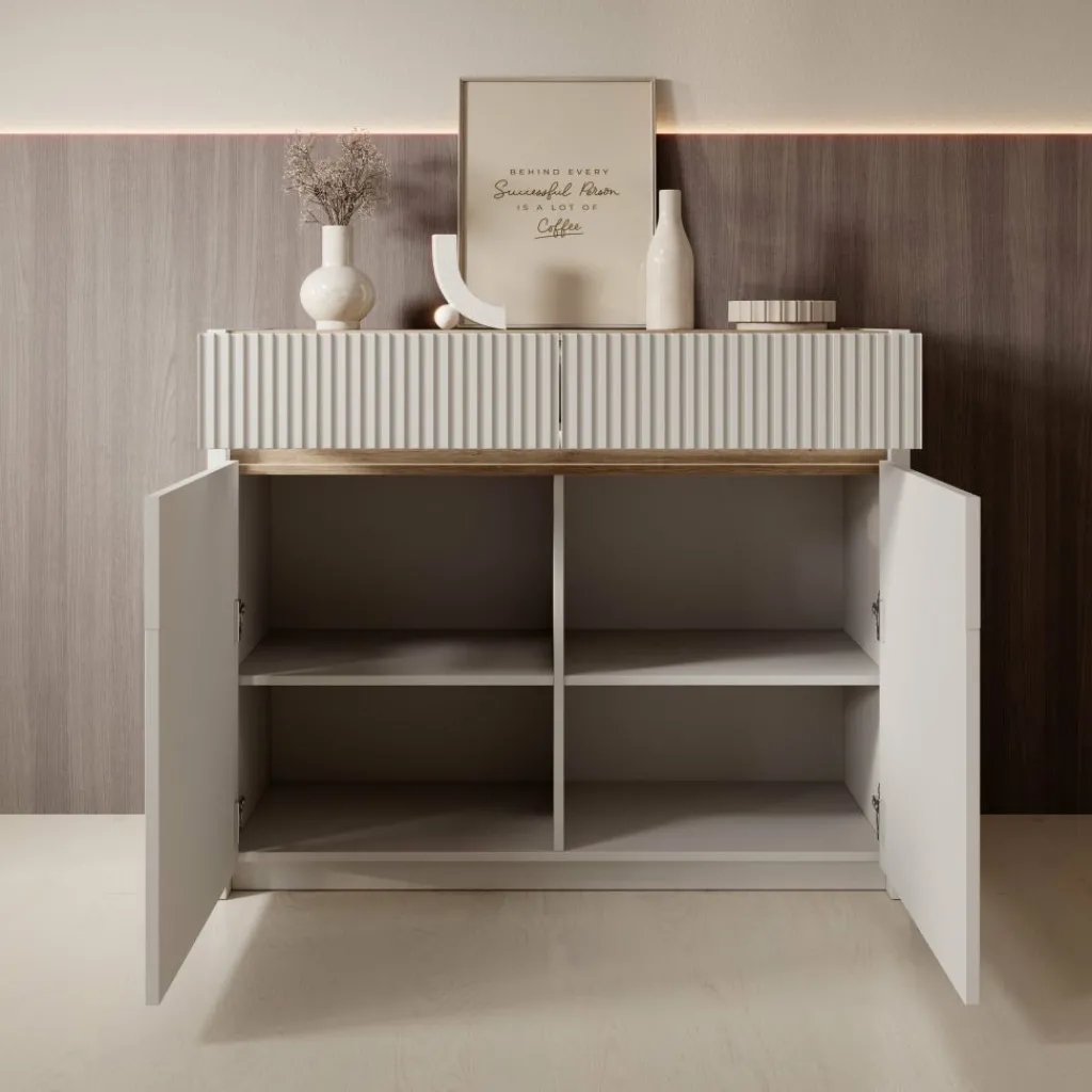 Het meubel beschikt over twee lades aan de bovenzijde, geschikt voor kleinere spullen die je netjes wilt opbergen. Elke lade heeft een binnenmaat van ongeveer 33 cm breed, 43 cm diep en 9 cm hoog. Onder de lades bevinden zich twee deuren met daarachter vier opbergvakken, verdeeld over twee niveaus. Hierdoor kun je servies, accessoires of andere spullen overzichtelijk opbergen.