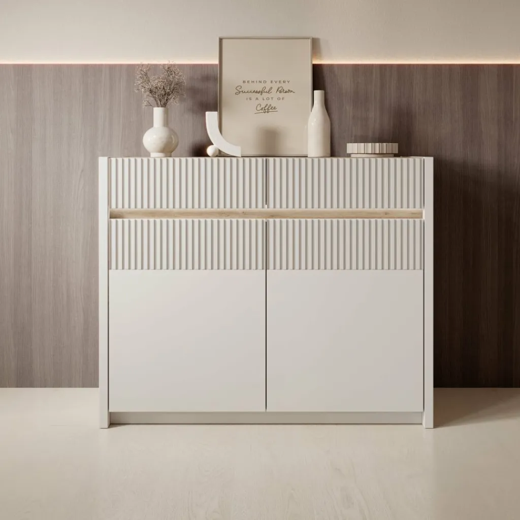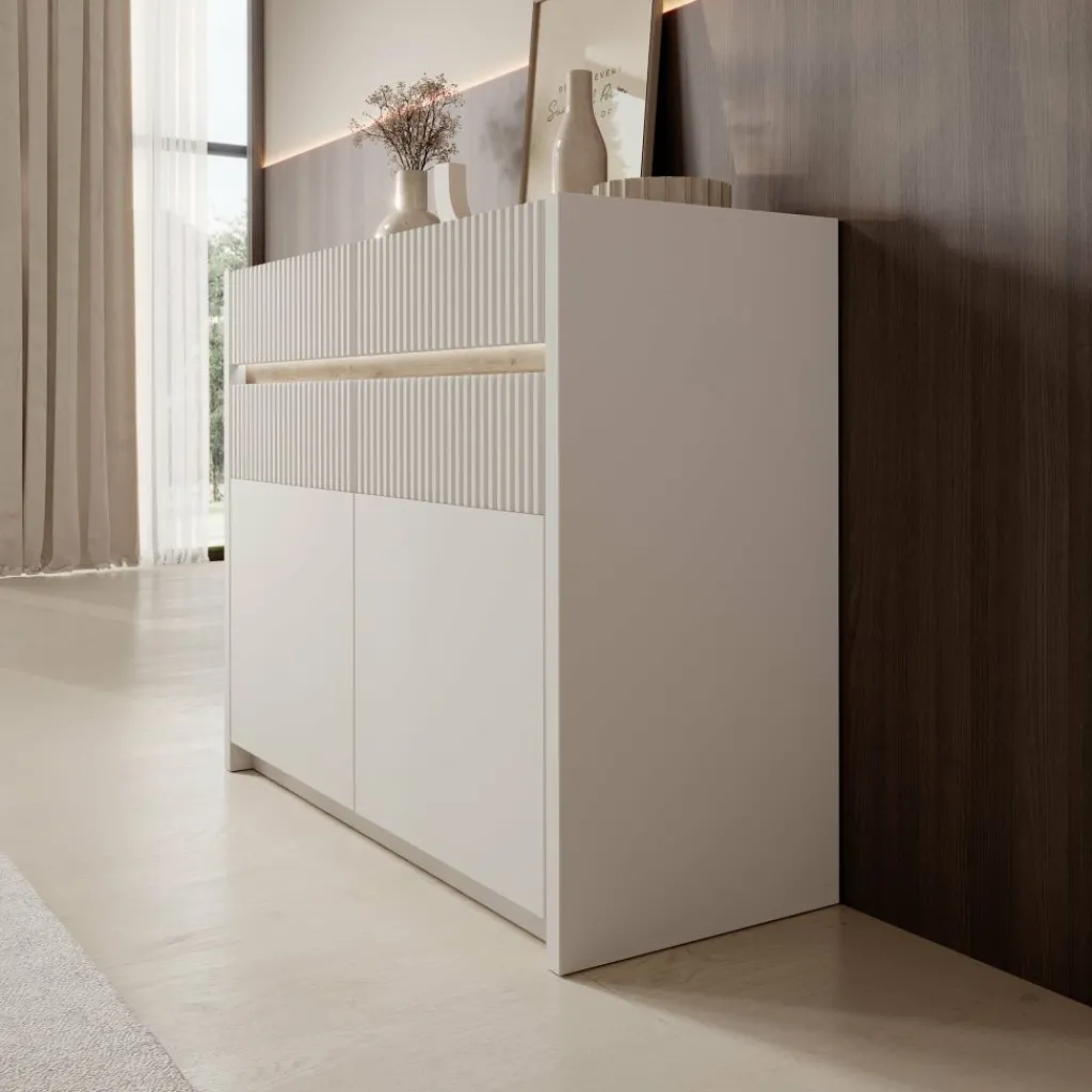 In het midden van het dressoir bevindt zich geïntegreerde LED-verlichting die zorgt voor een subtiel lichteffect. De verlichting is eenvoudig te bedienen met een voetschakelaar.