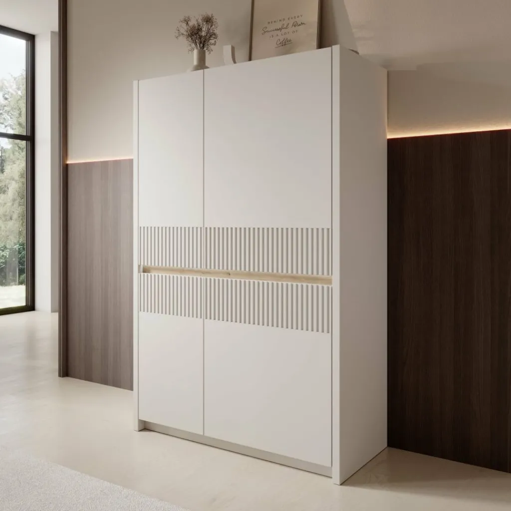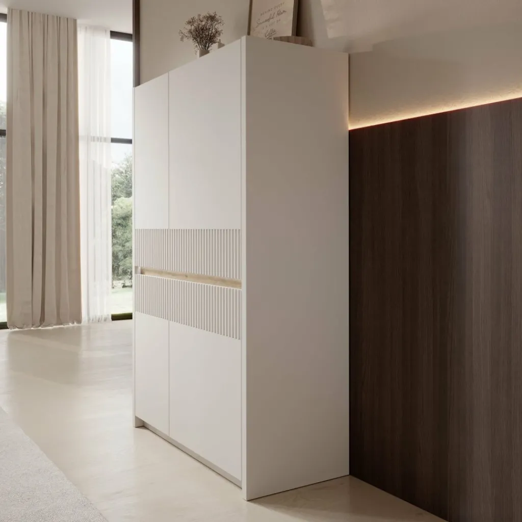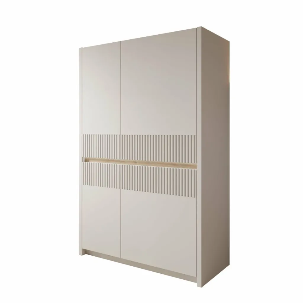 Het Orlano dressoir is uitgevoerd in een beige kleur en heeft een strak front met verticale reliëfdetails. De houtlook accentstrook in het midden vormt een subtiel contrast met de lichte kast. Het frame van het meubel is gemaakt van spaanplaat en de geribbelde inzetstukken zijn gemaakt van MDF. Met een afmeting van 95 x 42 x 147 cm biedt dit meubel praktische opbergruimte en kan het goed worden geplaatst in bijvoorbeeld de woonkamer, eetkamer of hal.