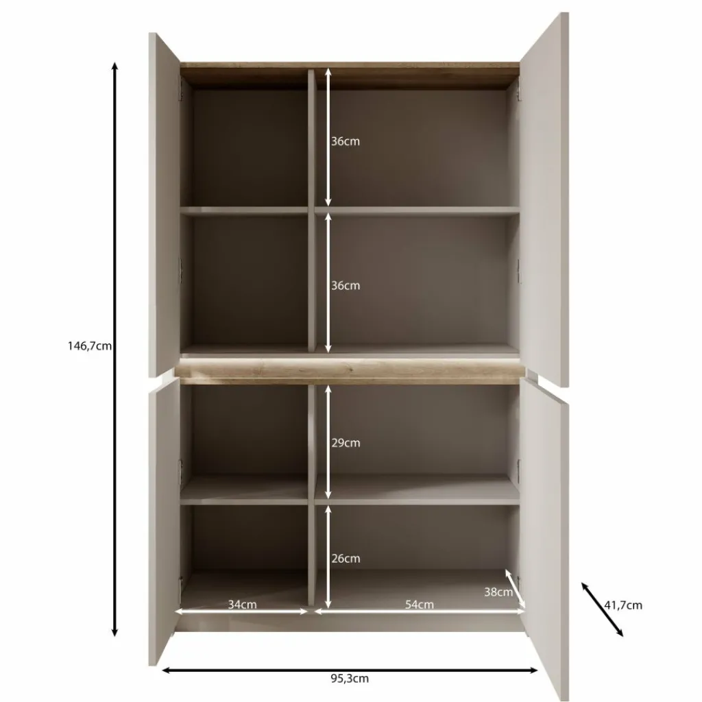 Het dressoir beschikt over vier deuren. Achter de deuren bevinden zich meerdere opbergvakken verdeeld over verschillende niveaus, waardoor je servies, accessoires of andere spullen overzichtelijk kunt opbergen.