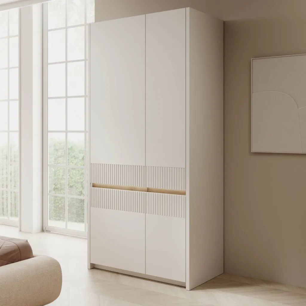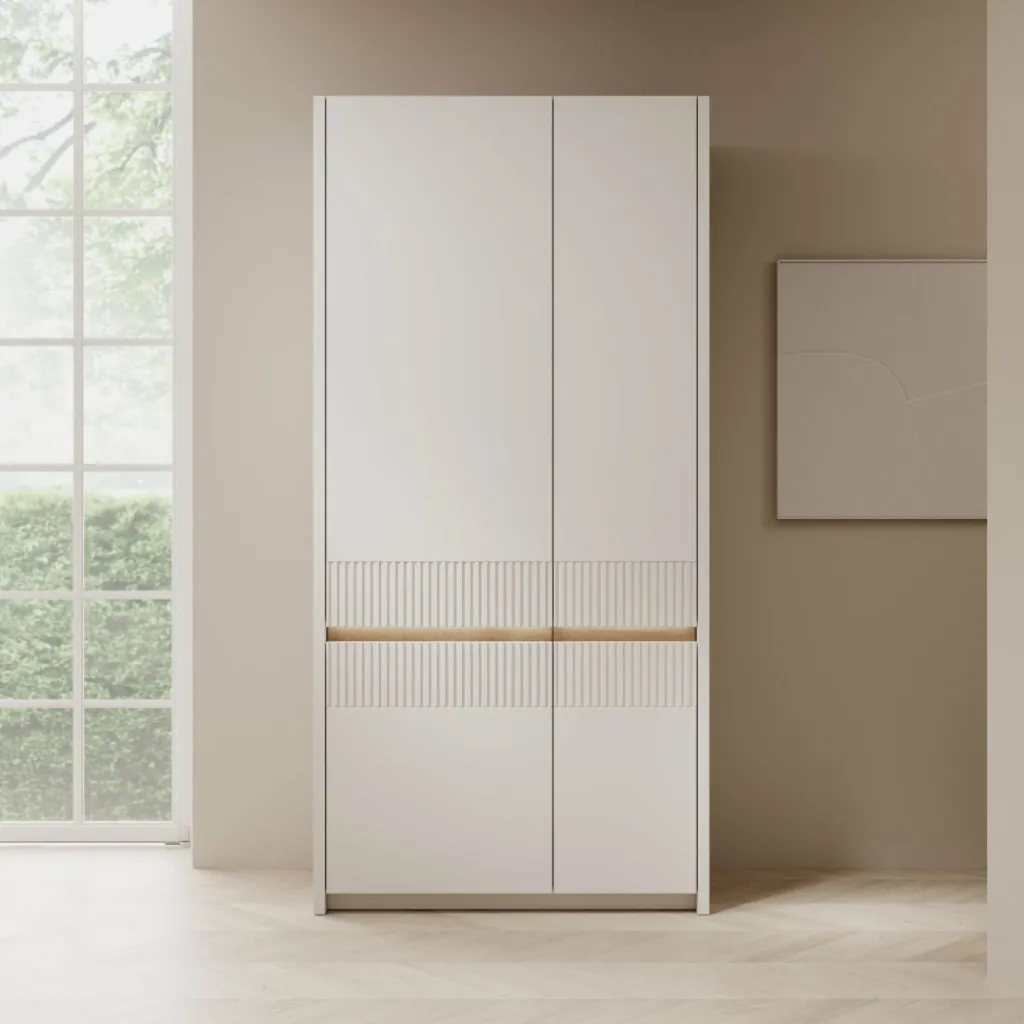 De Orlano kledingkast is een praktische kast met een overzichtelijke indeling voor het opbergen van kleding en accessoires. De kast is uitgevoerd in beige en heeft een strak front met subtiele verticale ribbels en een horizontaal accent in houtkleur. Het frame van het meubel is gemaakt van spaanplaat en de geribbelde inzetstukken zijn gemaakt van MDF. Hierdoor krijgt het meubel een rustige en moderne uitstraling die goed past in verschillende slaapkamers.