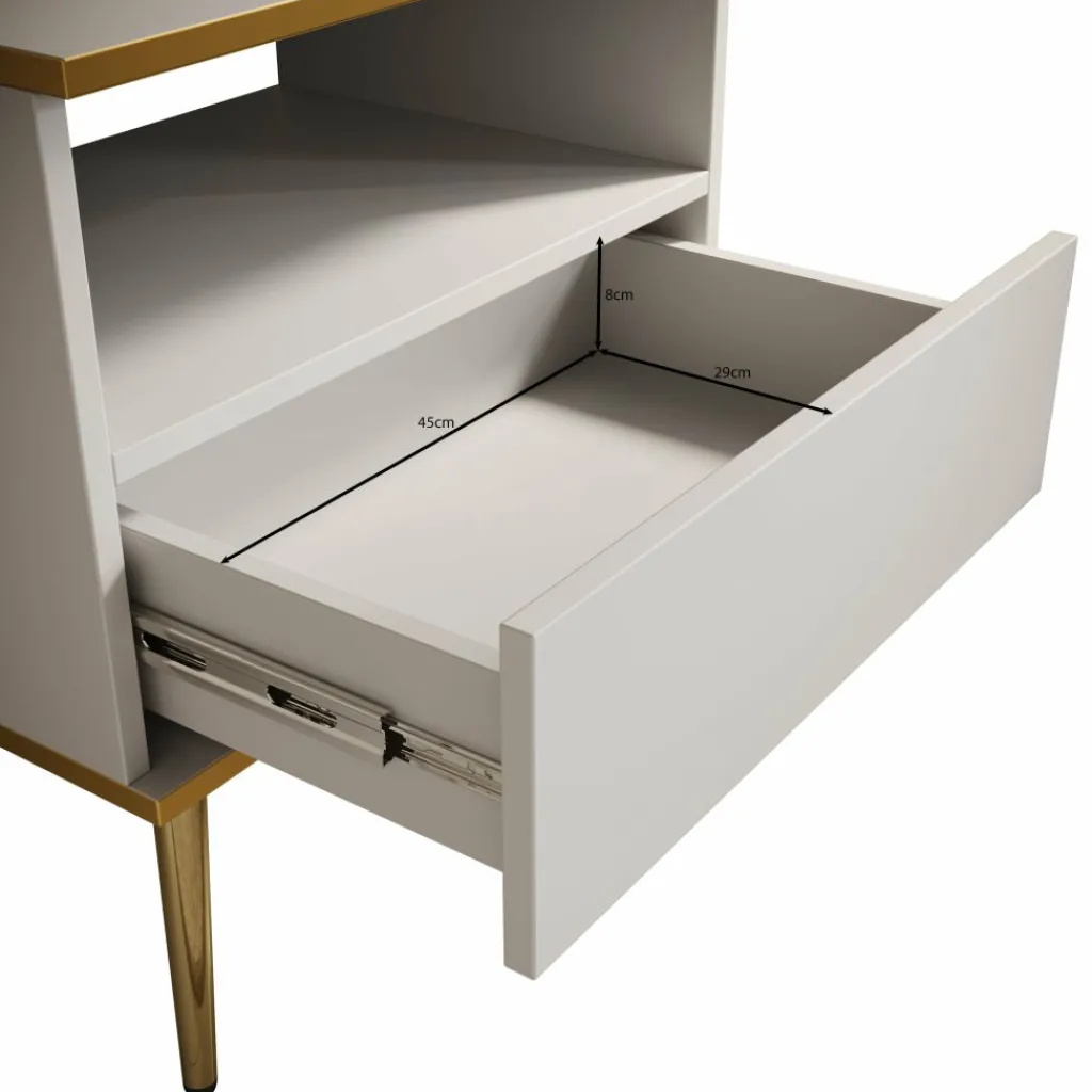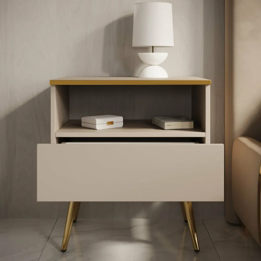 Het open vak biedt ruimte voor een boek, telefoon of decoratief item, terwijl de lade ideaal is voor het opbergen van kleinere spullen zoals opladers of verzorgingsproducten. De slanke, goudkleurige poten geven het geheel een luchtige en verfijnde uitstraling.