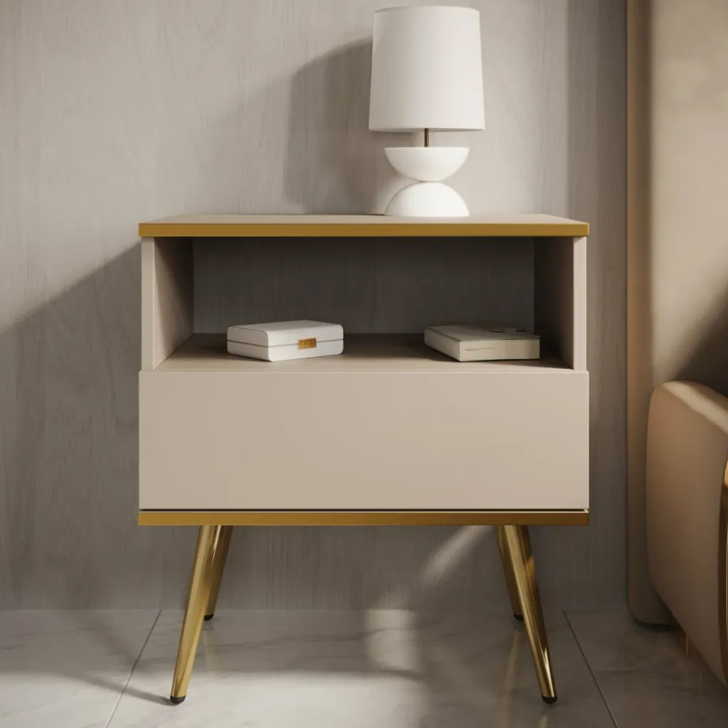 Nachtkastje Orleans combineert luxe uitstraling met praktische opbergruimte. De beige-gouden afwerking en het moderne design maken dit nachtkastje een elegante toevoeging aan elke slaapkamer. Dankzij het compacte formaat van 54 cm breed past het moeiteloos naast elk bed.