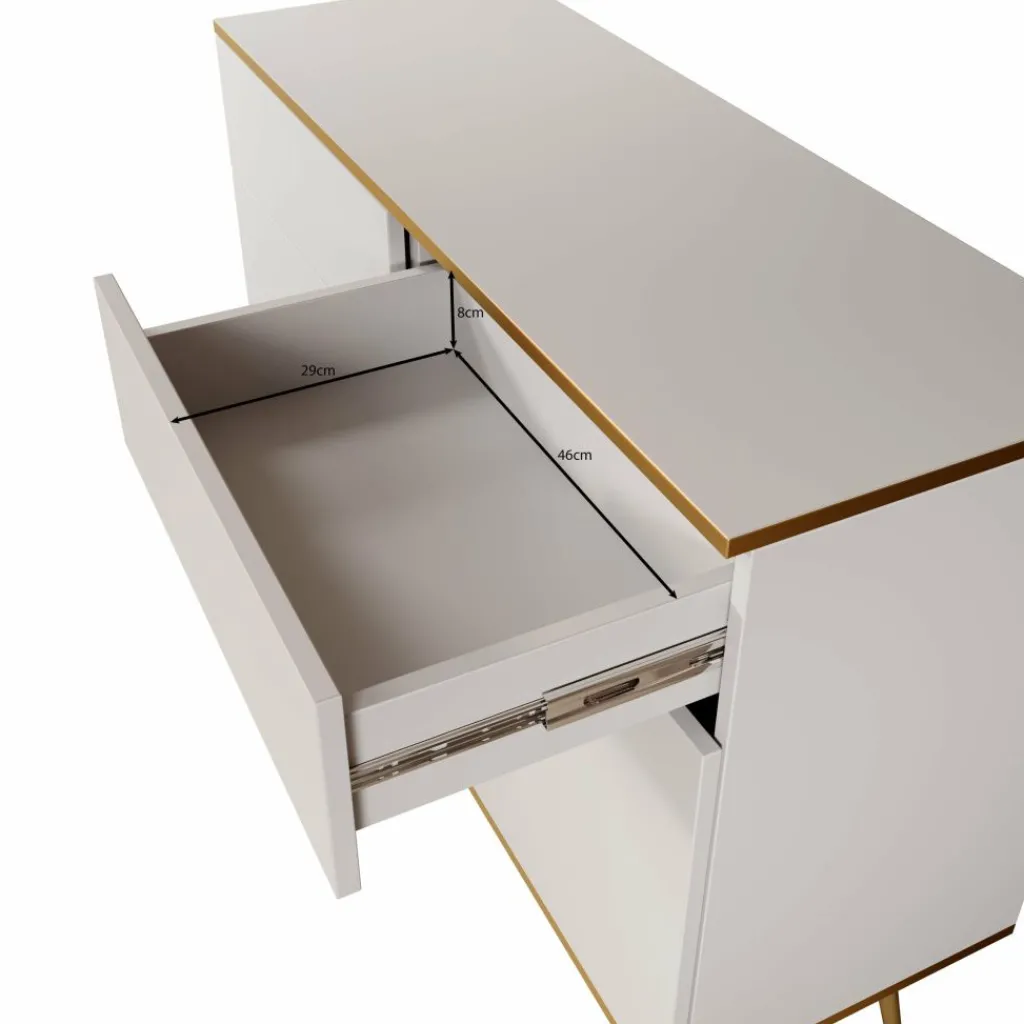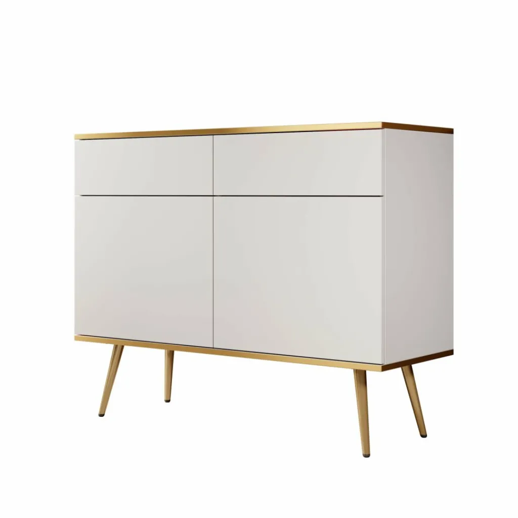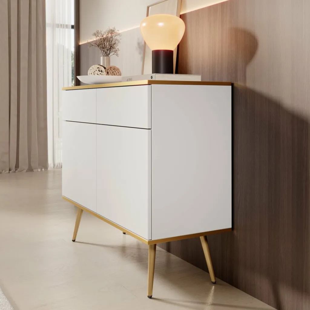 Dressoir Orleans is een stijlvolle opbergkast met een moderne uitstraling. De kast is uitgevoerd in wit met gouden accenten en staat op slanke, metalen pootjes.