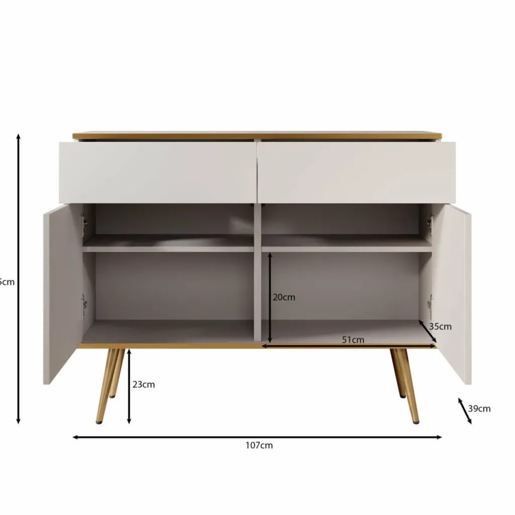 Het meubel is 107 cm breed en voorzien van twee lades en twee deuren. Achter de deuren bevinden zich vier opbergvakken, elk met een tussenplank. Ideaal voor het netjes opbergen van servies, documenten of andere spullen. De lades zijn geschikt voor kleinere items en schuiven soepel open dankzij het metalen geleidesysteem. Het dressoir is gemaakt van spaanplaat en afgewerkt met melamine, wat zorgt voor een onderhoudsvriendelijk oppervlak.