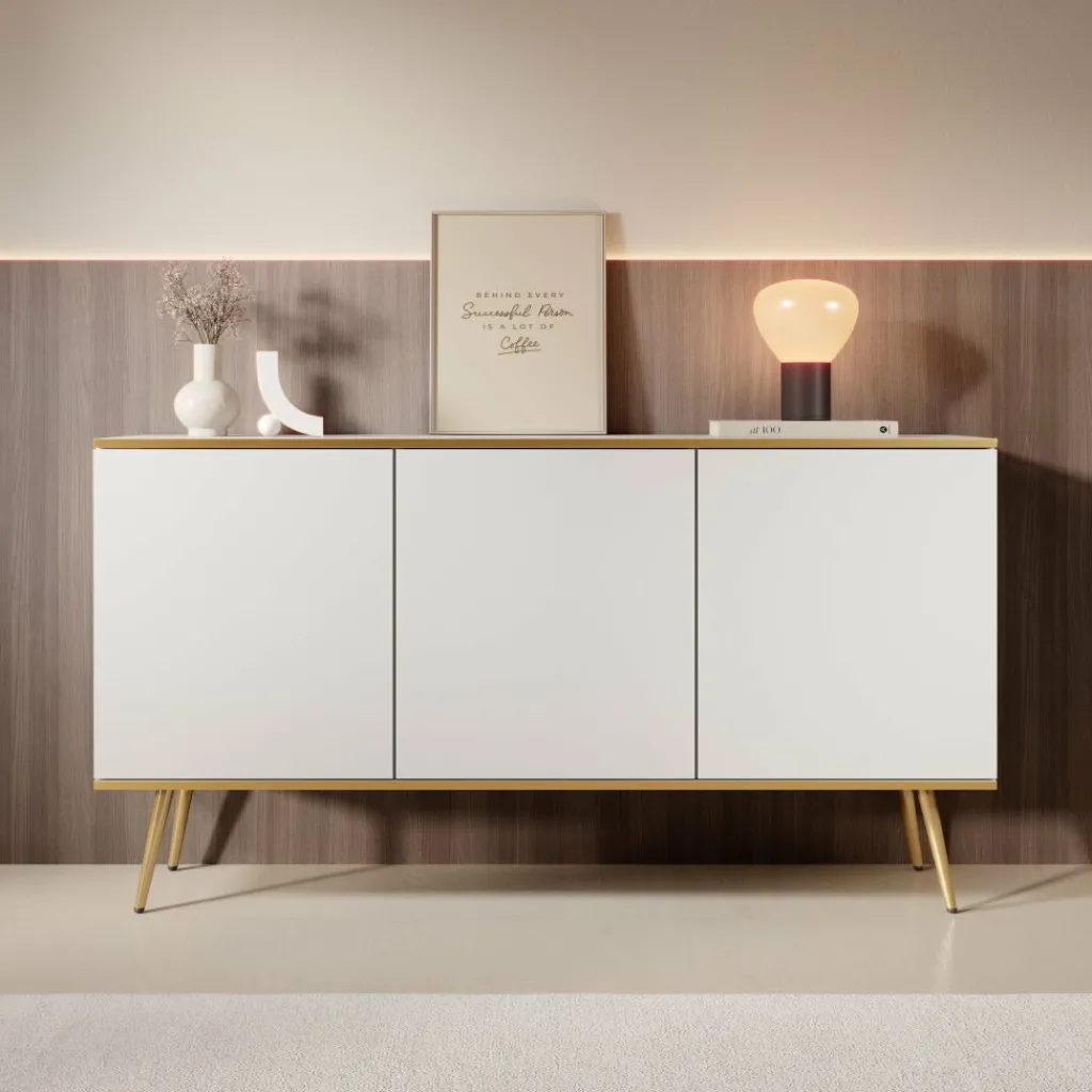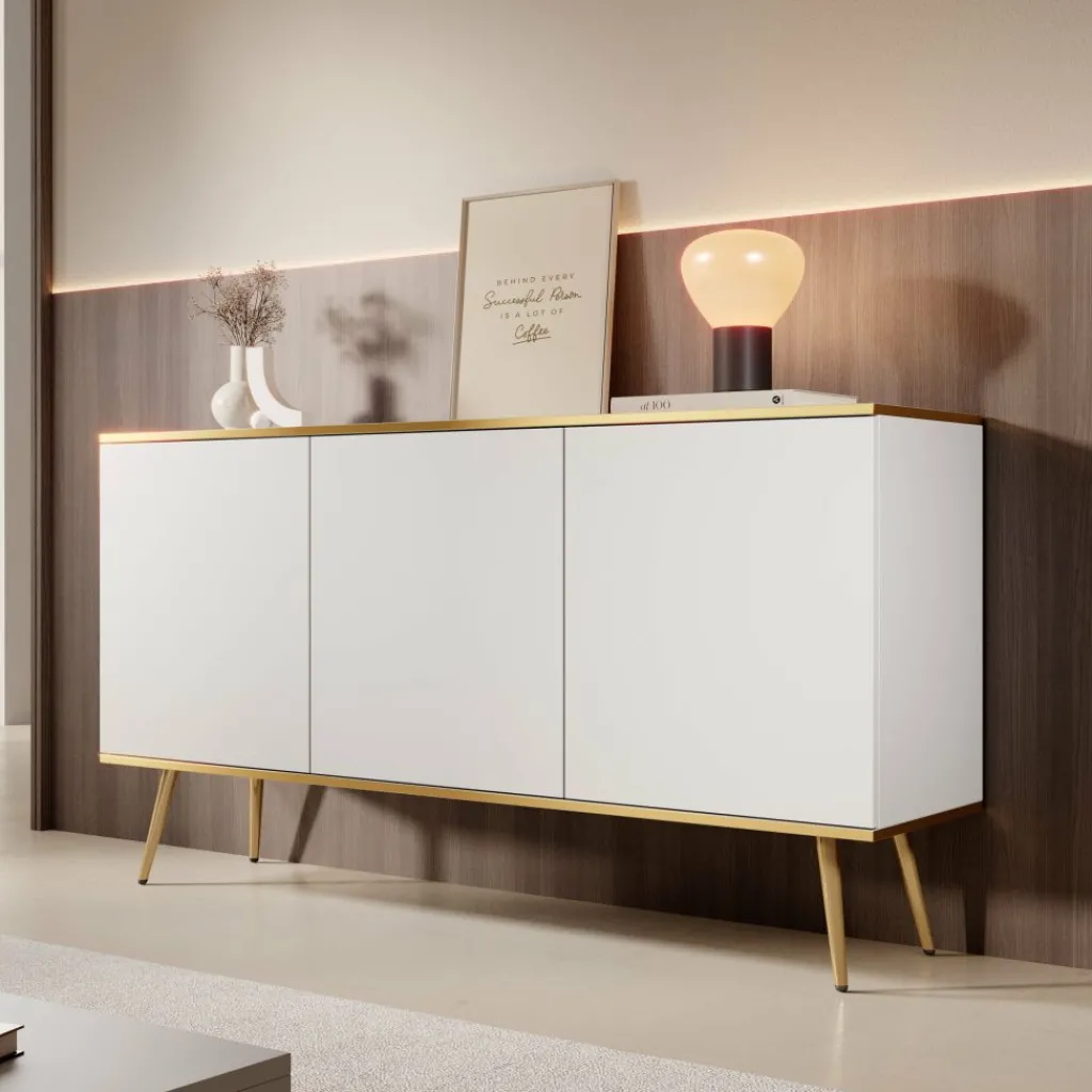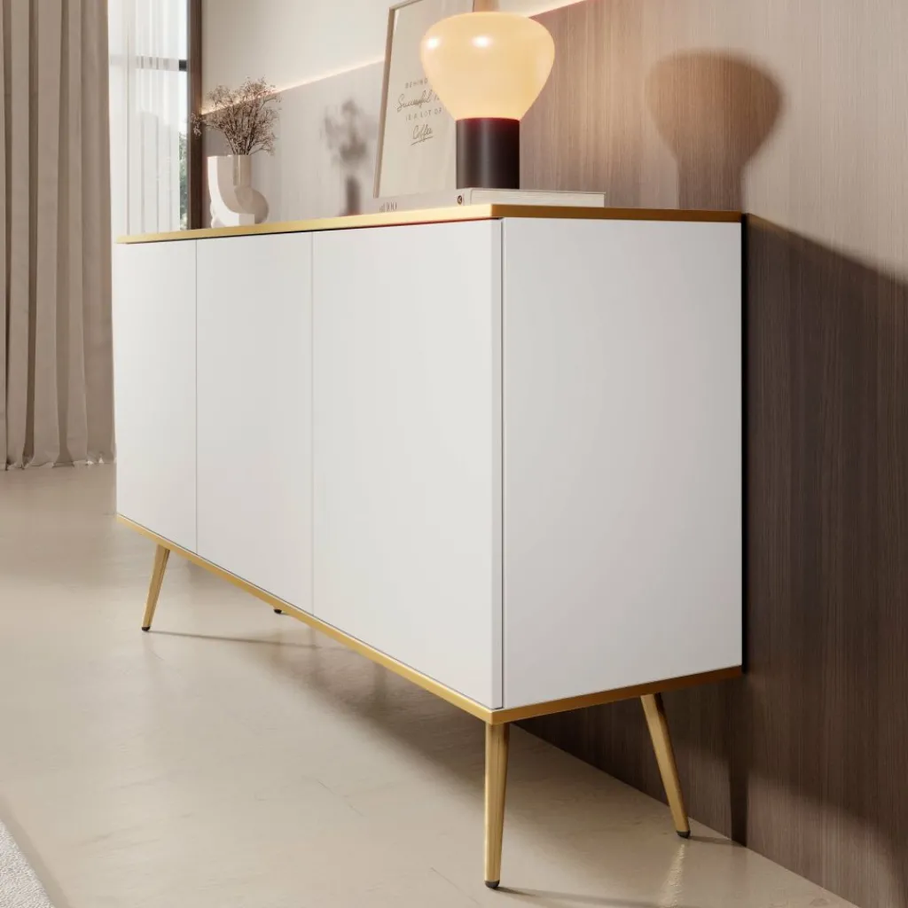 Dressoir Orleans is een modern vormgegeven kast in een frisse witte kleur met goudkleurige accenten.