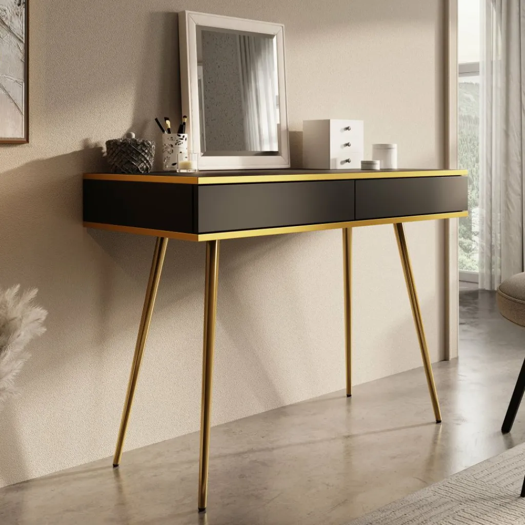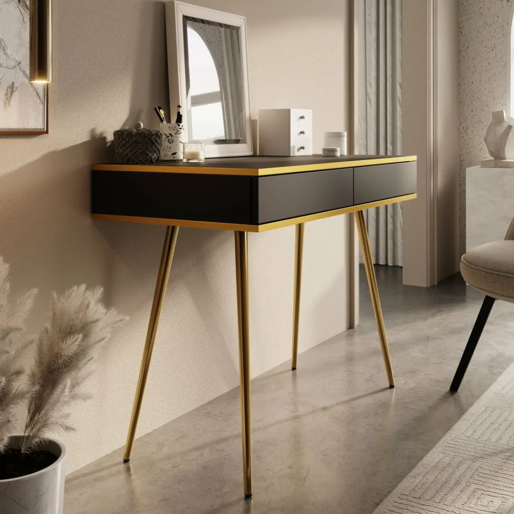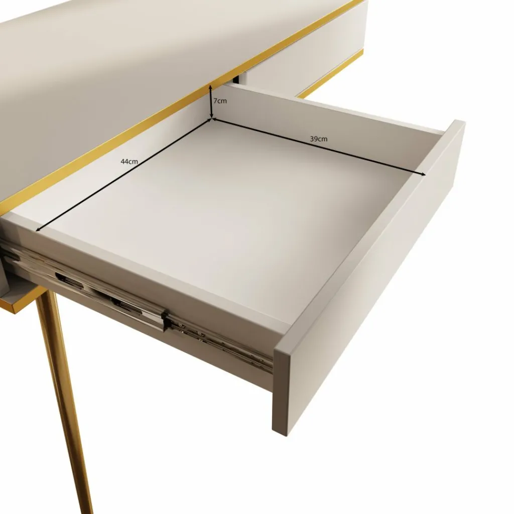 De kaptafel rust op slanke, hoge goudkleurige poten, wat zorgt voor een luchtige uitstraling en tegelijkertijd voldoende ruimte onder het meubel biedt.