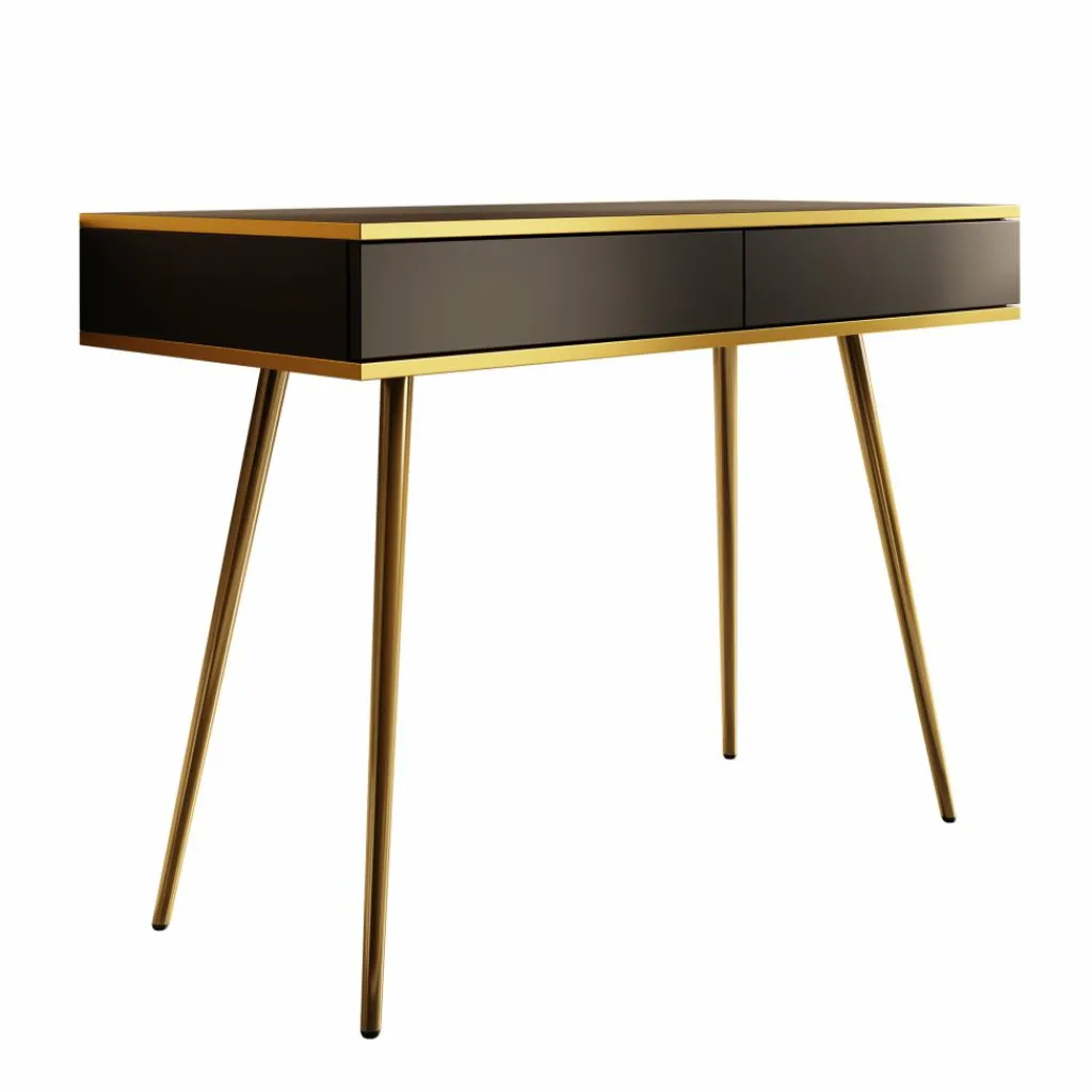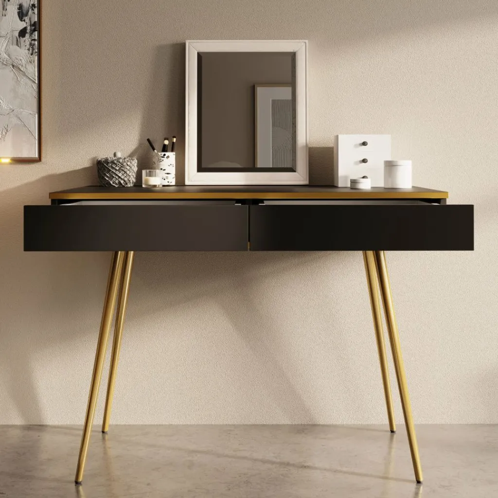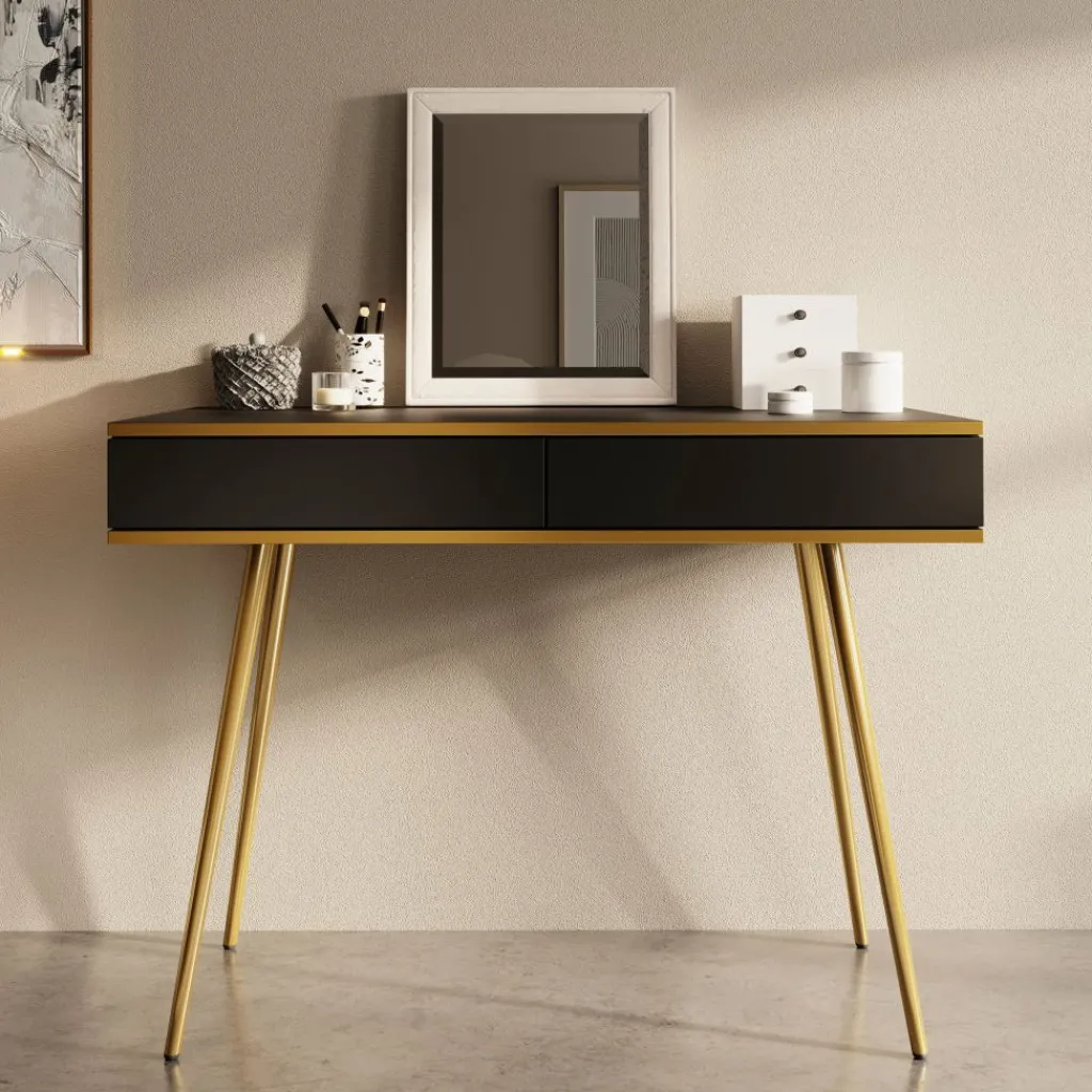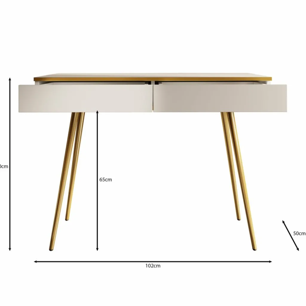 De kaptafel rust op slanke, hoge goudkleurige poten, wat zorgt voor een luchtige uitstraling en tegelijkertijd voldoende ruimte onder het meubel biedt.