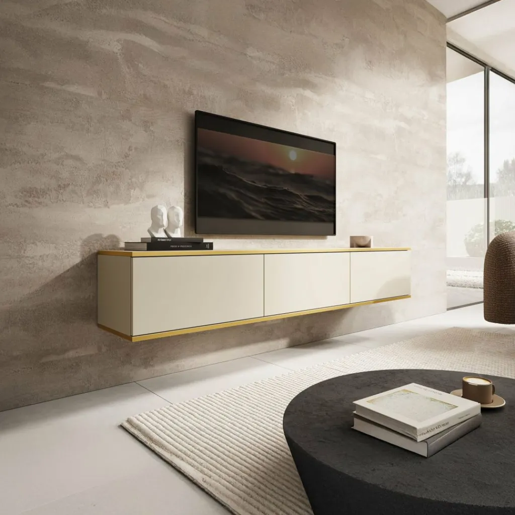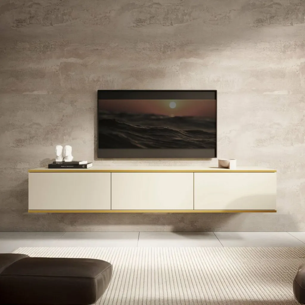 TV-Meubel Orleans in beige is met zijn afmeting van 175 cm ideaal voor zowel kleine als grote woonkamers. De beige kleur zorgt voor een moderne en strakke uitstraling, terwijl de goudkleurige strips een hotel-chique gevoel toevoegen.