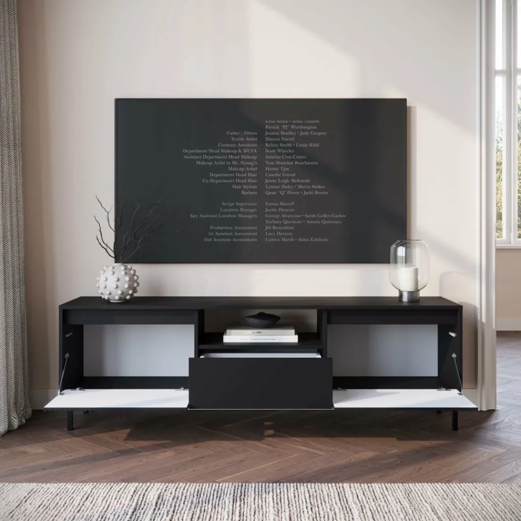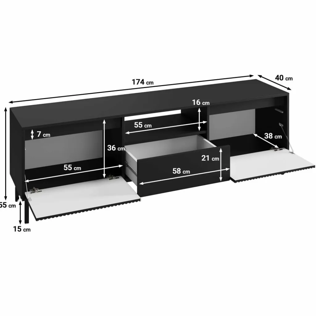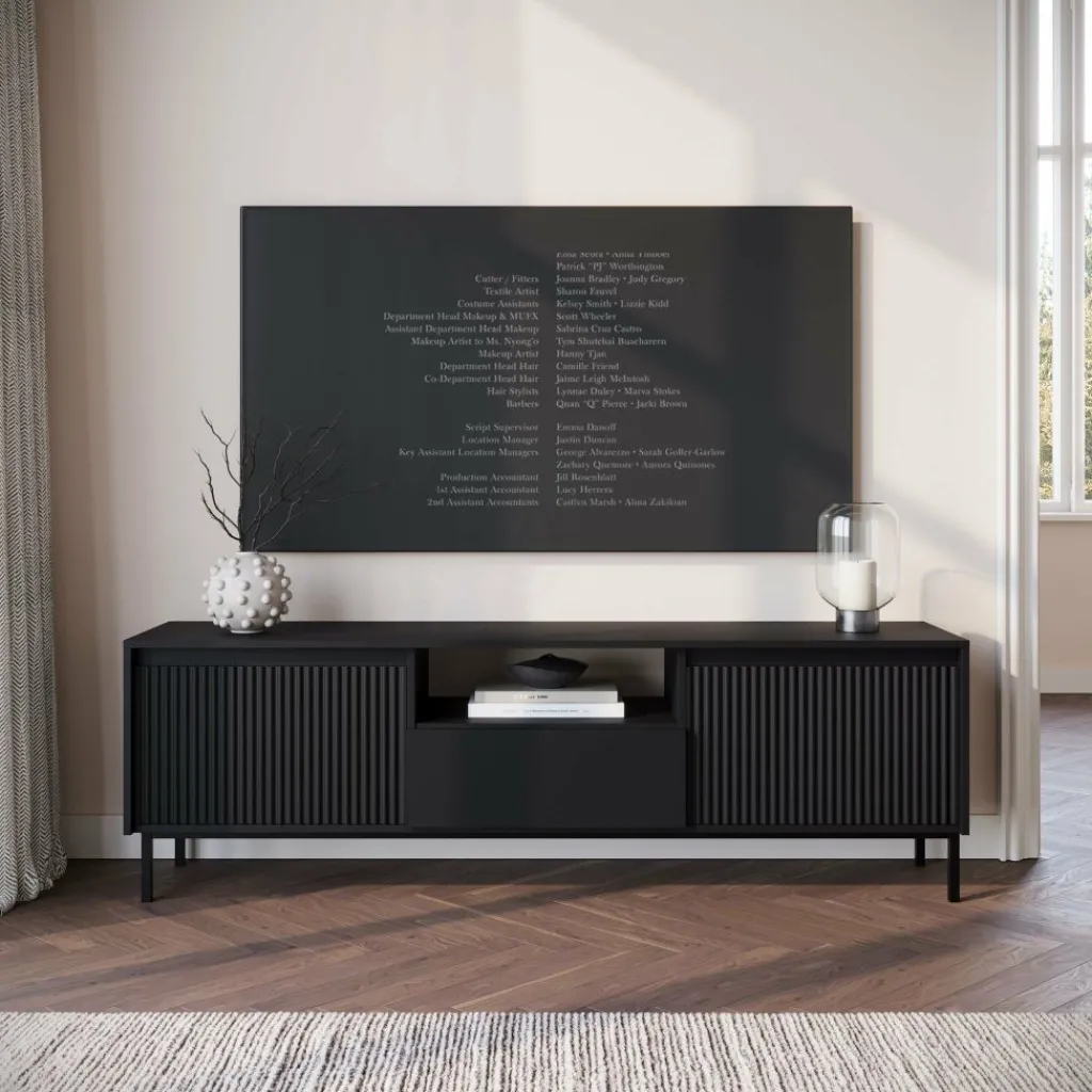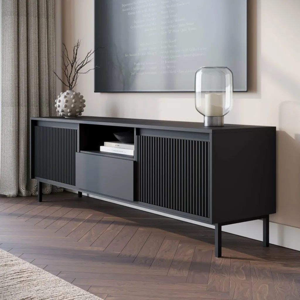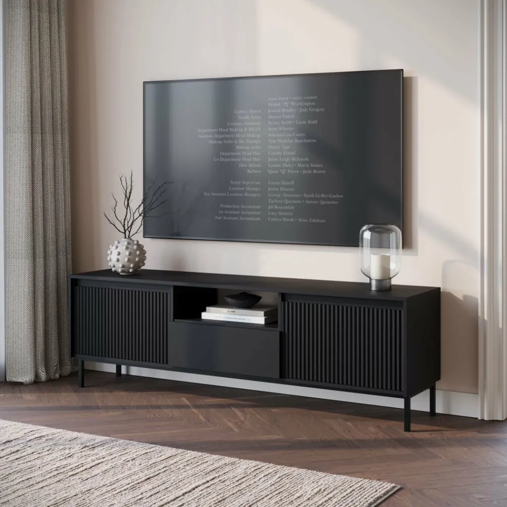 TV-Meubel Orvana is een opbergkast voor onder de tv in een hotelchique stijl. De TV-kast is gemaakt in een mat zwarte kleur met zwarte poten. Deze poten zijn gemaakt van metaal. TV-Meubel Orvana beschikt over 2 kleppen met een latten patroon op de voorkant waarachter in totaal 2 opbergvakken zitten. Tussen de deuren zit een lade en een open vak. De lade en deuren zijn te openen met het push to open systeem.