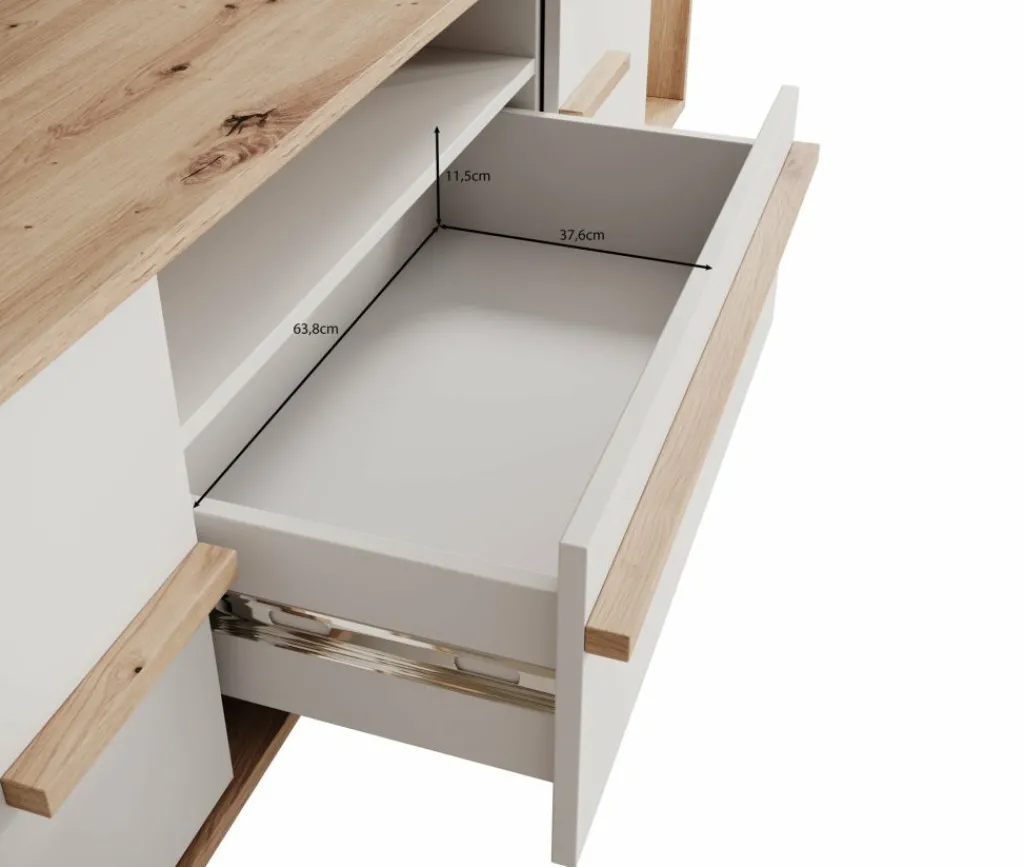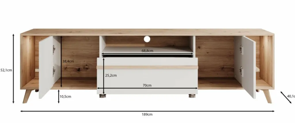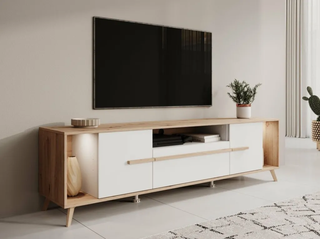 TV-Meubel Oswald is een opbergkast voor onder de tv in een moderne stijl. De TV-kast beschikt over 2 deuren en 1 lade. Deze lade en deuren openen met eiken kleurige handgrepen. Ook heeft dit model nog 3 open vakken waarvan het linkse en rechtse open vak worden verlicht met LED-verlichting. Achter het middelste open vak zit een uitsparing om eventuele bedrading weg te werken. Het meubel is uitgevoerd in de kleuren eiken met wit.