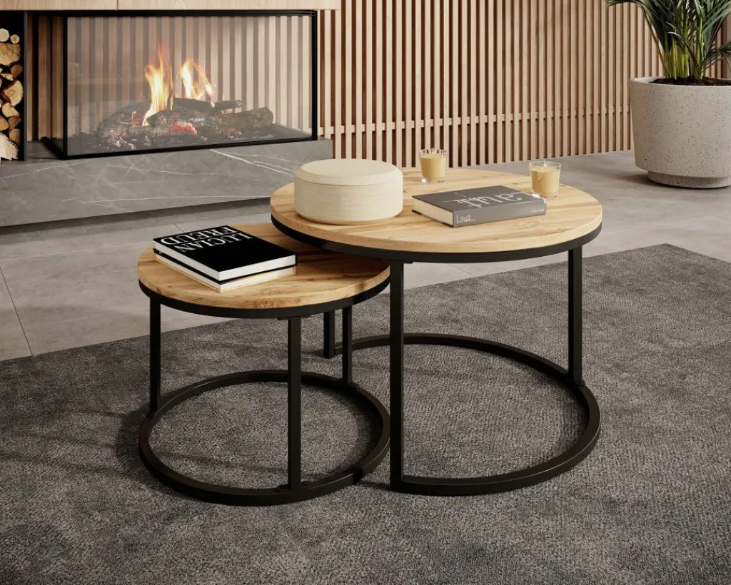 Salontafel Ovalo is een set van 2 salontafels met een industriele uitstraling. De set bestaat uit 2 ronde salontafels in verschillende afmetingen. De bovenkant van het blad heeft een eiken kleur.