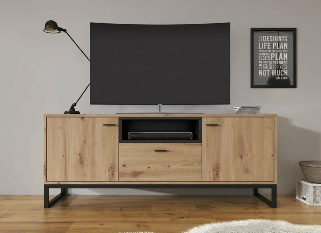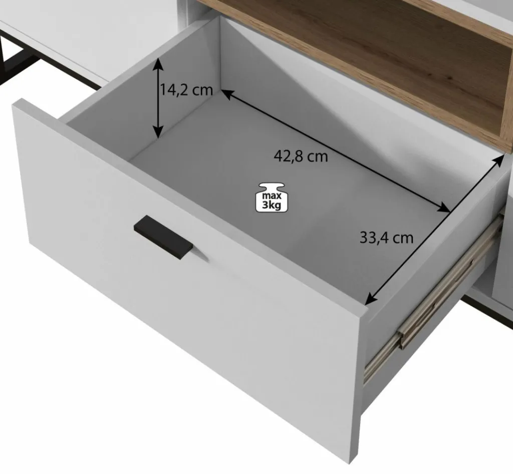 Dit tv-meubel beschikt over een handige opberglade. Daarnaast bevinden zich 2 opbergvakken welke afsluitbaar zijn met een klepdeur. Leuk detail is het open schap welke in een eiken kleur is uitgevoerd.