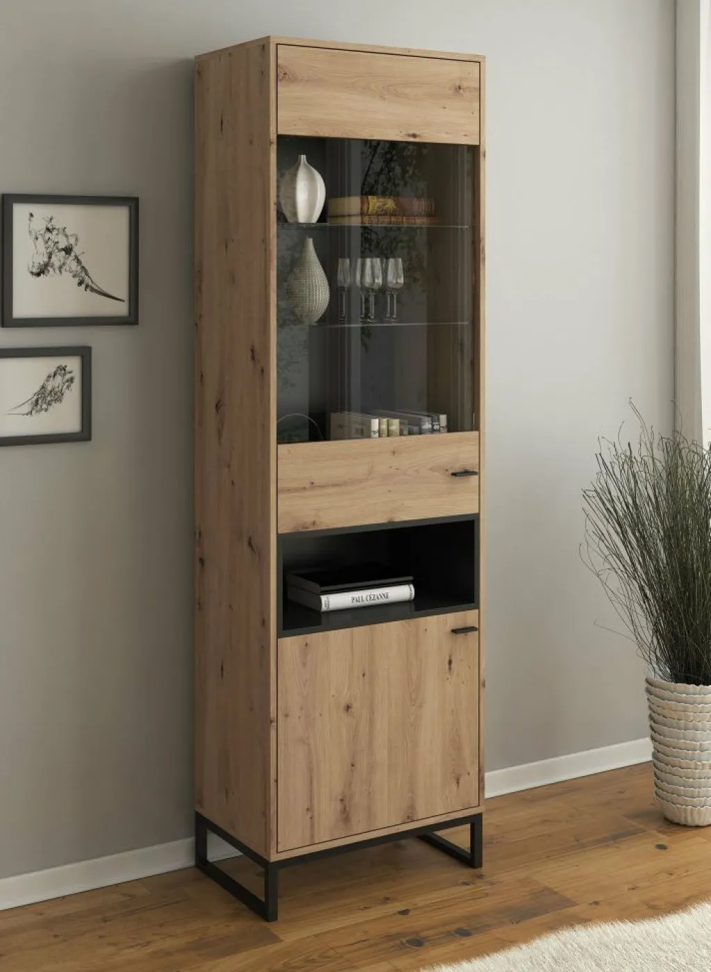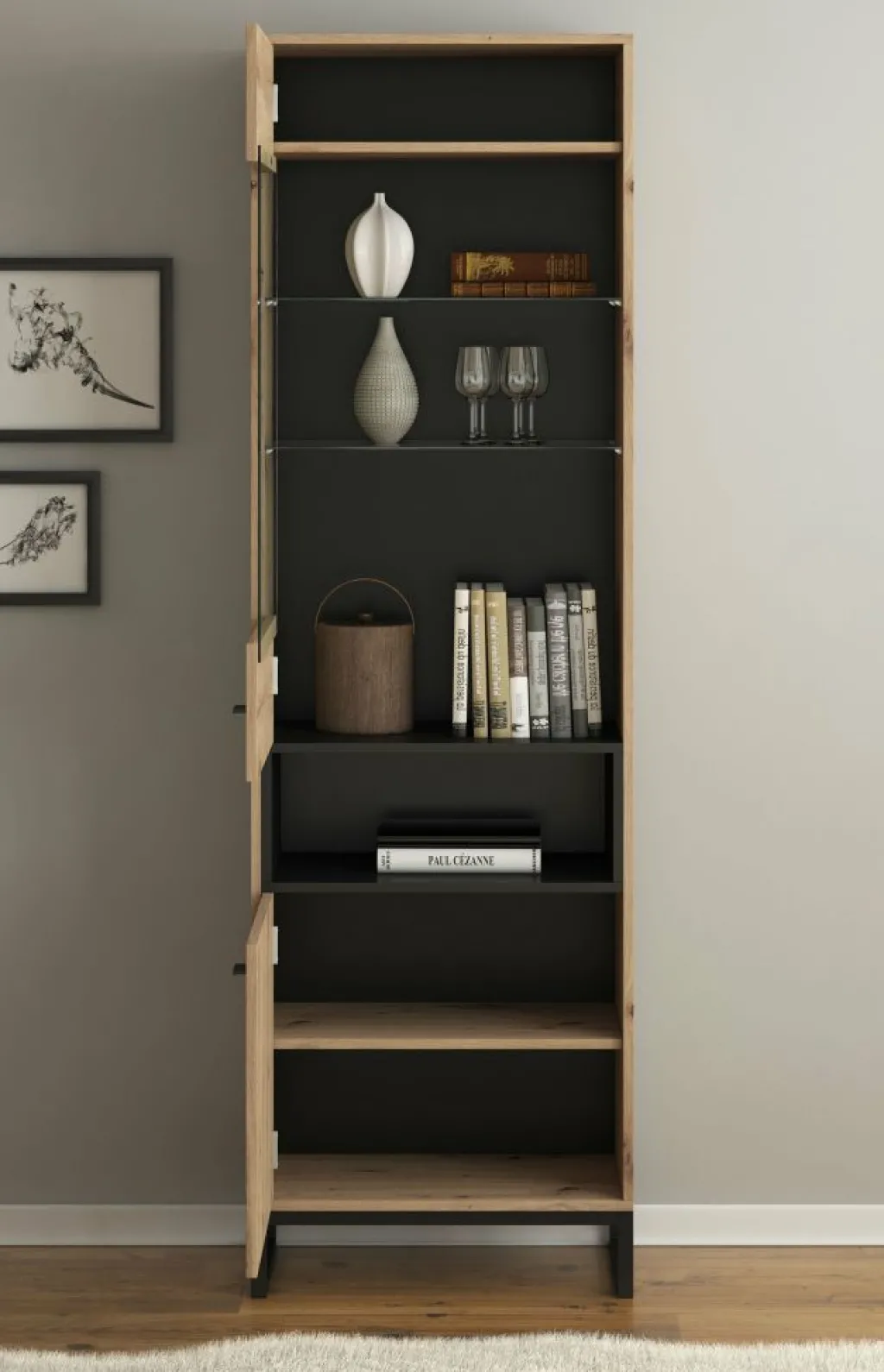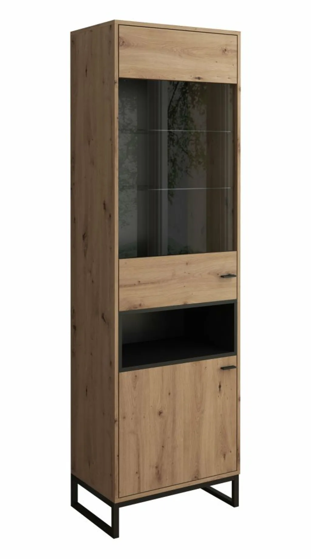 Vitrinekast Ozzy is een praktisch vormgegeven kast, in industriële stijl. Het betreft een dichte opbergkast met 2 openslaande deuren. In het midden van de kast bevindt zich een open schap. Het binnenwerk van deze staande kast bestaat uit vier legplanken, waarvan 2 zijn gemaakt van glas. Het meubel is uitgevoerd in de kleur eiken met zwart en staat op zwarte pootjes die 16 cm hoog zijn.