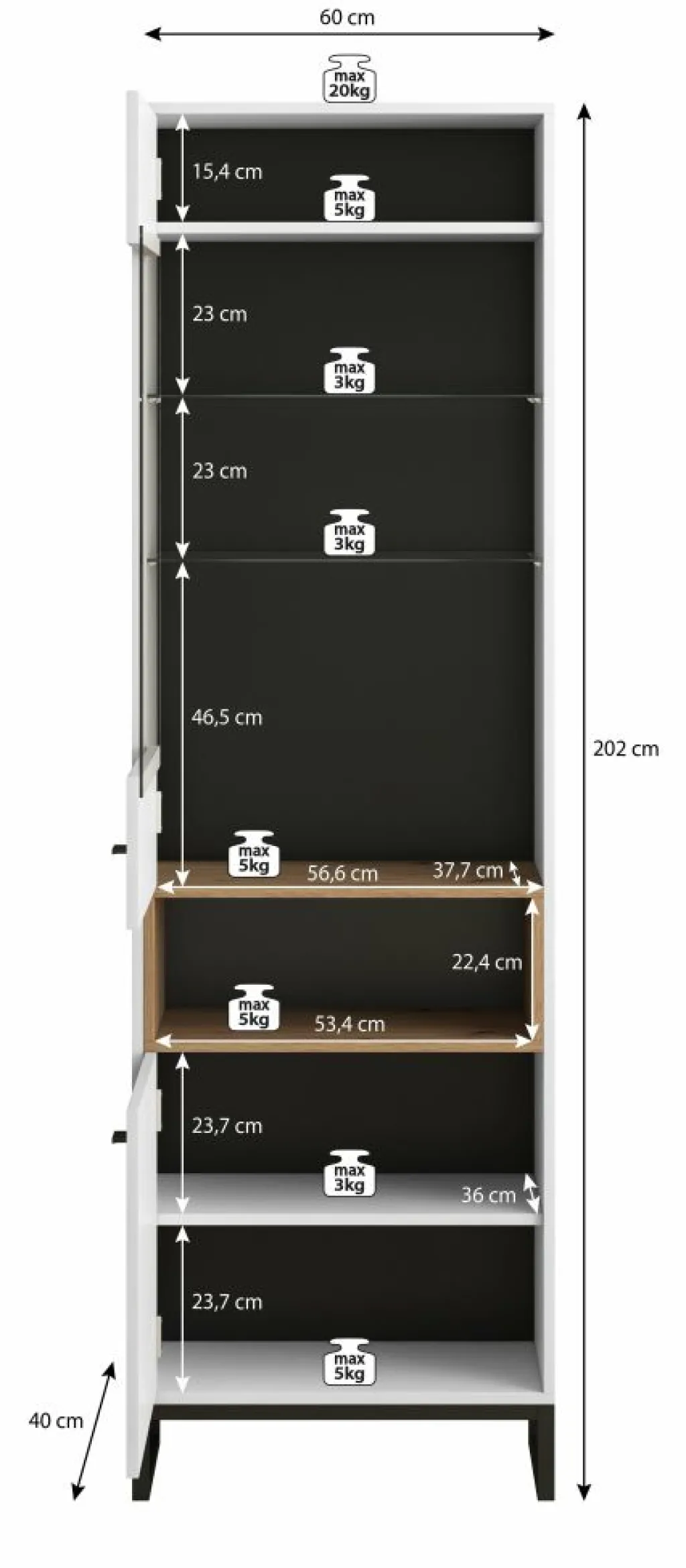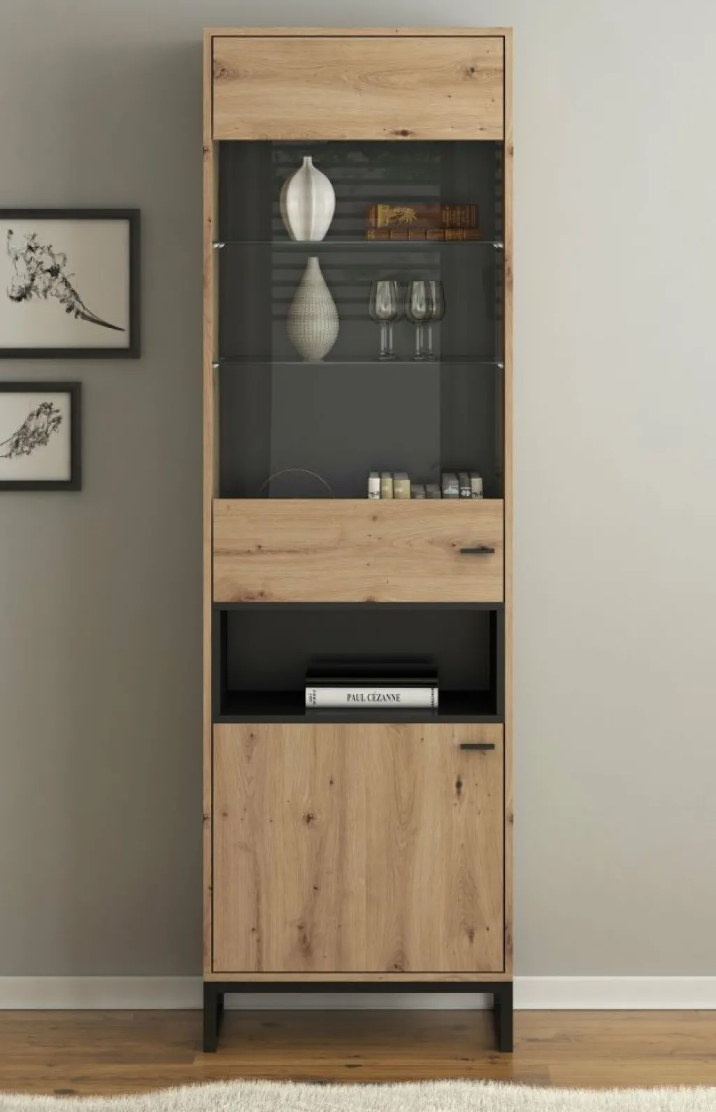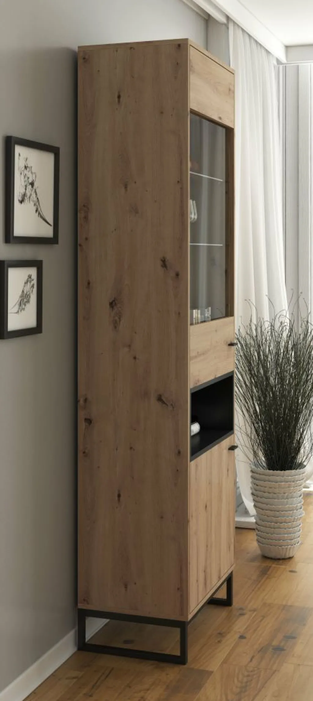 Vitrinekast Ozzy is een praktisch vormgegeven kast, in industriële stijl. Het betreft een dichte opbergkast met 2 openslaande deuren. In het midden van de kast bevindt zich een open schap. Het binnenwerk van deze staande kast bestaat uit vier legplanken, waarvan 2 zijn gemaakt van glas. Het meubel is uitgevoerd in de kleur eiken met zwart en staat op zwarte pootjes die 16 cm hoog zijn.