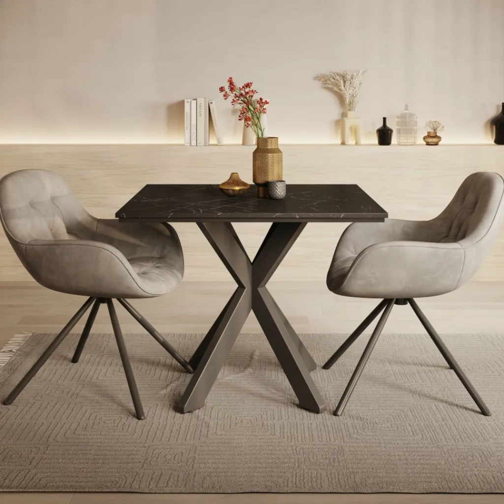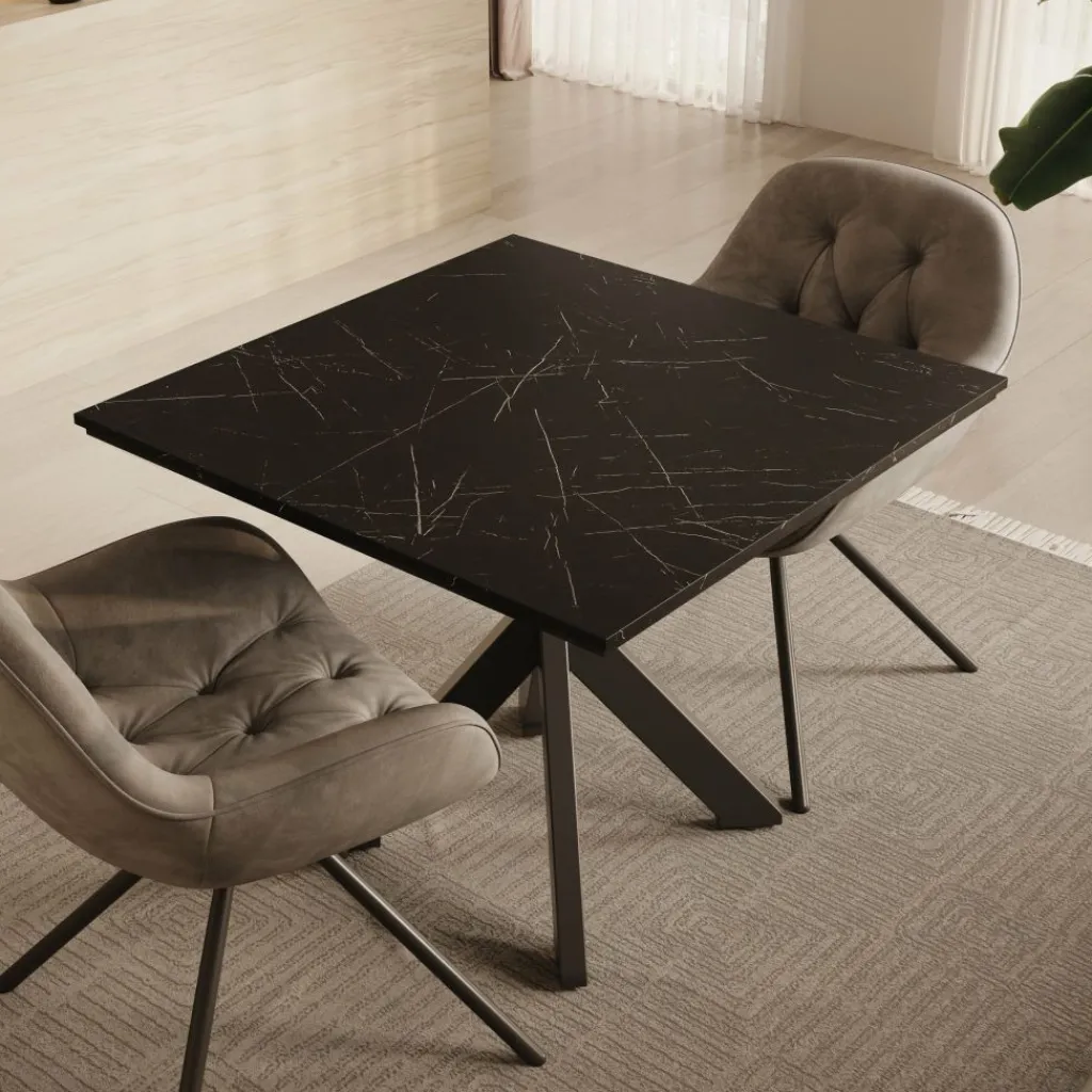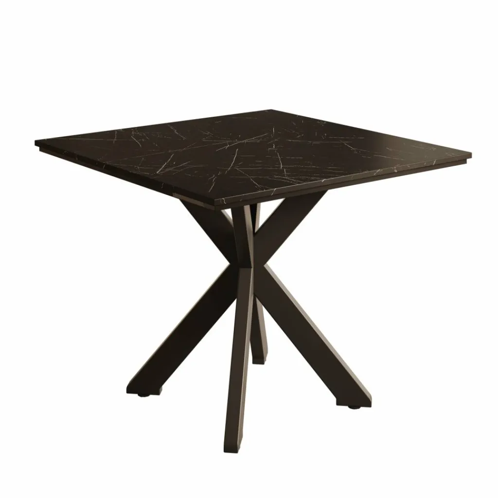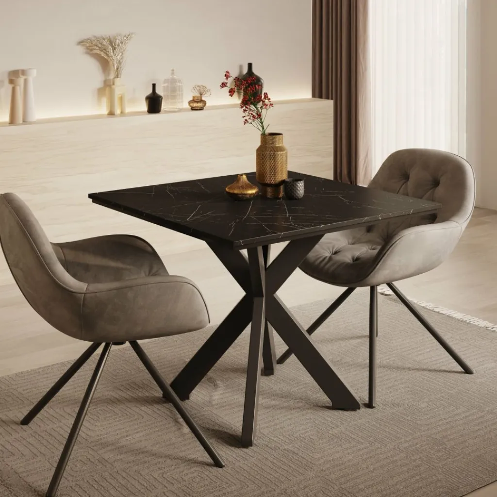 Eetkamertafel Pacey is een stijlvolle en compacte tafel met een luxe uitstraling. Met zijn afmetingen van 90x90x74 cm biedt de tafel voldoende plek voor 2 tot 4 personen, ideaal voor kleinere eetkamers of keukens. Het tafelblad is uitgevoerd in een zwart marmerlook, wat zorgt voor een chique en moderne uitstraling.