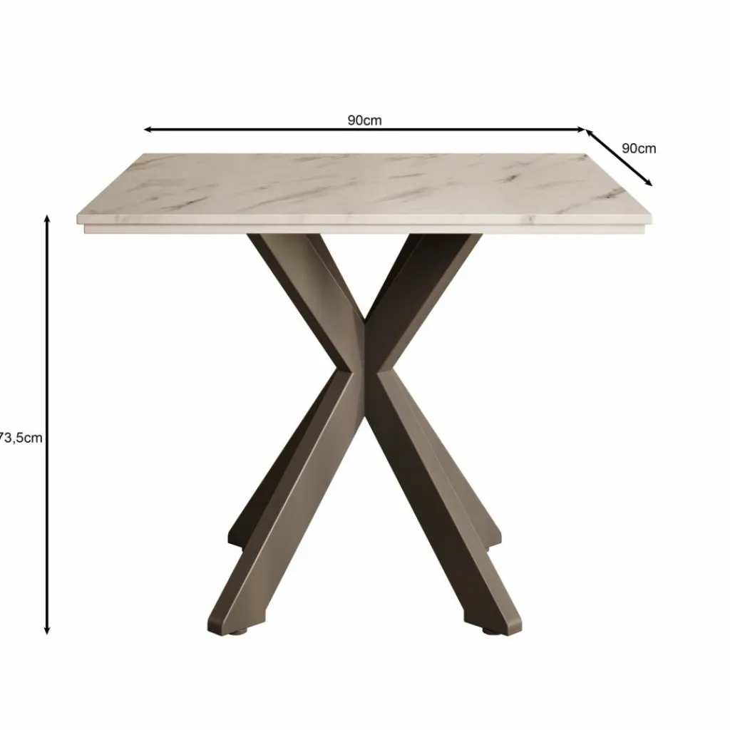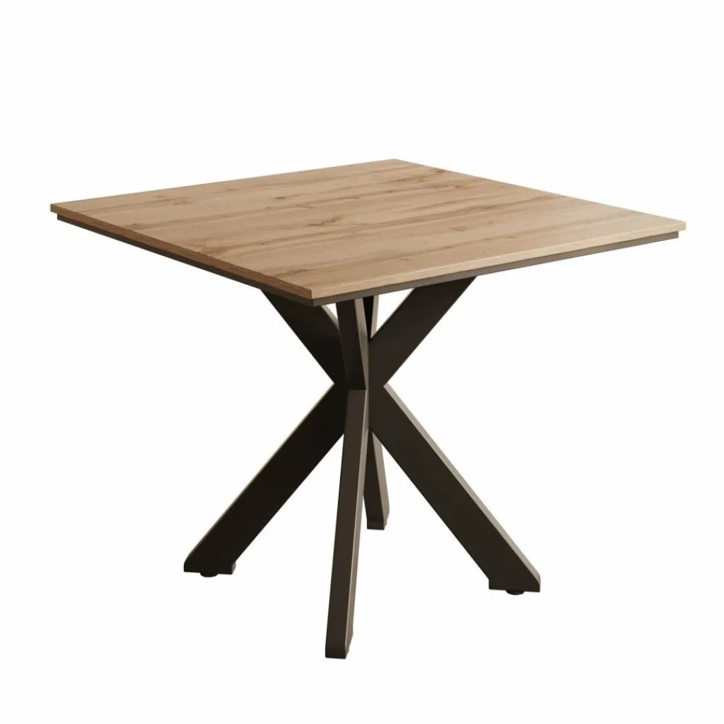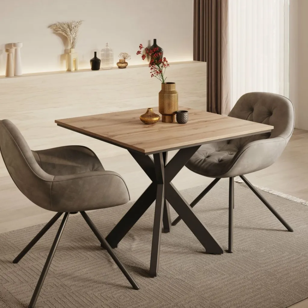 Eetkamertafel Pacey is een compacte en stijlvolle tafel die perfect past in kleinere eetkamers of keukens. Met zijn afmetingen van 90x90x74 cm biedt de tafel genoeg ruimte voor 2 tot 4 personen. Het tafelblad is uitgevoerd in een warme eiken kleur en rust op een modern zwart metalen kruisframe, wat zorgt voor stabiliteit en een stoere uitstraling.