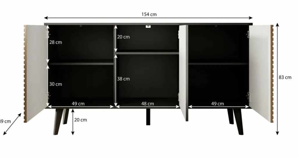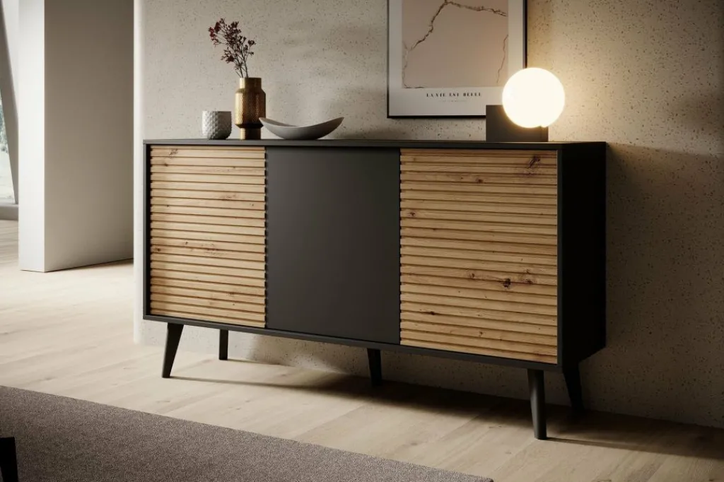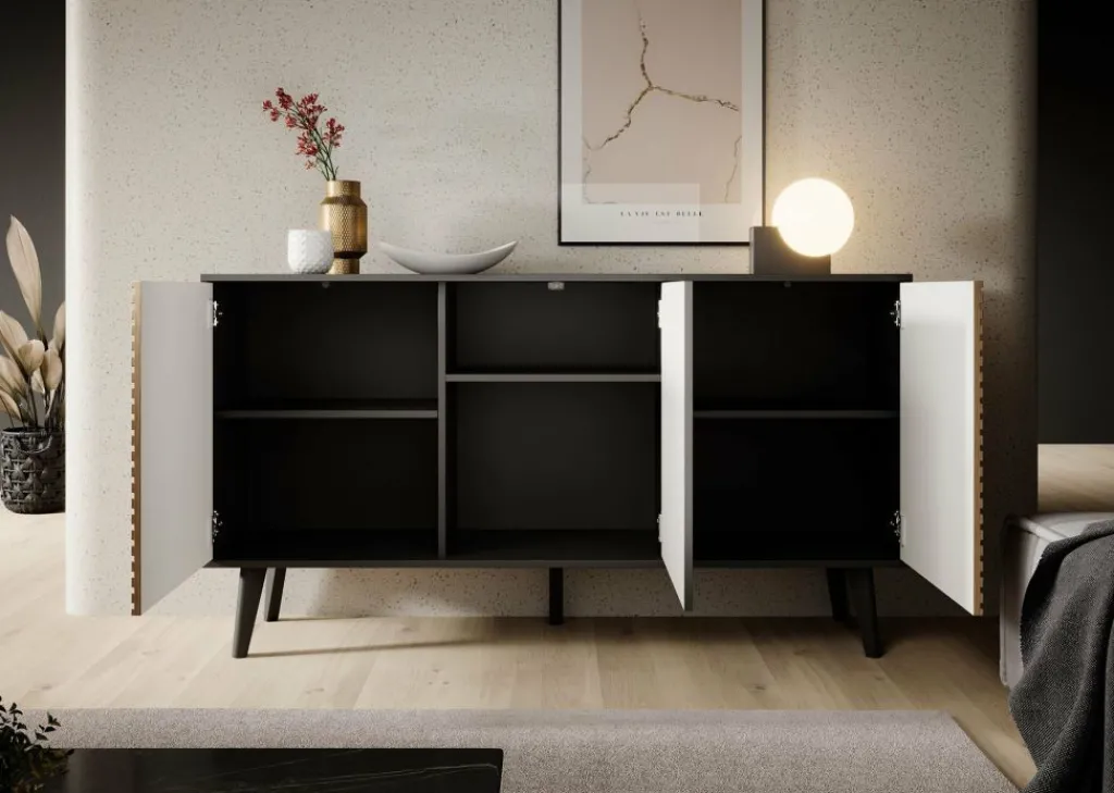Het Dressoir Palladium is afgewerkt in mat zwart en zwarte pootjes. Deze details geven het dressoir een industriële uitstraling. De deuren openen door middel van een tip-on systeem.