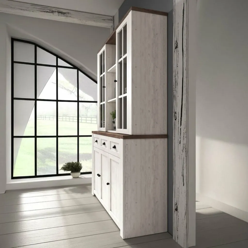 Buffetkast Parello is een staande buffetkast met ruime opbergmogelijkheden. Vanwege zijn landelijke uitstraling is de Parello passend in een landelijke, maar ook industriële of strakke living. De onderkant van de buffetkast beschikt over 3 deuren en 3 lades. De handgrepen zijn gemaakt van geborsteld staal en geven de kast een stoere look. Aan de bovenkant zijn 9 schappen geplaatst waarvan de buitenste voorzien zijn van deuren met glas. De buffetkast Parello is 130 cm breed.