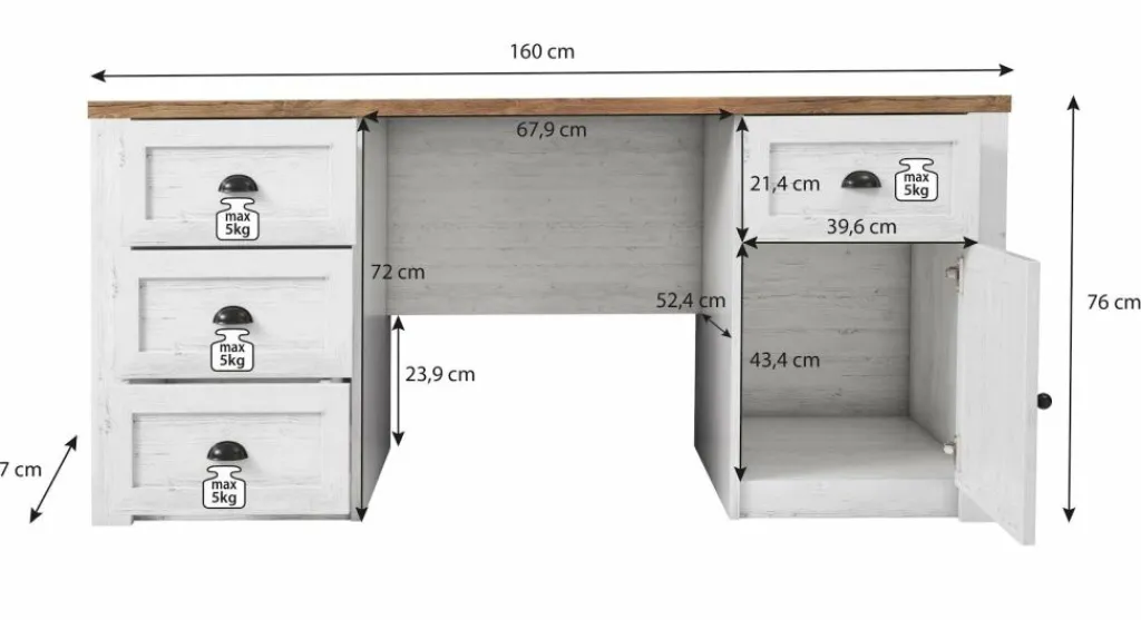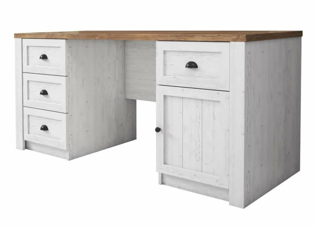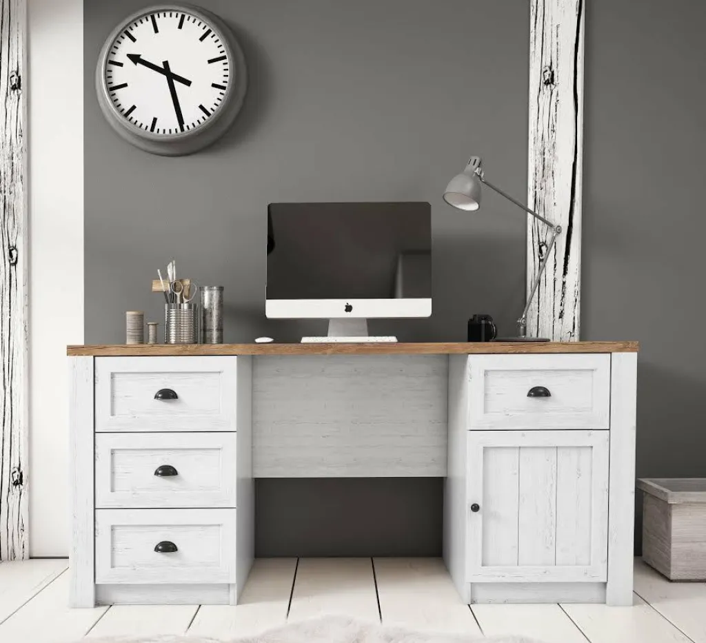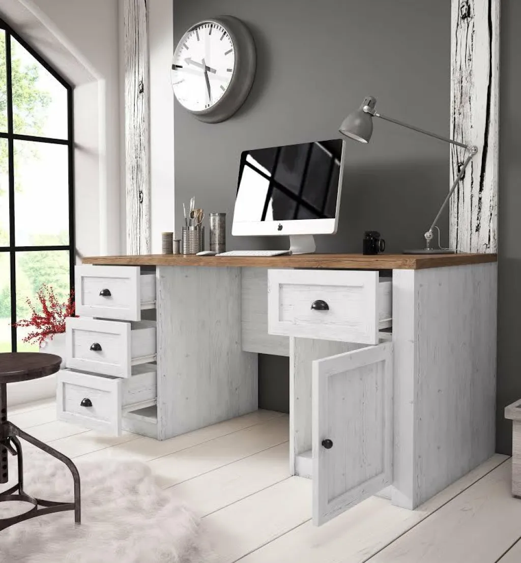 Bureau Parello is een werkplek uitgevoerd in een landelijke stijl met ruim voldoende opbergruimte. De gehele kast is uitgevoerd in een zogenoemde ‘whitewash’ kleur met licht eiken details. Om het plaatje compleet te maken zijn de handgrepen afgewerkt met een zwarte kleur. Dit meubel is praktisch ingedeeld; tot je beschikking zijn 3 lades aan de linkerkant, een lade plus een deur met daarachter 2 schappen aan de rechterkant. Bureau Parello is onderdeel van een uitgebreid woonprogramma waarmee je een compleet nieuwe sfeer in huis kan creëren.