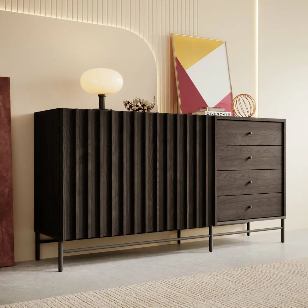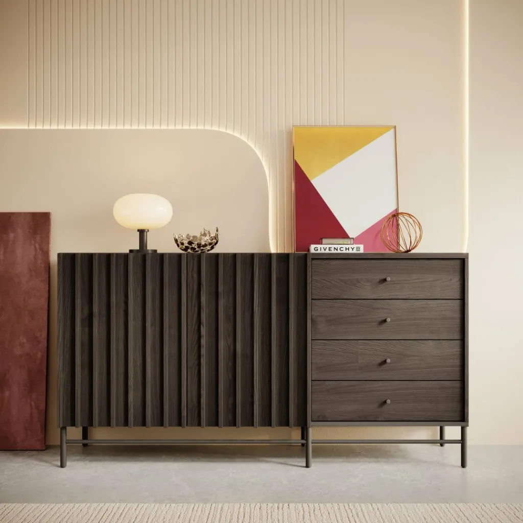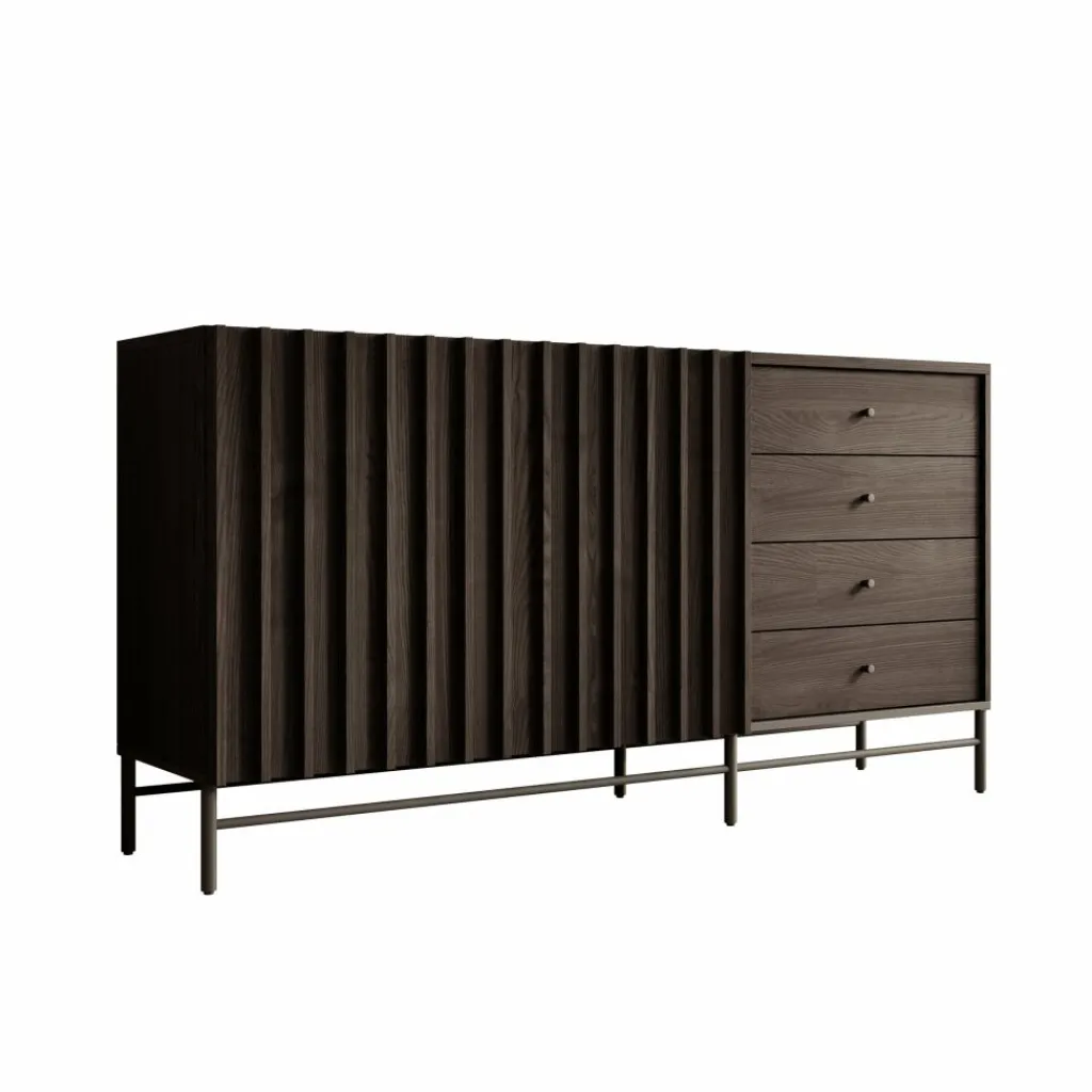 De kast heeft 2 deuren en 4 lades. De deuren openen via verticale grepen en de lades met knoppen. Achter de deuren zitten 4 opbergvakken. Op de voorkant van de deuren zitten latten.