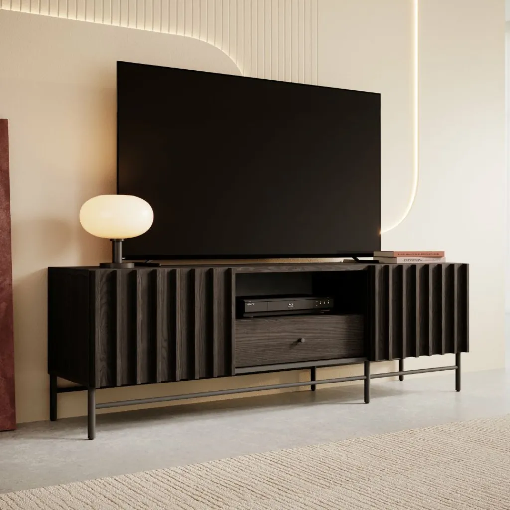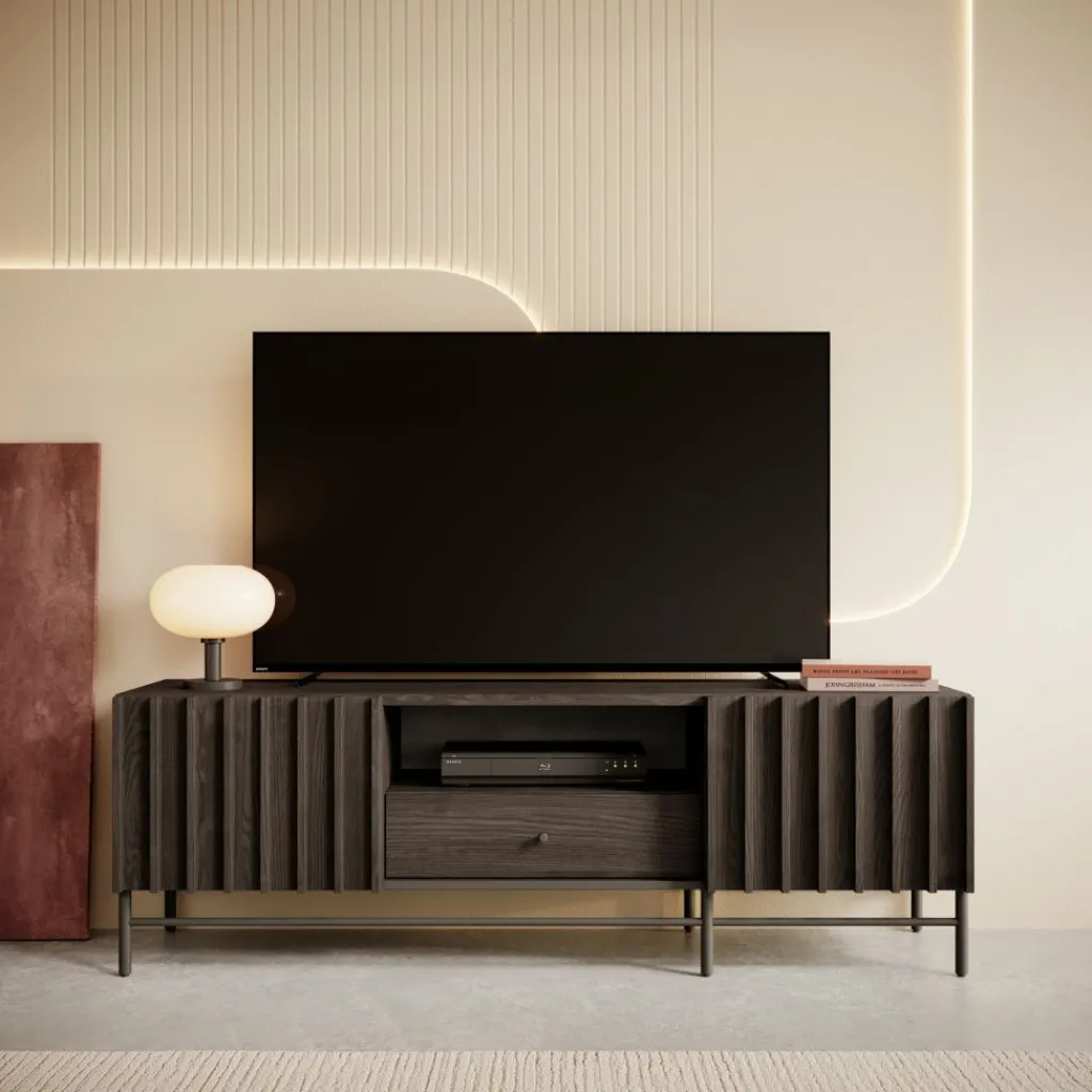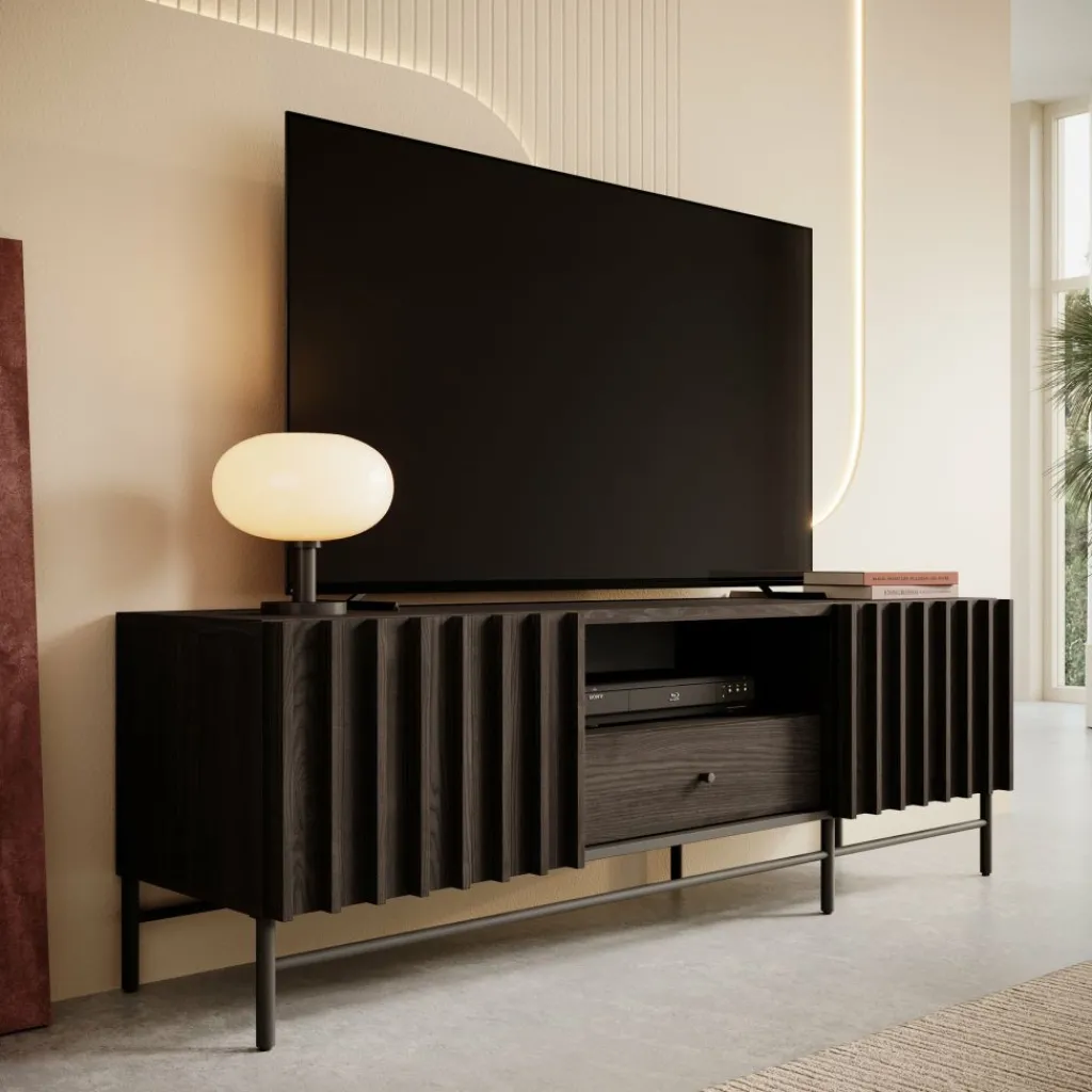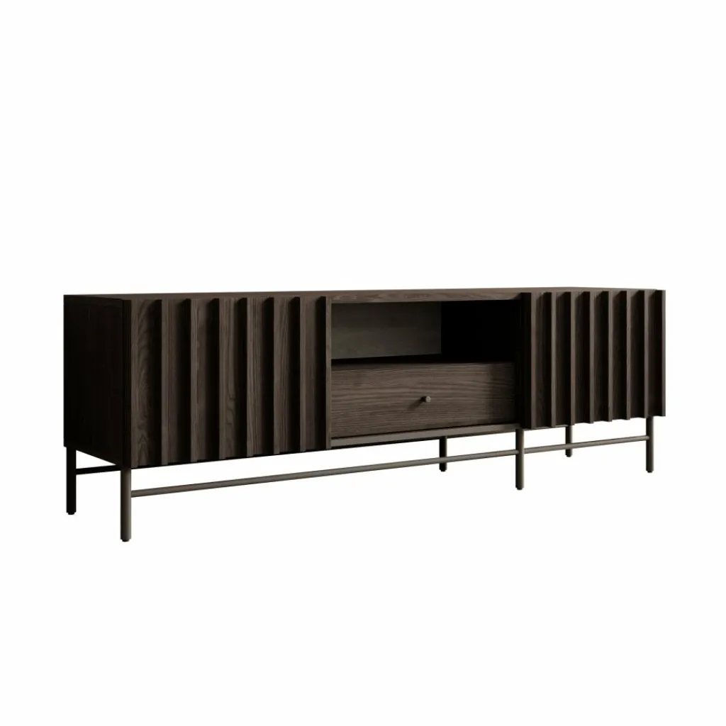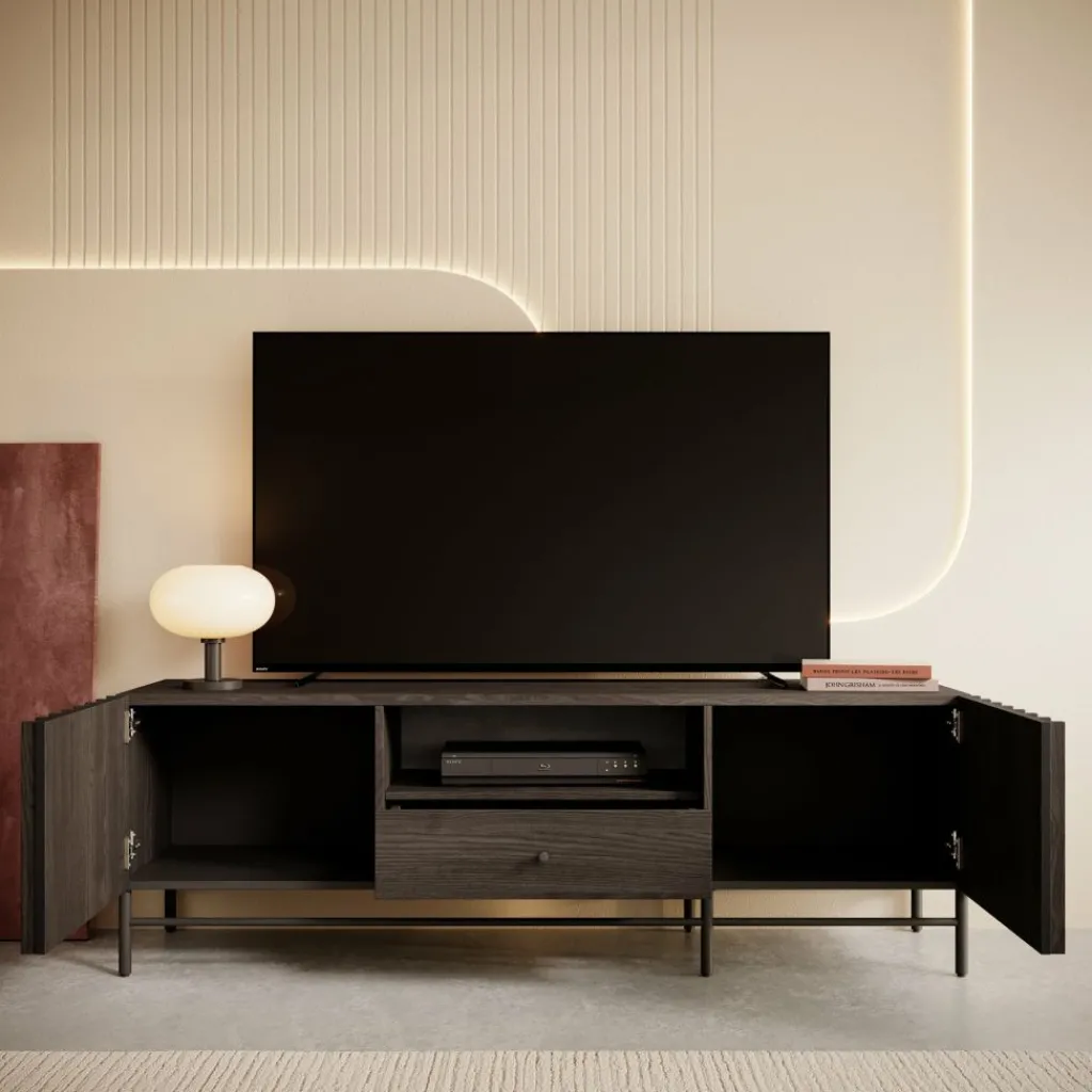 De Paz heeft 2 deuren die openen met verticale grepen. Daarachter bevindt zich een groot opbergvak. Op de voorkant van de deuren zitten latten. In het midden zit een open vak met daaronder een lade. Het tv-meubel staat op hoge pootjes.