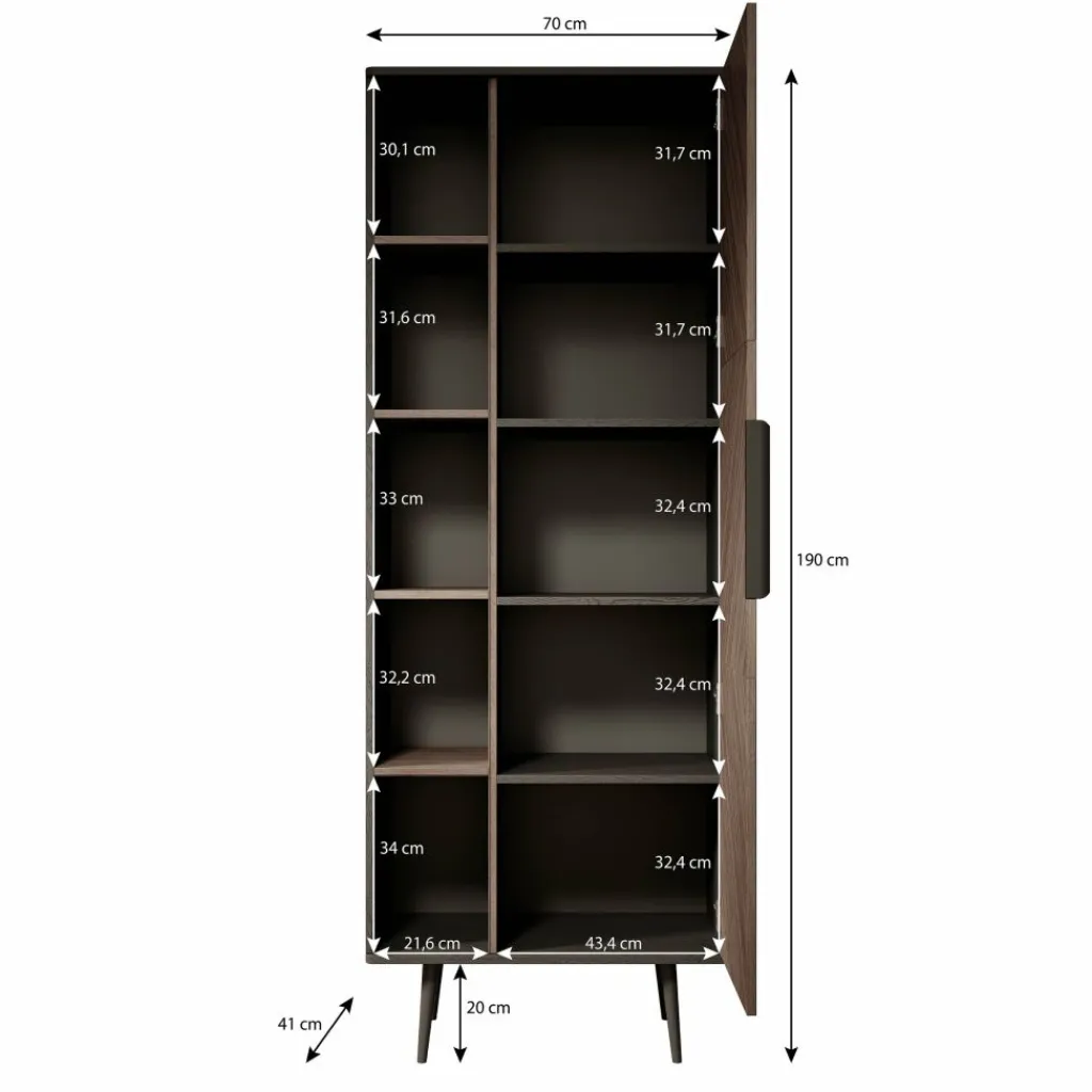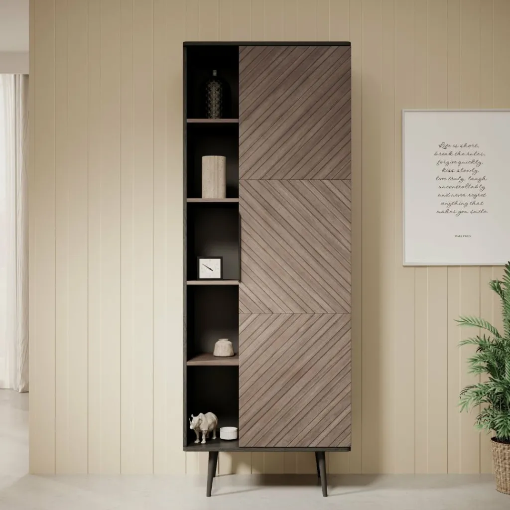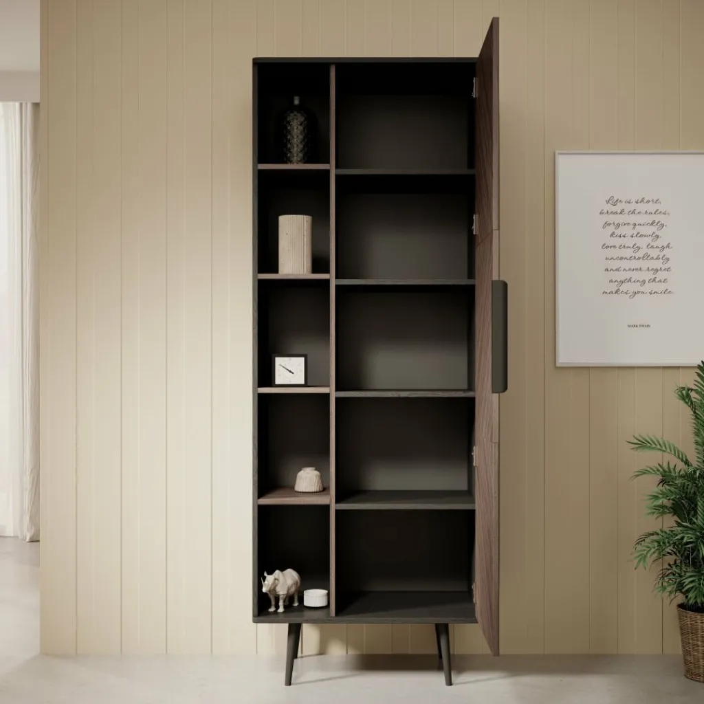De boekenkast heeft 1 deur die opent met een zwarte handgreep waarachter 5 opbergvakken zitten. Naast de deur bevinden zich nog eens 5 open vakken.