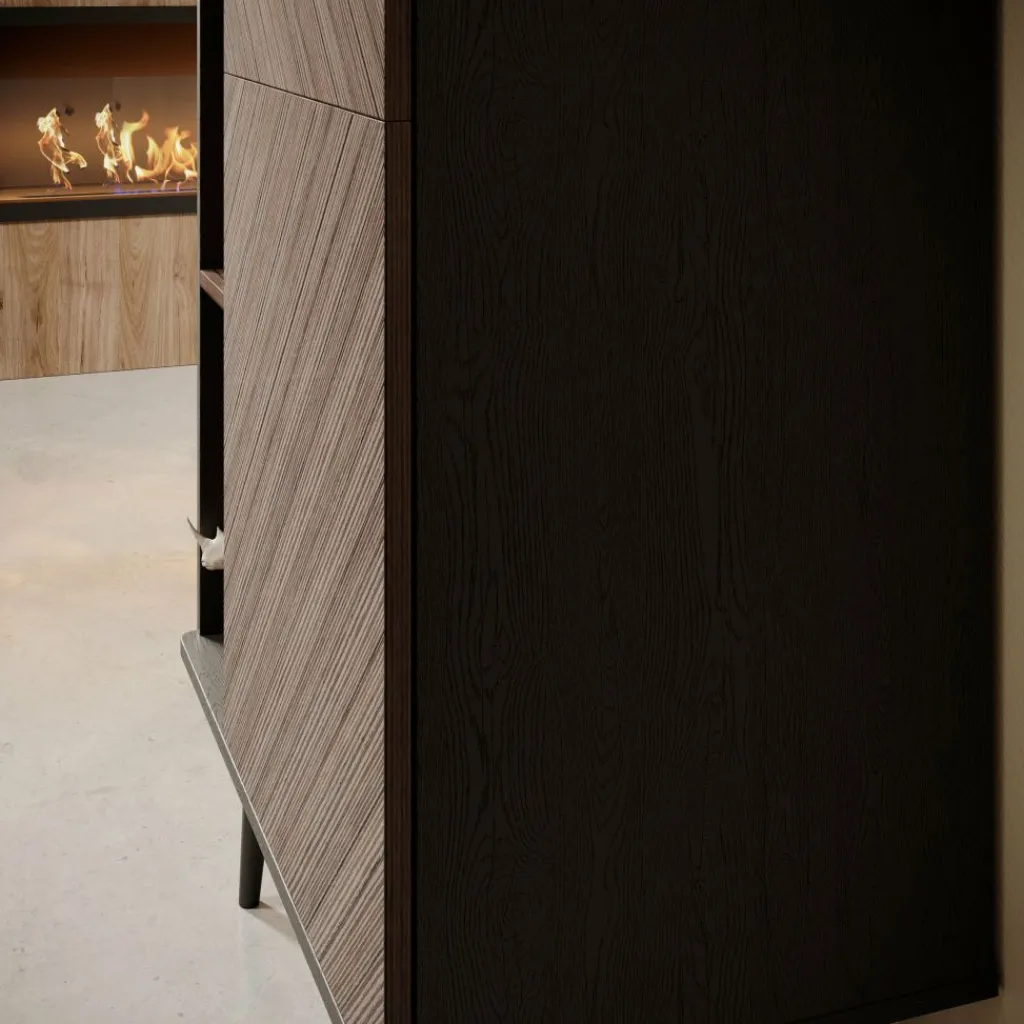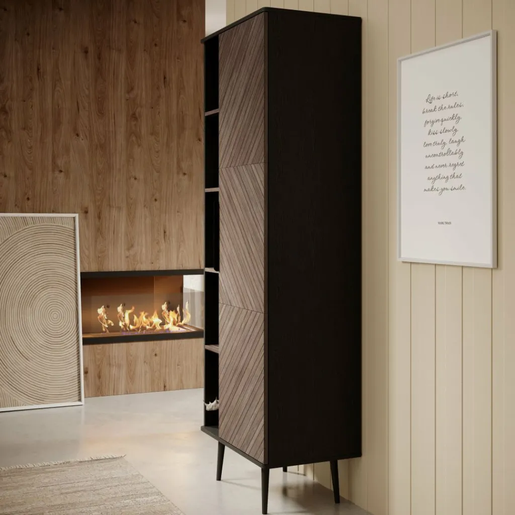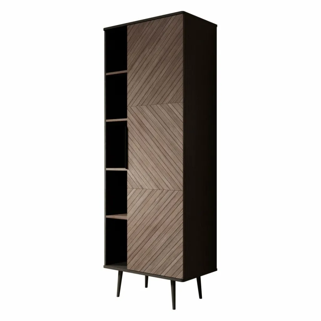 De boekenkast heeft 1 deur die opent met een zwarte handgreep waarachter 5 opbergvakken zitten. Naast de deur bevinden zich nog eens 5 open vakken.